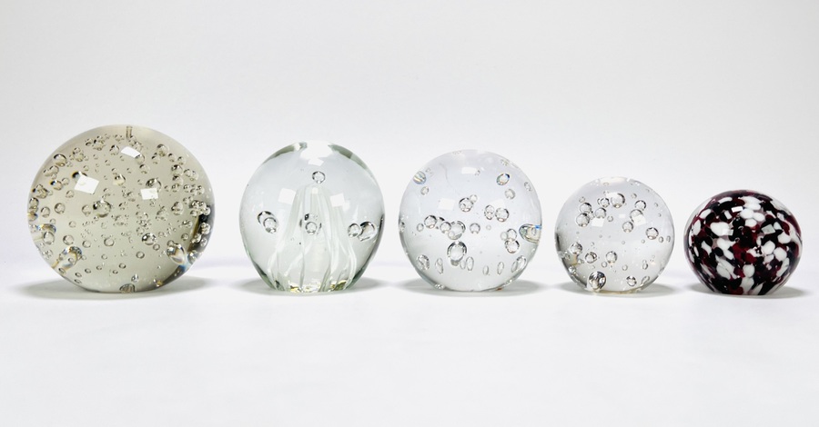 Vijf glazen presse-papiers, circa 1950–2000. Massief helder glas, warm gevormd en afgewerkt met geslepen voet. Drie exemplaren met gecontroleerde luchtbelvelden (bullicante), waarvan twee met amberkleurige kern; één met ingesloten witte filaments als ‘kwalletje’; één met rood-wit-zwarte fritinsluitsels.