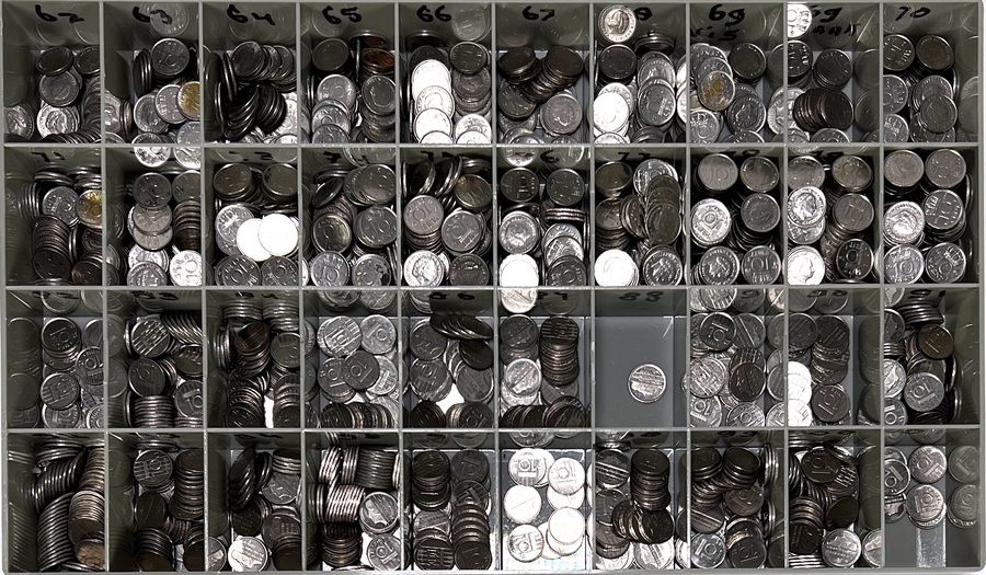 Partij Nederlandse dubbeltjes, Koninklijke Nederlandse Munt (Utrecht), 1962–2001. Nikkel, machinaal geslagen met gekartelde rand. In kunststof sorteerbak per jaargang geëtiketteerd. Twee ontwerptypen: Juliana- en Beatrix-uitgiften; keerzijde met denominatie ‘10 c’ en jaartallen 1962–2001 onder.