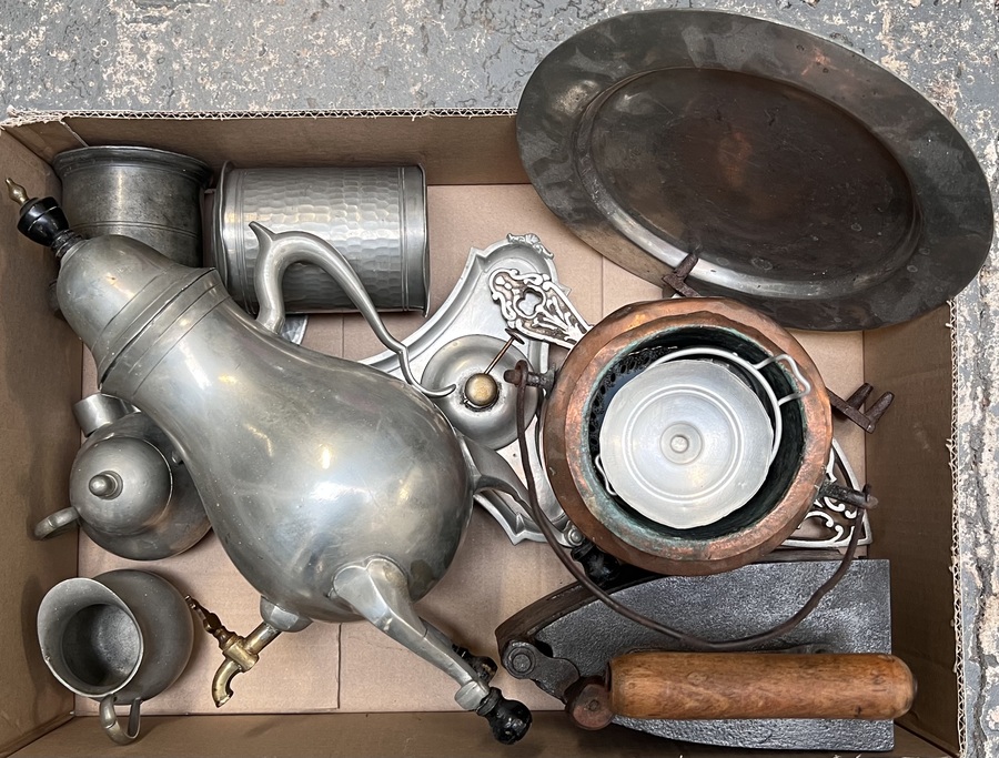 Lot curiosa, gemaakt van verschillende materialen, waaronder tin, ijzer, koper en hout. De verzameling omvat een theepot van tin, twee tinnen kannen, een tinnen schotel, een strijkijzer en een sierlijk, zilverkleurig metalen decoratief element. 20e eeuw.