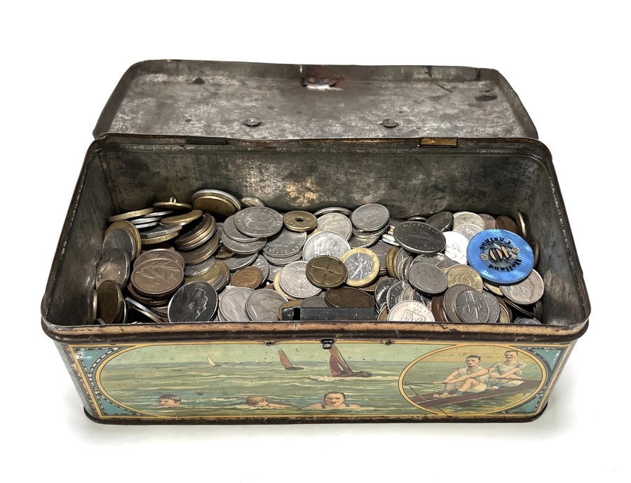 1183. Blikken lunchtrommel met sport illustraties, gevuld met diverse munten, ca. 20e eeuw