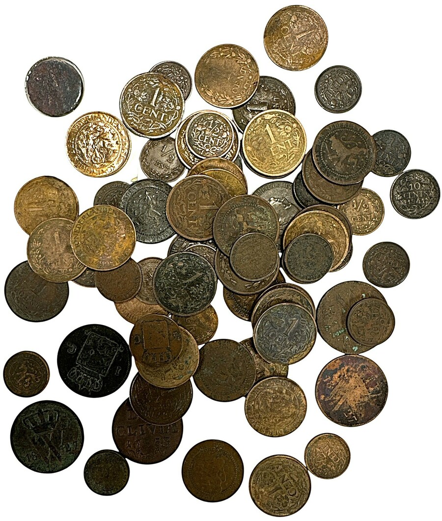 Circa zestig Nederlandse circulatiemunten vervaardigd door de Rijksmunt Utrecht, daterend van eind 19e tot midden 20e eeuw. Uitgevoerd in koper, brons, koper-nikkel en zink met stempelslagtechniek. Mix van verschillende munten waaronder halve en hele centen, 2½ cent, stuivers, dubbeltjes en enkele guldens. Voorzijden met portretten van Willem III, Wilhelmina of Juliana, keerzijden met waarde aanduidingen en kransmotieven.