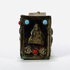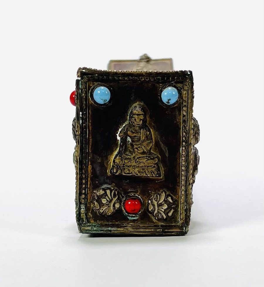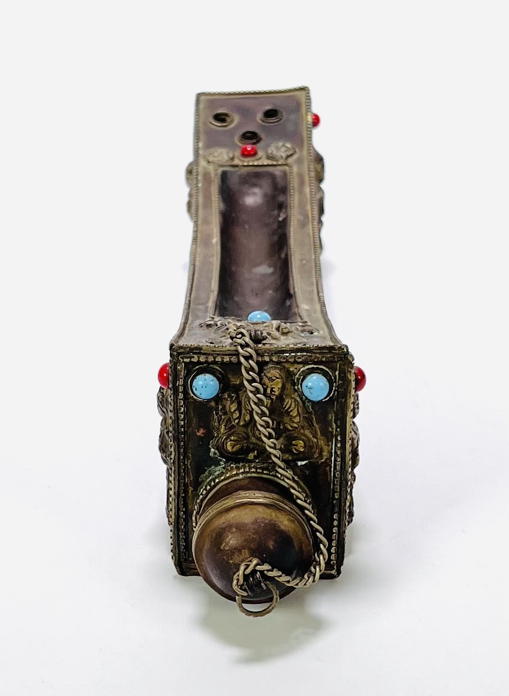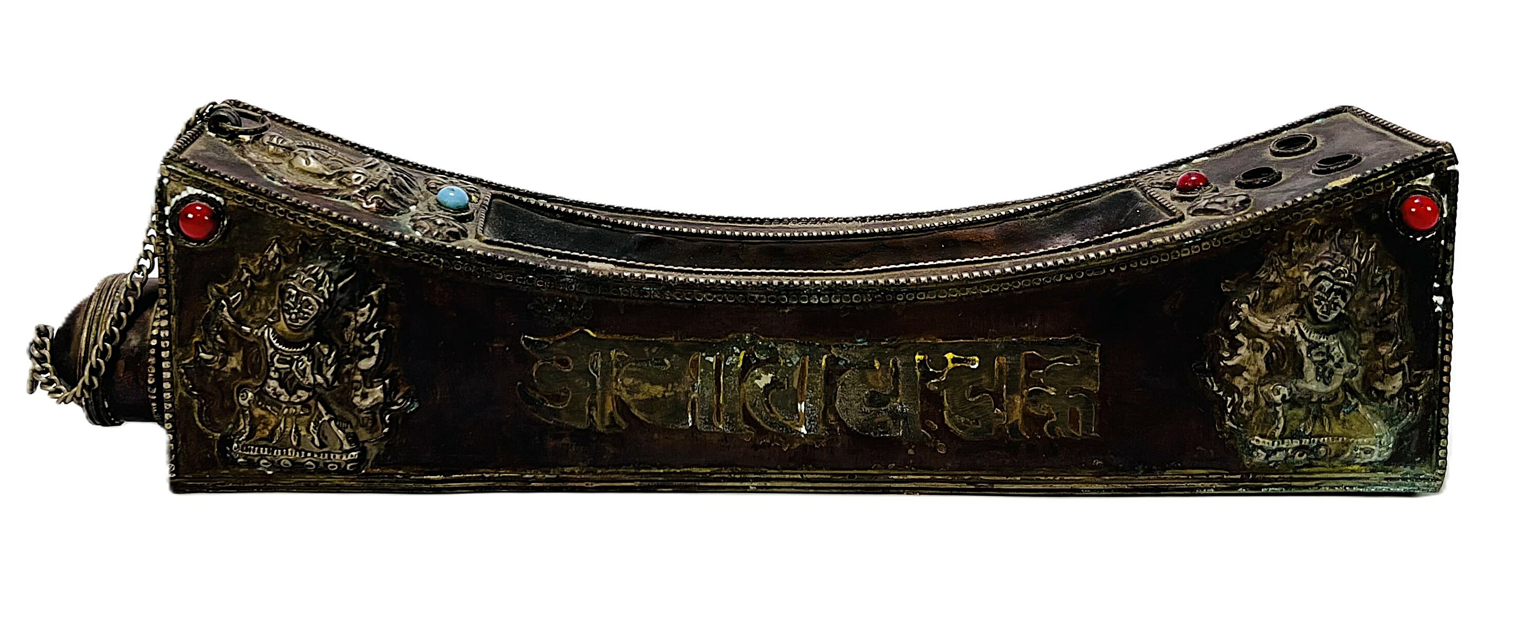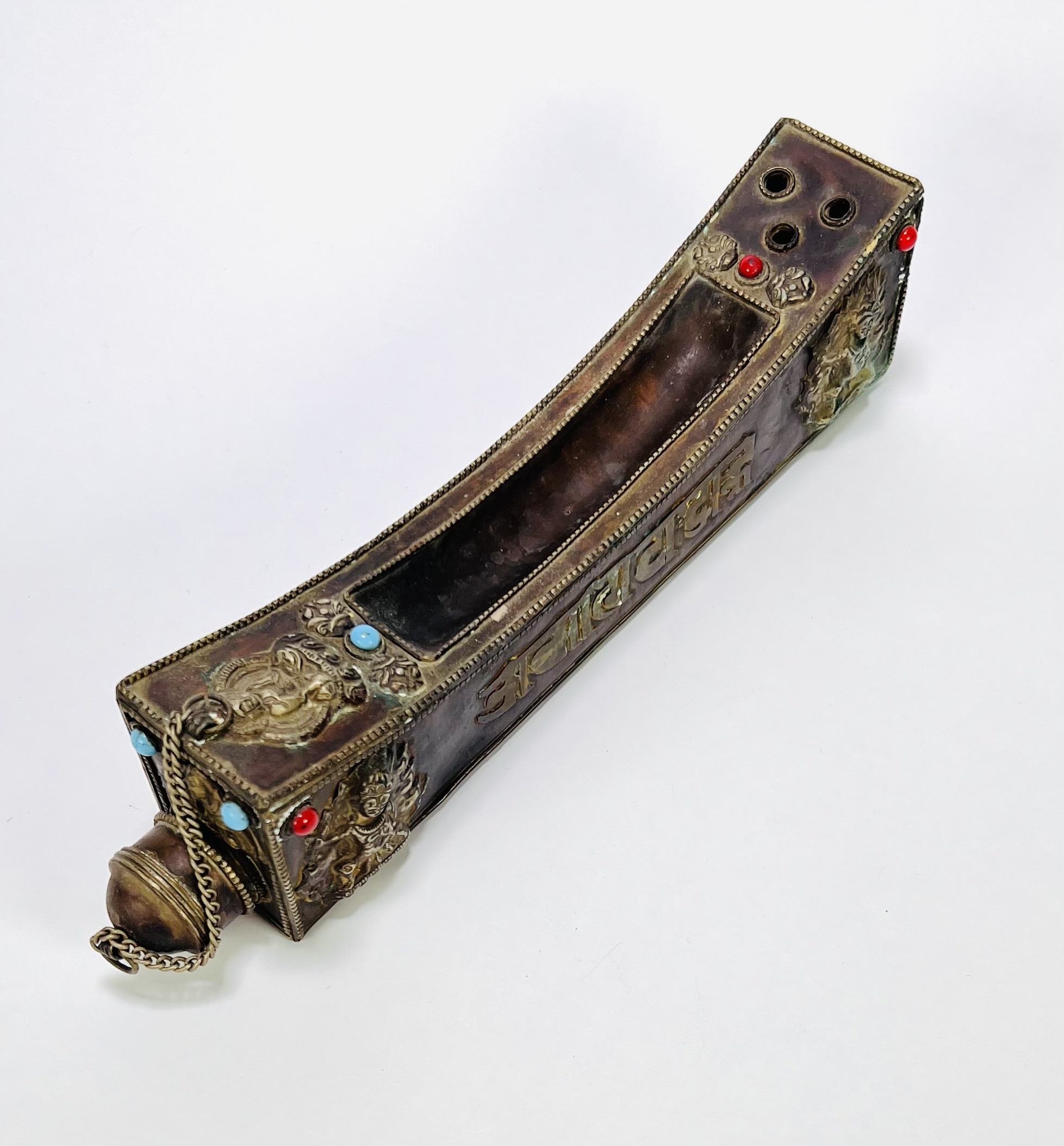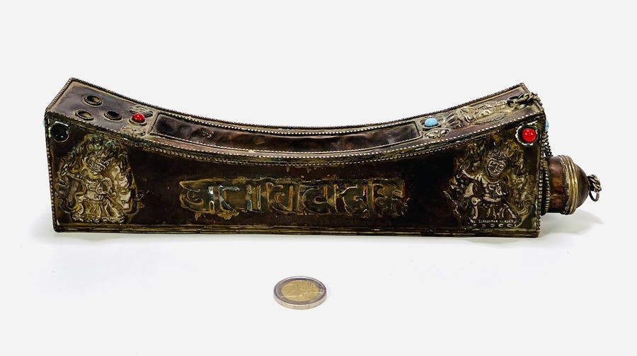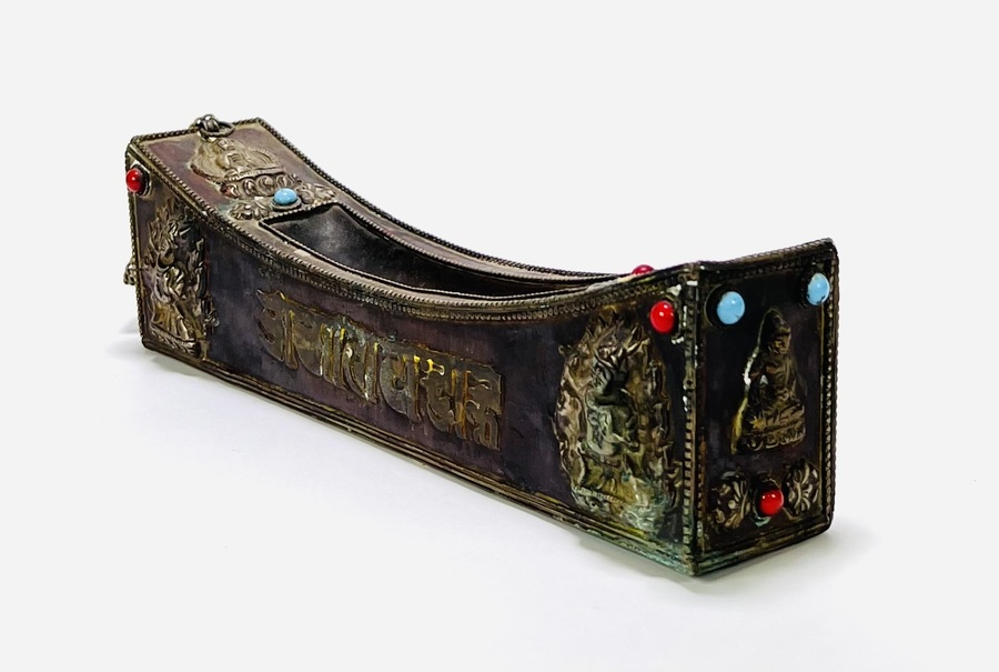 Tibetaanse wierookbrander van messing, 20e eeuw, rechthoekig gebogen vorm met reliëfdecoraties van boeddhistische figuren en beschermgoden met ingelegde rode en blauwe cabochonstenen, Tibetaans schrift en openingen aan de bovenzijde voor wierookstokjes. De randen zijn voorzien van parelrandversieringen en de voorzijde heeft een afsluitbare dop met ketting. Voeg deze wierookbrander toe aan je verzameling en doe een bod! |