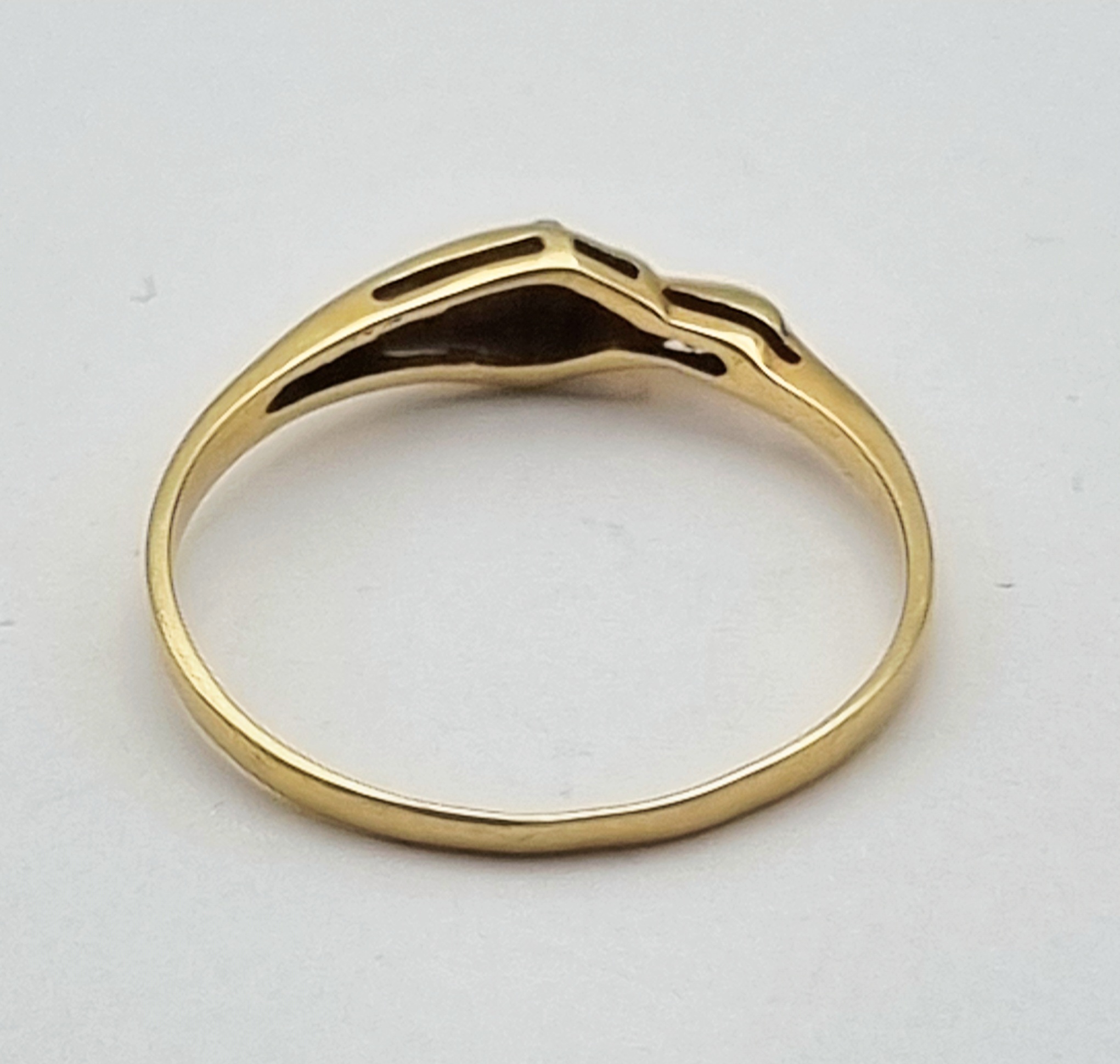 Gouden ring, tweede helft 20e eeuw. De ring is uitgevoerd in 14 karaat geelgoud, binnenzijde gemerkt 585, en is voorzien van twee kleine diamantjes. Het ontwerp toont een bladachtig motief met subtiele opengewerkte details en een smalle, gepolijste band. Wil je direct deelnemen? Plaats alvast een schriftelijk bod via onze website! |
