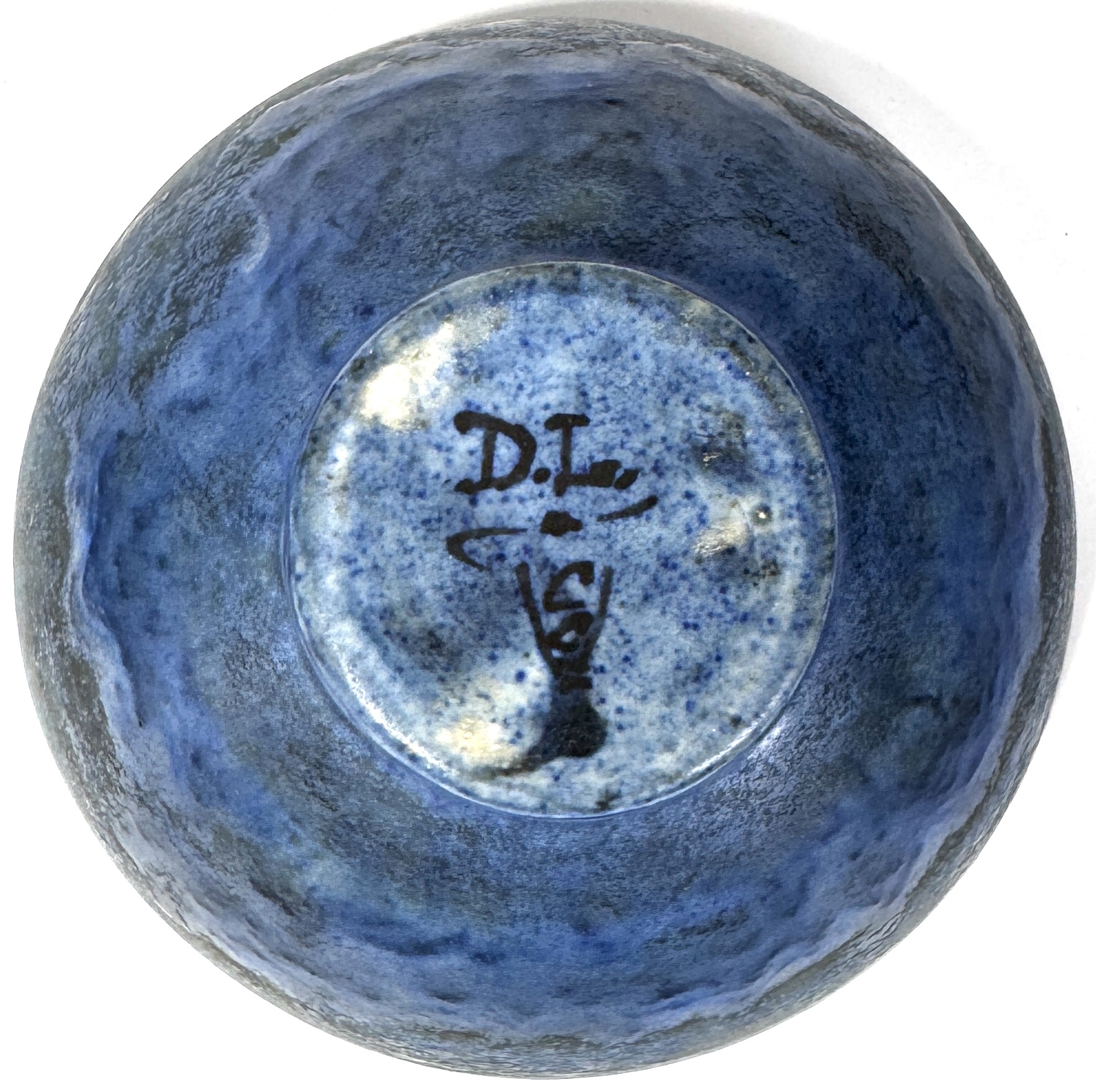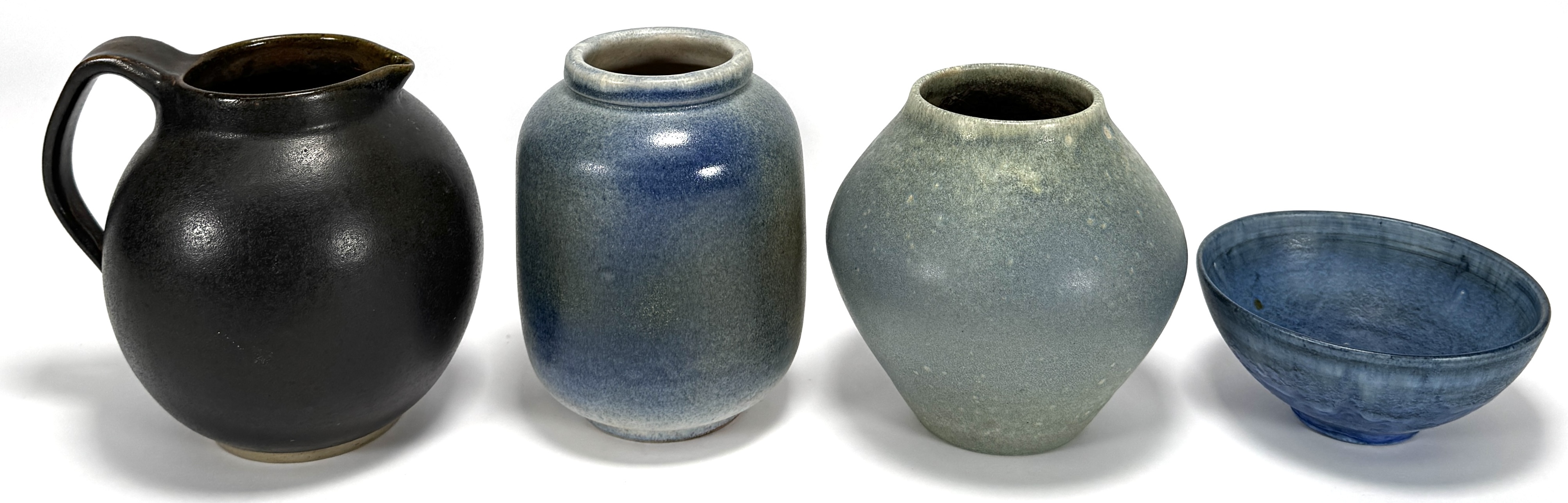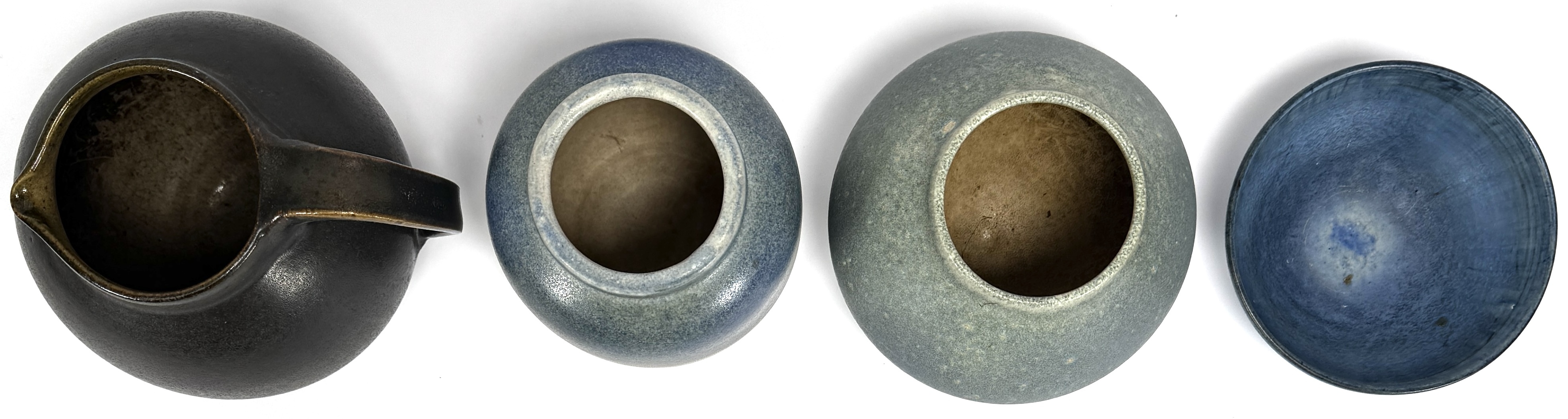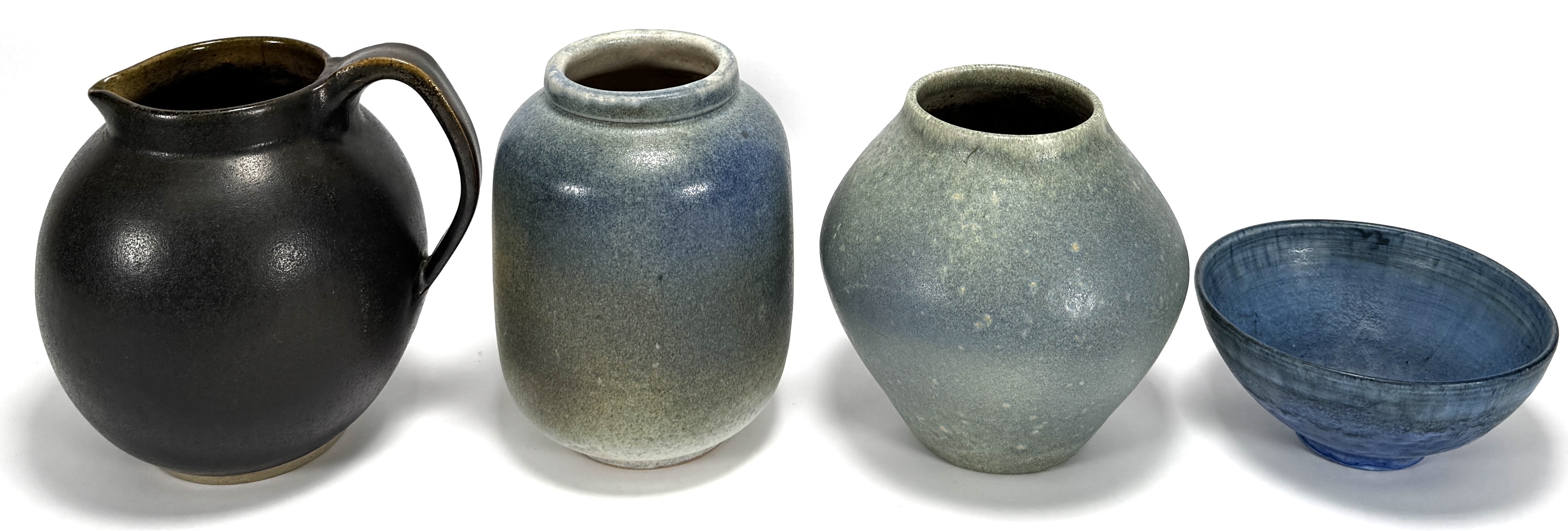 Vier steengoed keramische objecten bestaande uit een schenkkan, twee vazen en een schaal, uitgevoerd in modernistische stijl, tweede helft 20e eeuw. De objecten tonen glazuren in blauw, grijs en zwart met zachte kleurverlopen. Onderzijde van de schaal gesigneerd met “D.I.” en monogram, diverse merken en stempels op de andere stukken. Geïnteresseerd? Bezoek onze kijkdagen op 29, 30 of 31 augustus van 11:00 tot 17:00 uur! |