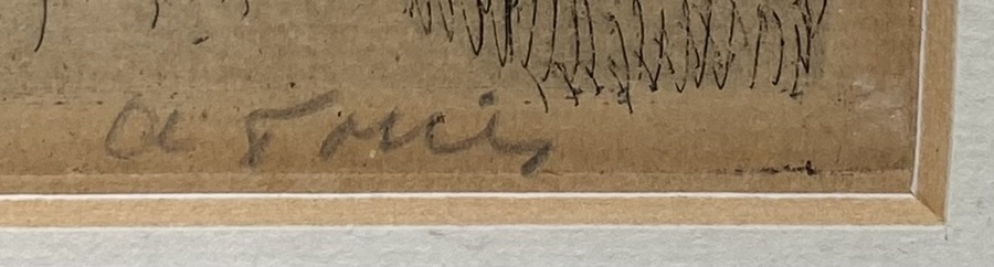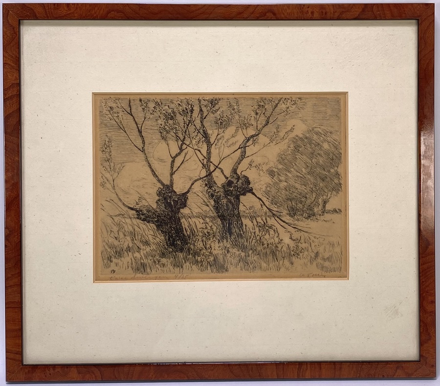 Ets op papier van Albert Torie (1896–1969), omstreeks midden 20e eeuw, naturalistisch weergegeven met twee knotwilgen in een Hollands landschap. Het werk is rechtsonder met potlood gesigneerd, linksonder onduidelijk getiteld en met oplage 4/25. Geplaatst in een brede crèmekleurige passe-partout met houten lijst. Kom langs tijdens de kijkdagen (29 t/m 31 augustus) en ontdek de ets zelf! |