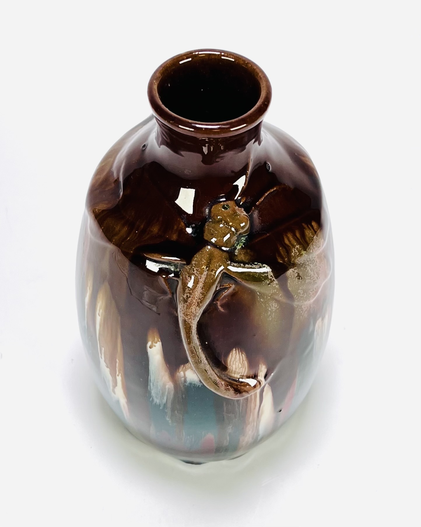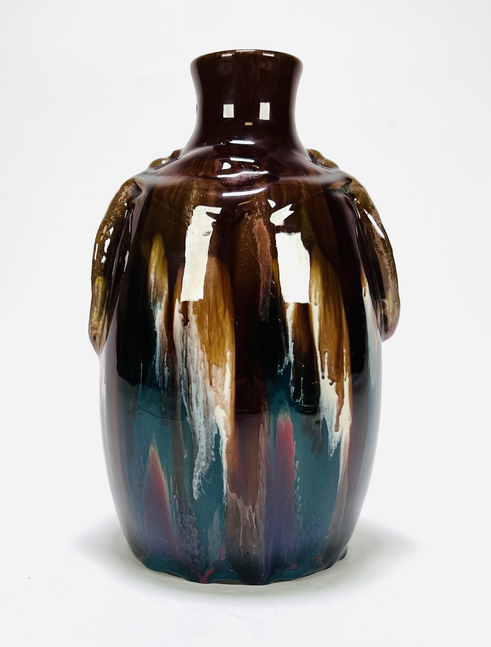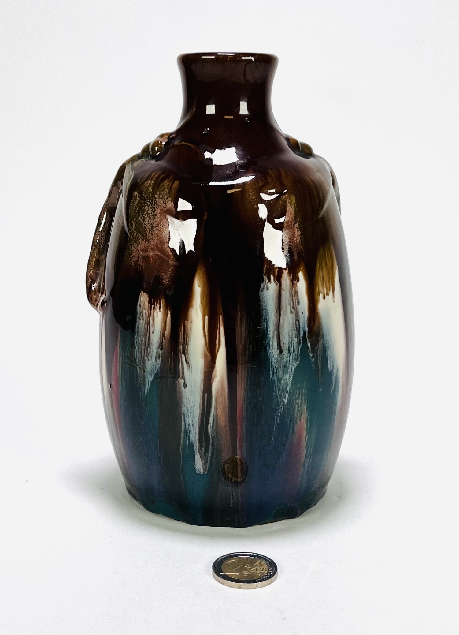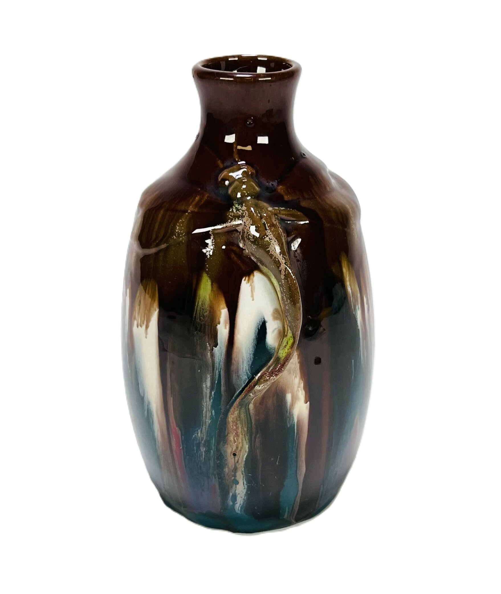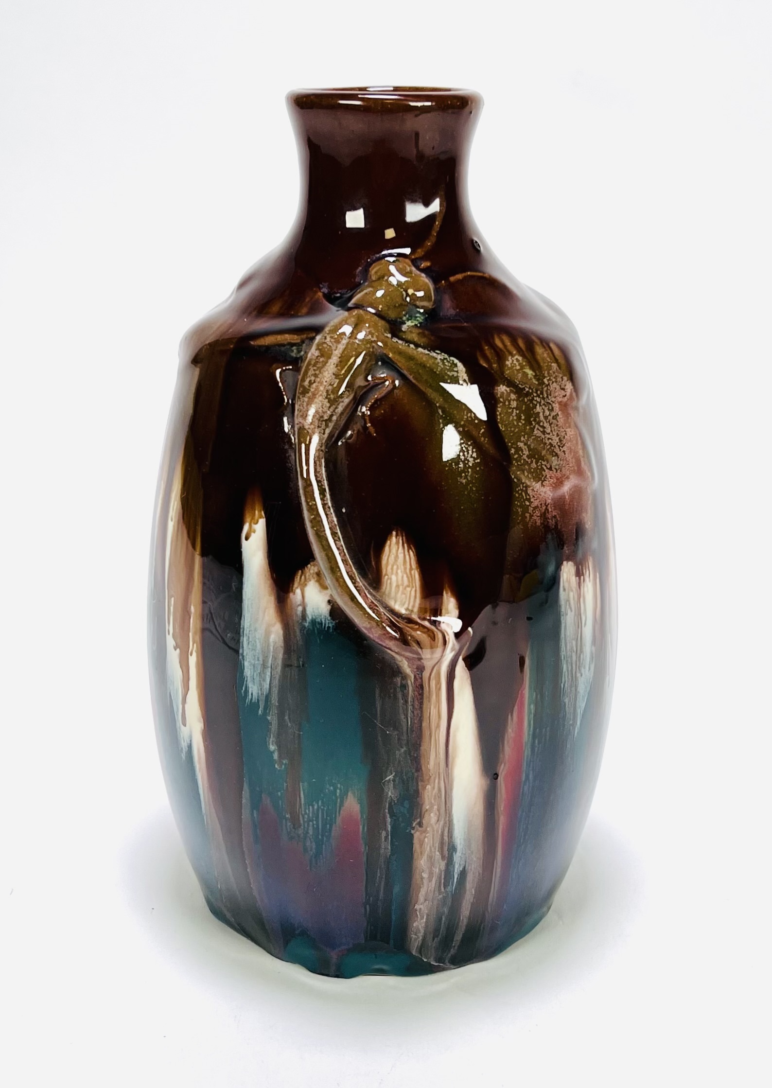 Art Nouveau vaas, België circa 1900–1910, uitgevoerd in keramiek met gedraaide vorm en meerkleurig druipglazuur in bruin-, groen- en blauwtinten met gestileerde libellen aan beide zijden, in reliëf uitgewerkt. Onderzijde gemerkt met het nummer “54”. Dit object zelf beoordelen? Je bent welkom op onze kijkdagen op 29, 30 en 31 augustus! |