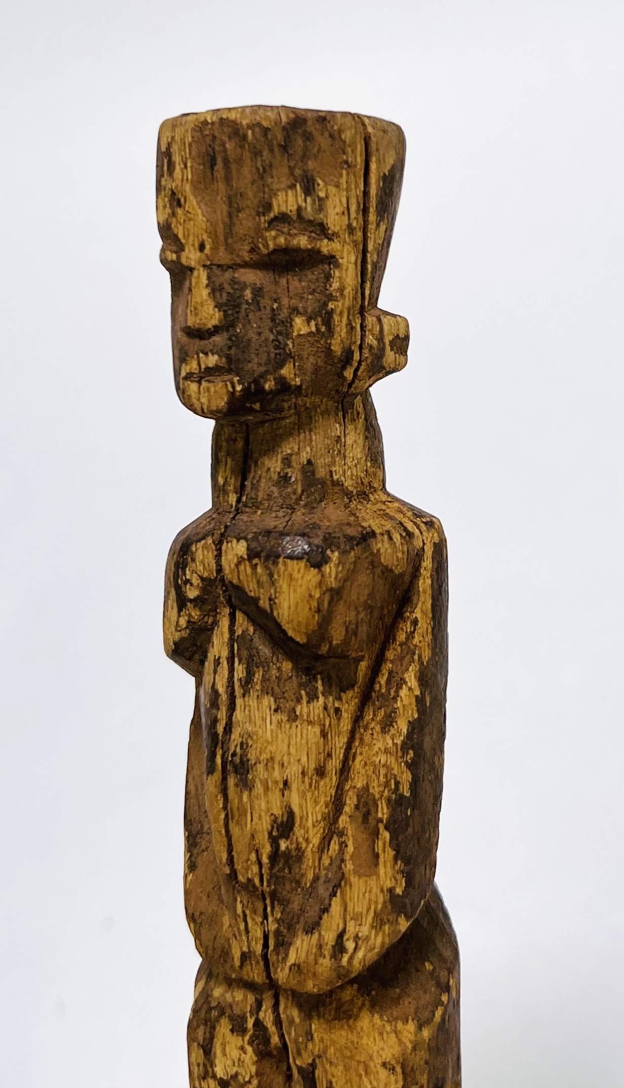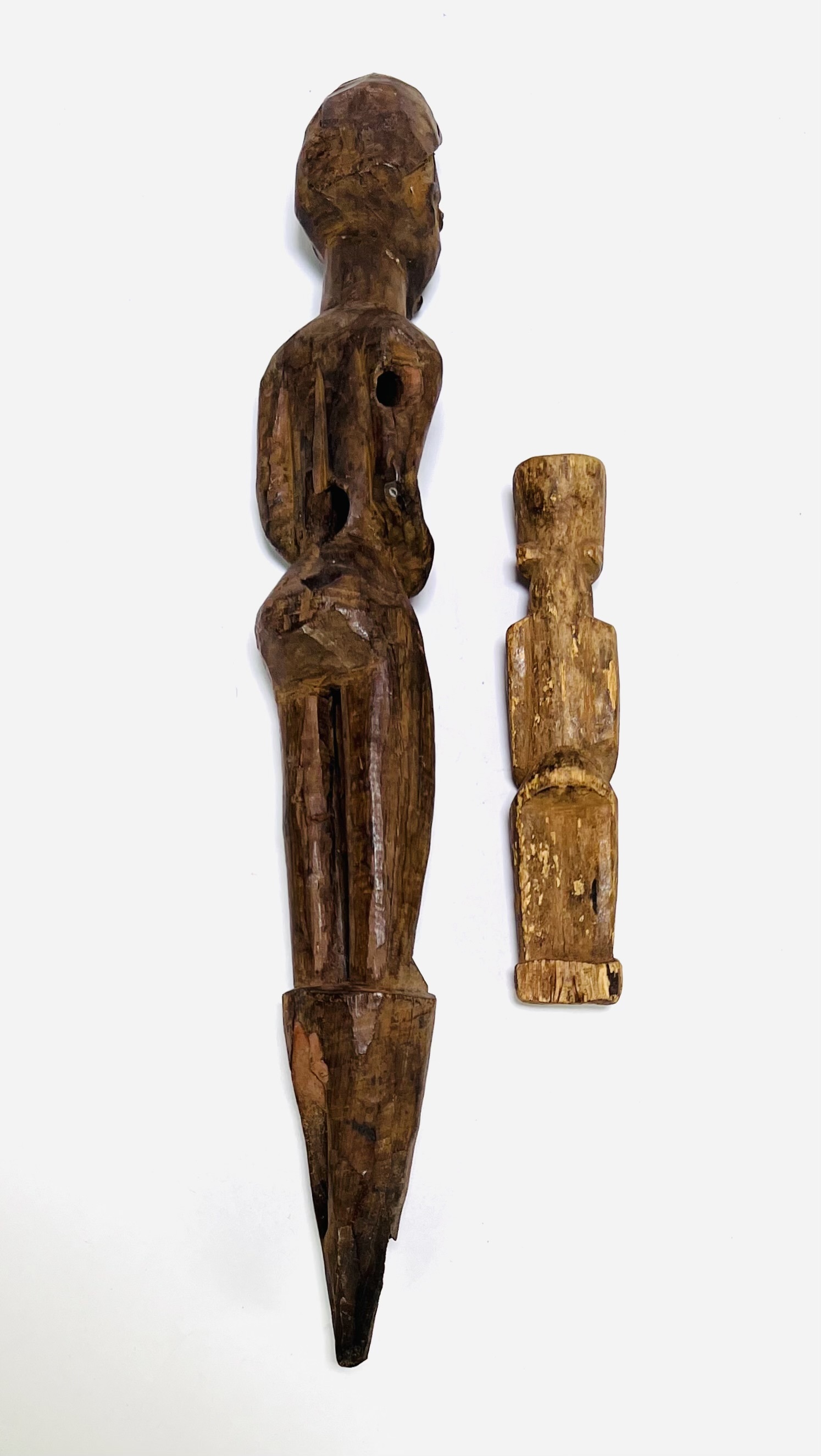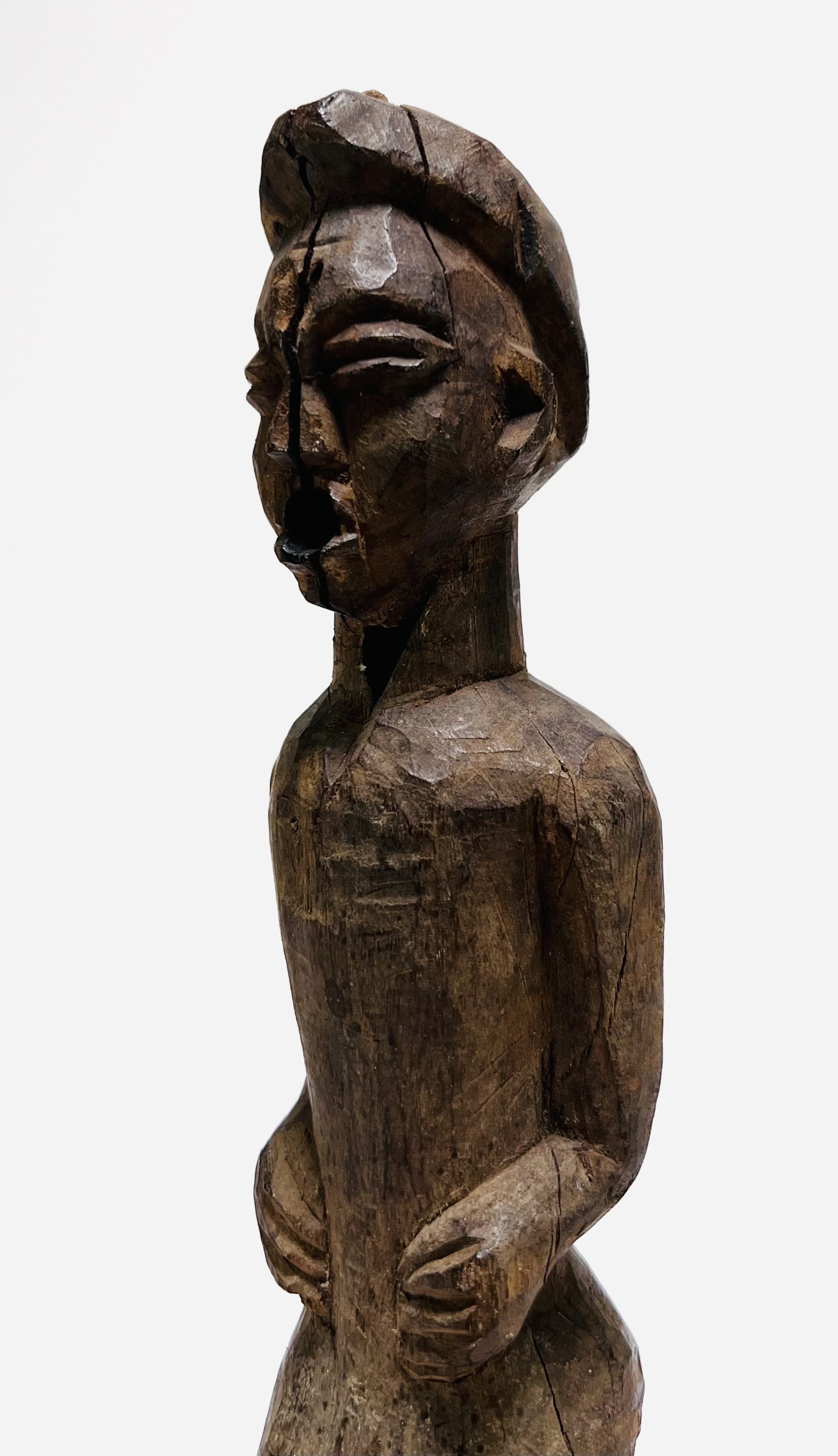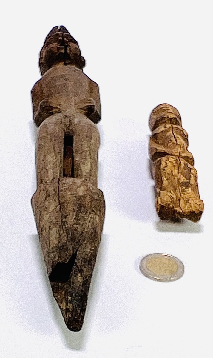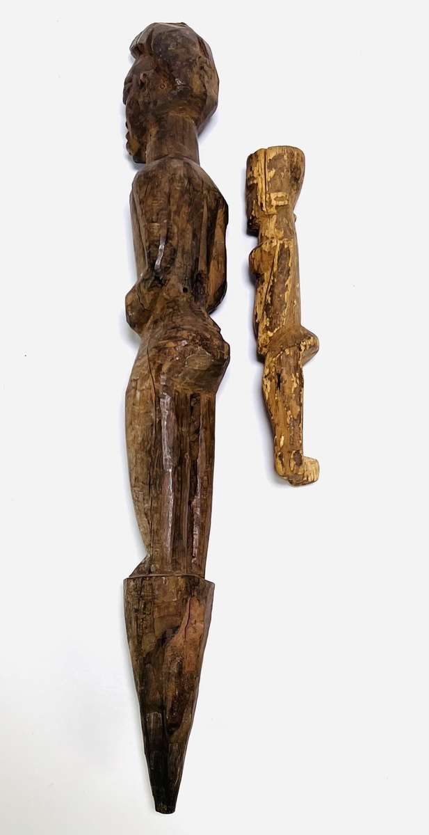 Twee houten beeldjes in traditionele Fon-stijl, eind 19e tot begin 20e eeuw, afkomstig uit Togo/Dahomey. Het grotere beeld toont een gestileerde vrouwelijke figuur met open mond en puntige basis, bedoeld voor plaatsing in de grond of een altaar. Het kleinere beeld heeft een blokvormig hoofd en armen tegen de borst, sober uitgevoerd. Handgesneden in hout met duidelijke sporen van ritueel gebruik en veroudering. Geïnteresseerd? Bezoek onze kijkdagen voor een persoonlijke bezichtiging! |