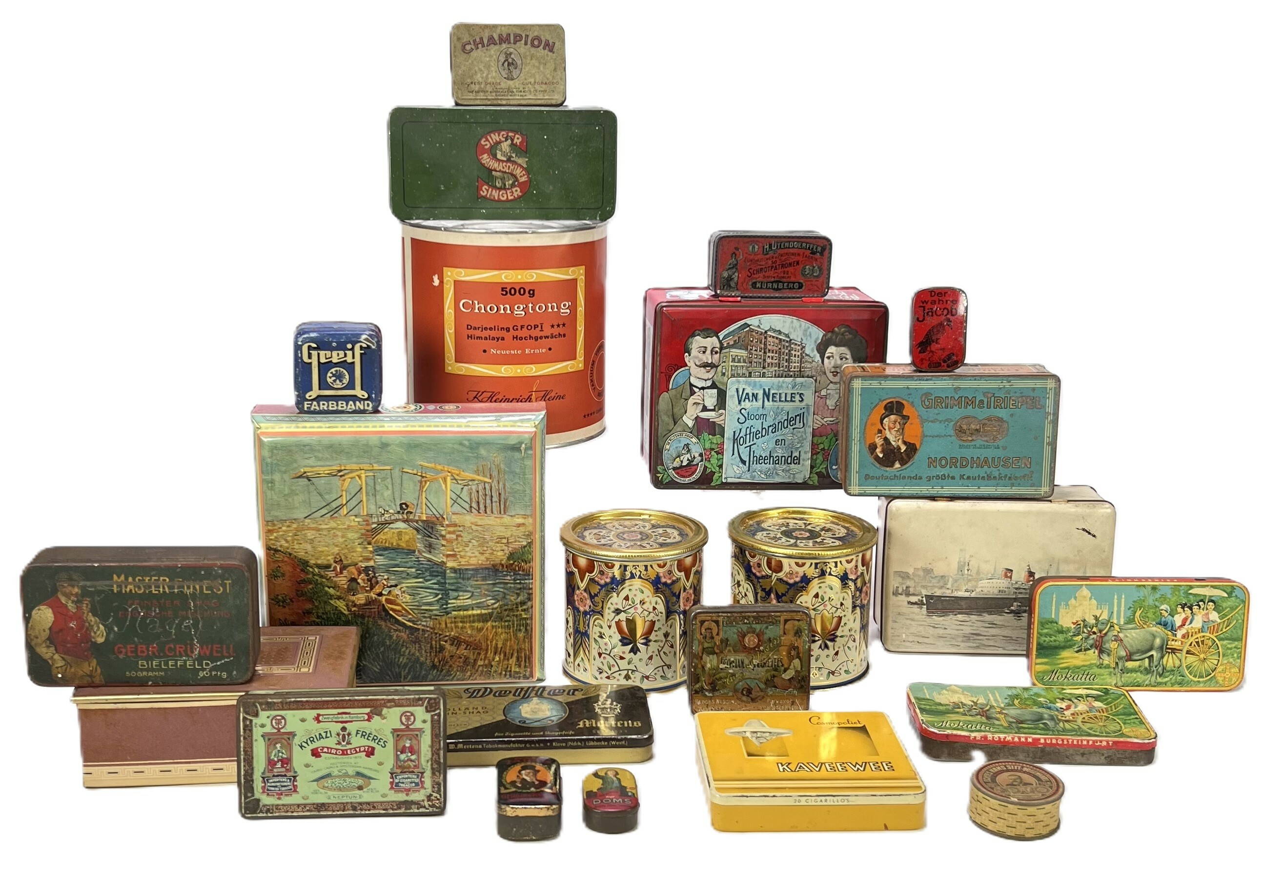 Verzameling van decoratieve en commerciële blikken uit het midden van de 20e eeuw, vervaardigd door diverse producenten waaronder Van Nelle en Singer. De bedrukte en gelakte metalen blikken zijn uitgevoerd in lithografie met kleurrijke typografie, reclamevoorstellingen en ornamentale patronen. Te zien zijn onder meer tabaks-, thee- en koekblikken in verschillende formaten, waaronder exemplaren met exotische afbeeldingen en reclame-opdrukken. Kom langs tijdens de kijkdagen (29 t/m 31 augustus) en ontdek deze blikken zelf! |