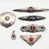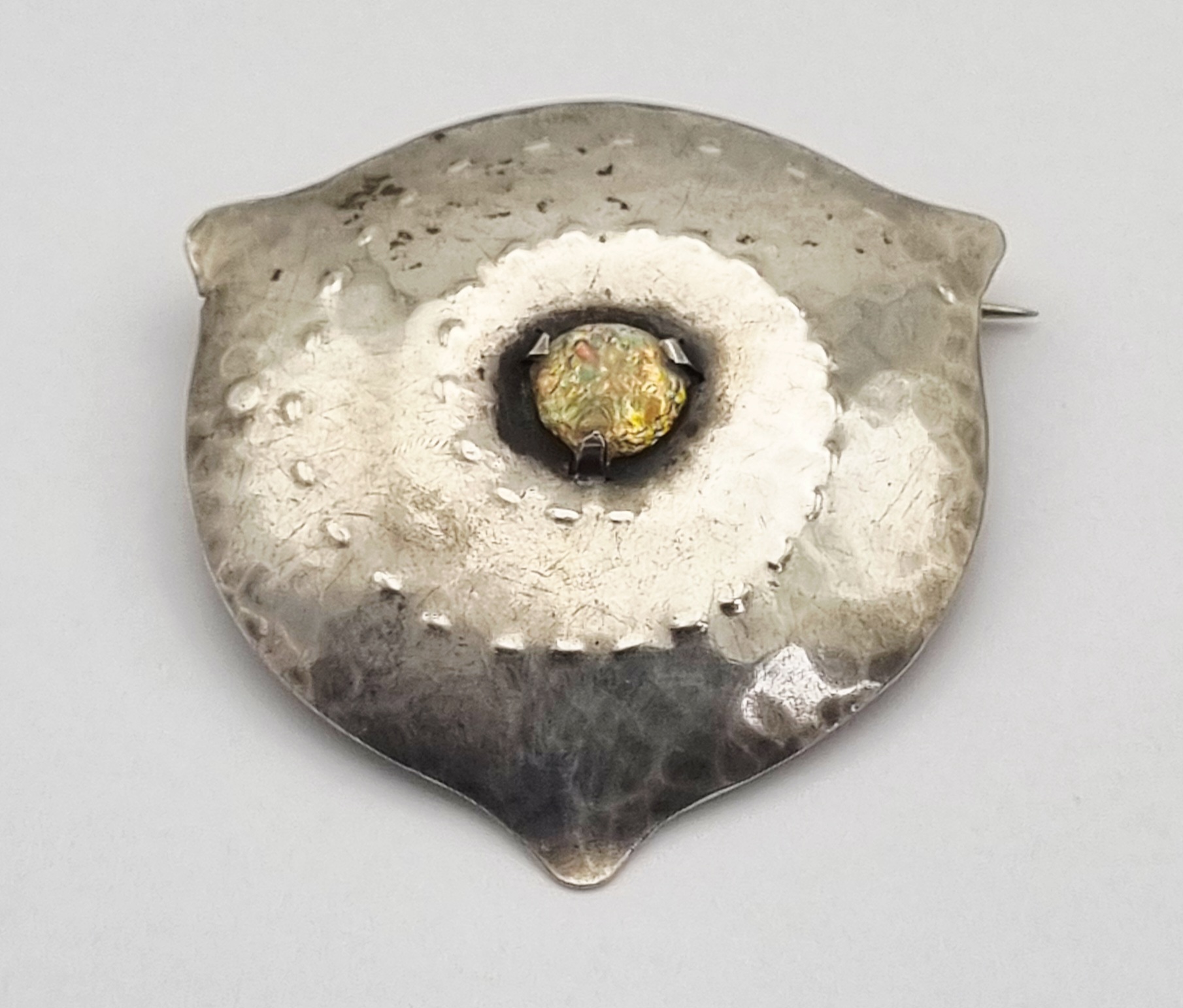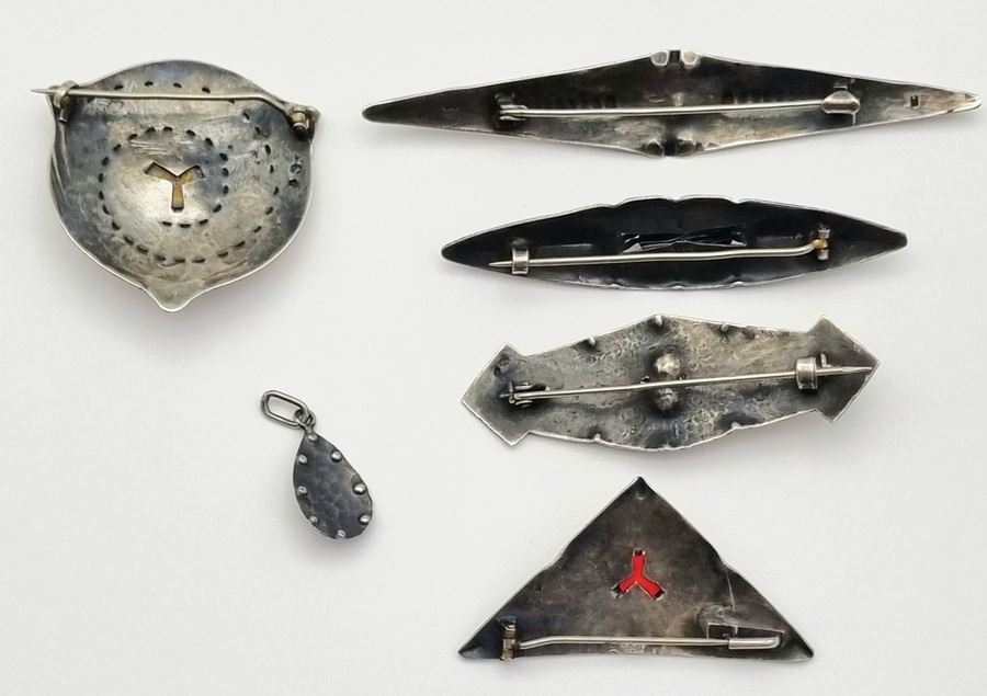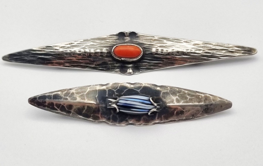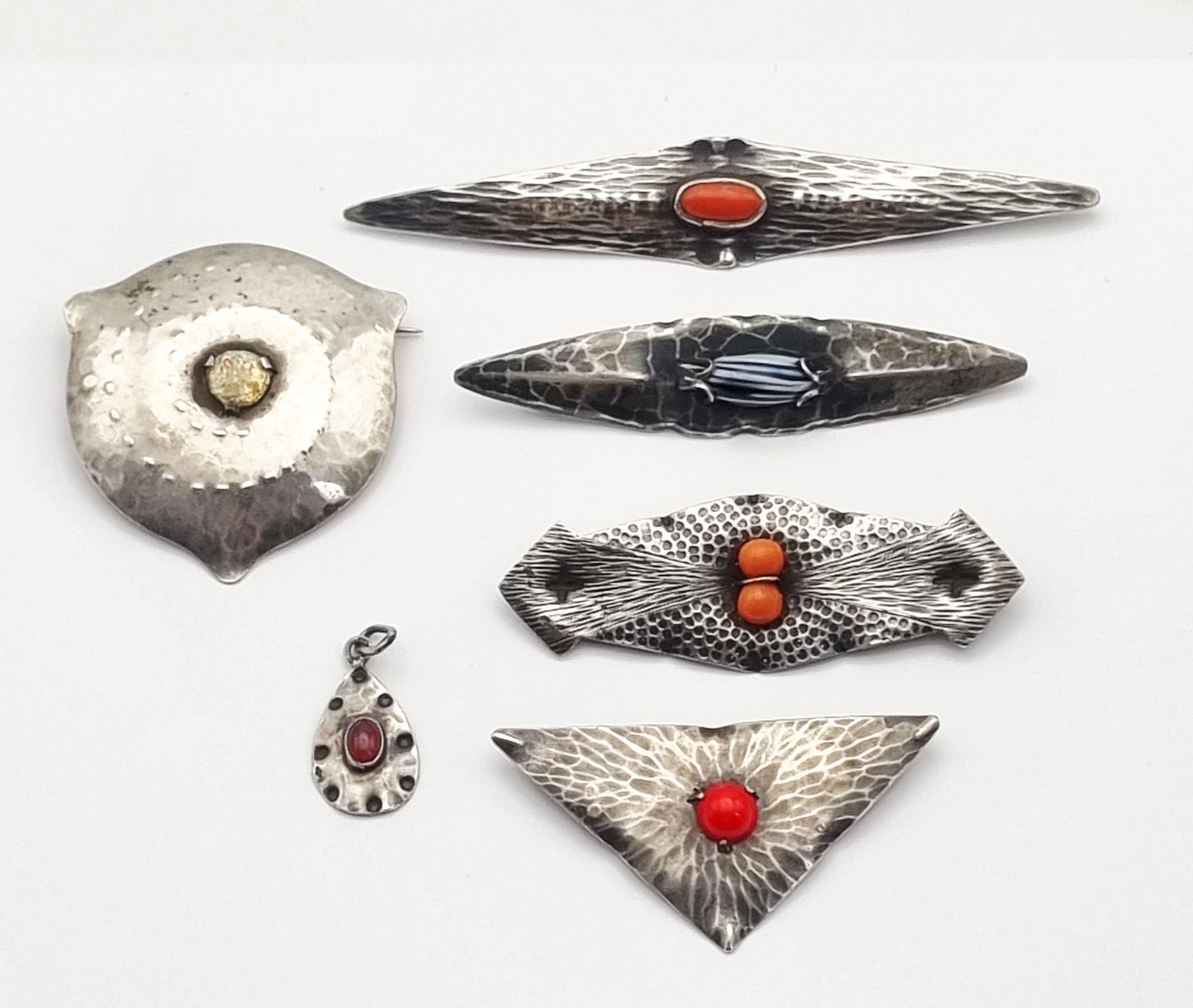Zes Art Deco sieraden bestaande uit vijf zilveren broches en één hanger, eerste helft 20e eeuw. De stukken zijn vervaardigd uit zilver met gehamerde oppervlakken en eenvoudige speldenconstructies. Kenmerkend zijn geometrische en asymmetrische vormen, waaronder driehoekig, ovaal en cirkelvormig, gecombineerd met cabochon- en gefacetteerde stenen. Kom langs tijdens de kijkdagen (29 t/m 31 augustus) en ontdek deze broches zelf! |