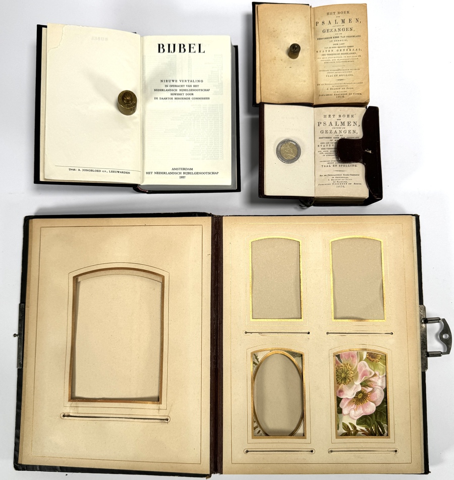 Een verzameling van drie boeken, een Bijbel en twee psalmenboeken, en een Art Nouveau fotoalbum, daterend uit het einde van de 19e en het begin van de 20e eeuw. De psalmenboeken zijn uit 1909 en 1912. De boeken zijn vervaardigd van papier met een lederen of linnen omslag, en het album is gedecoreerd met goudkleurige details. Wil je direct deelnemen? Plaats alvast een schriftelijk bod via onze website! |