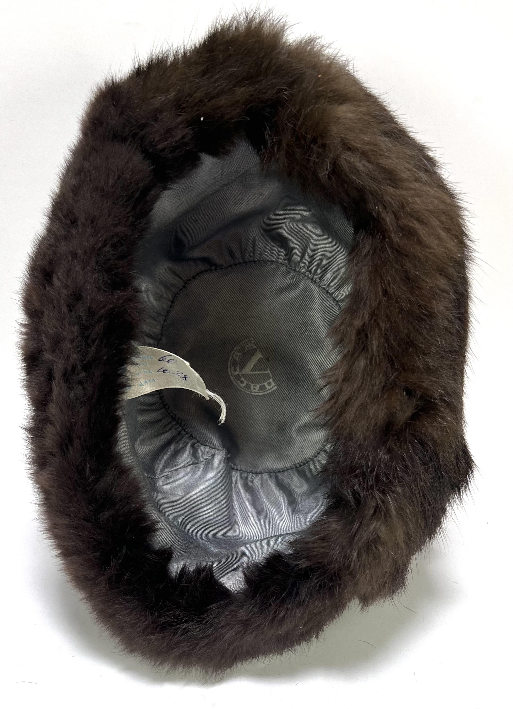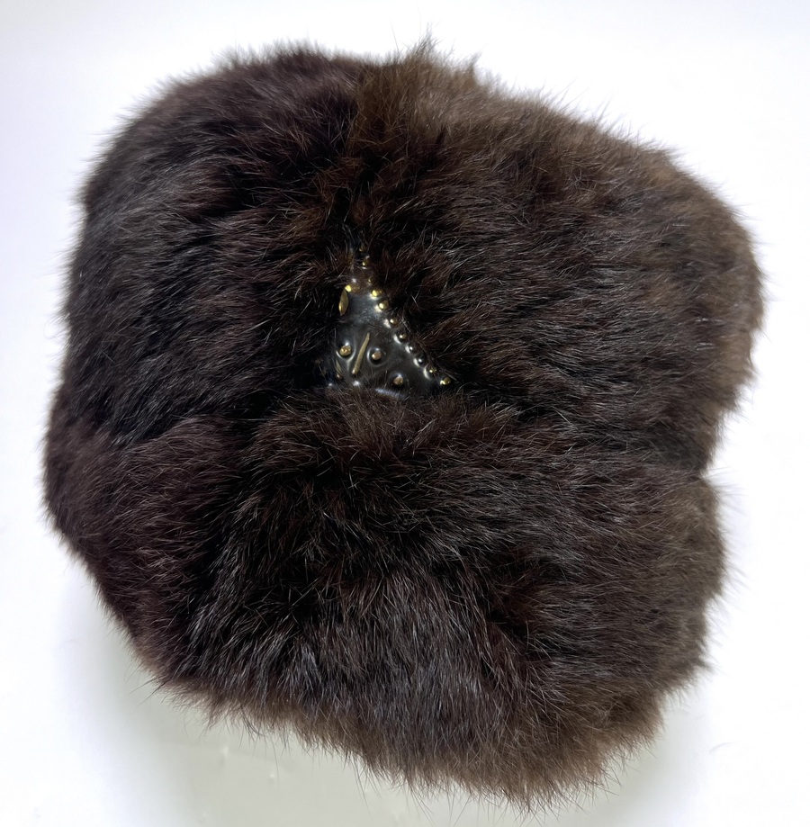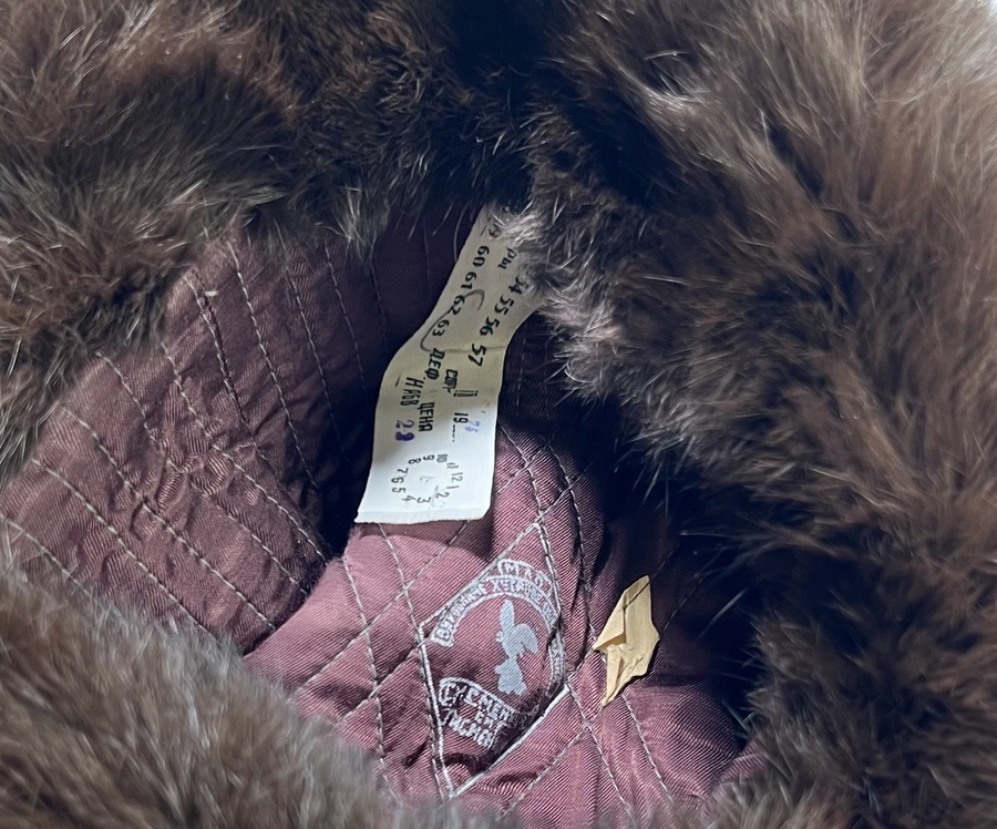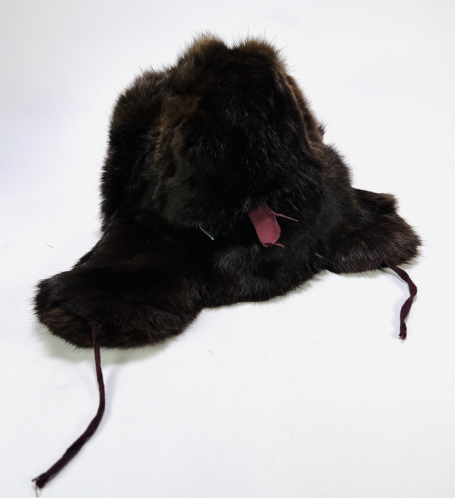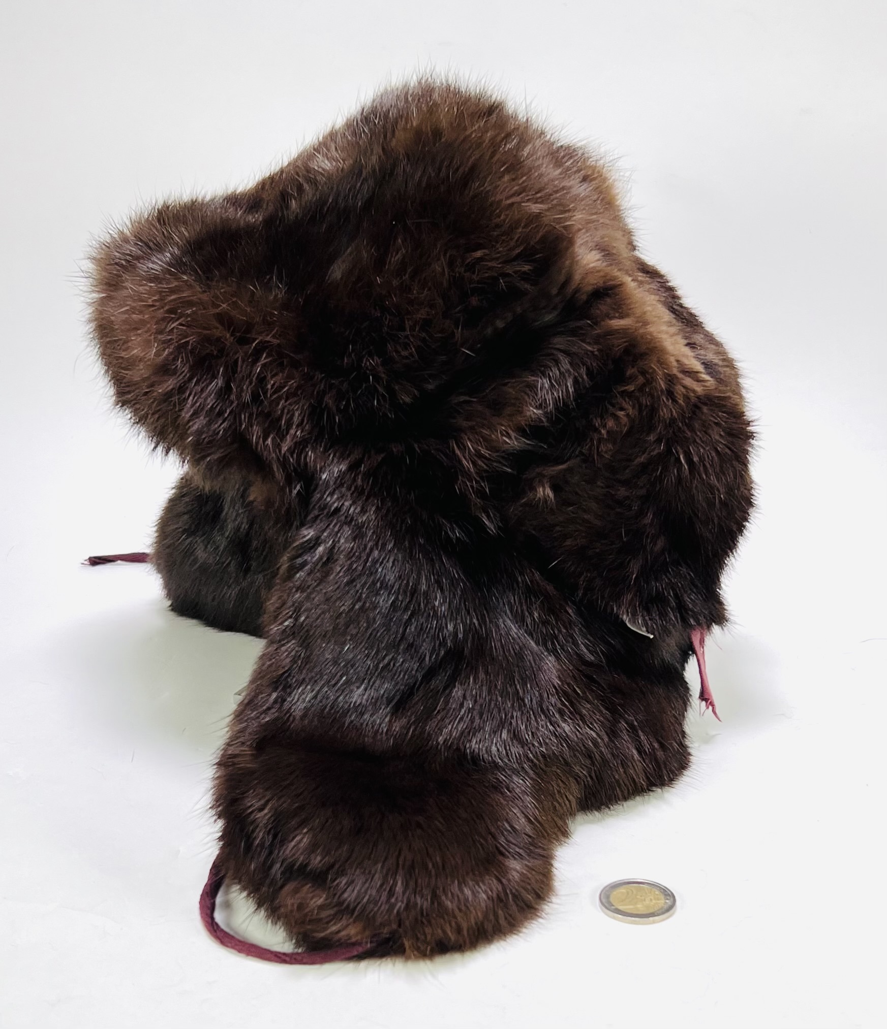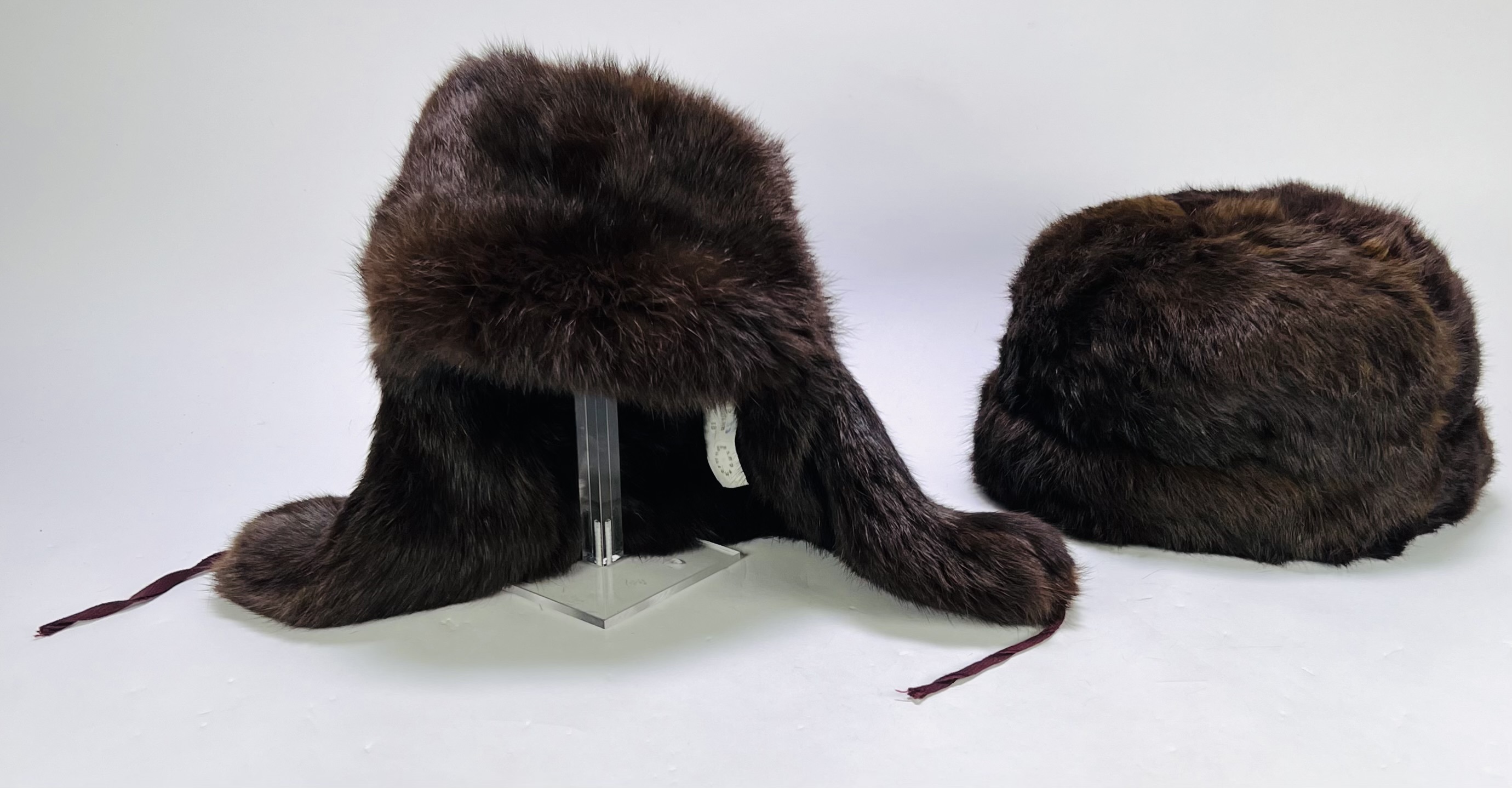 Twee bontmutsen uit ca. 1950, bestaande uit een herenmuts en een damesmuts, vervaardigd in de voormalige Sovjet-Unie. De mutsen zijn van donkerbruin bont met een textiel voering. Binnenin is het label met de Russische teksten "ДЕНА", "MAЙ" en een logo zichtbaar. De ene muts is voorzien van een paarse stoffen afwerking, de andere met een grijze. Wil je de bontmutsen in het echt bekijken? Kom naar de kijkdagen op 29, 30 en 31 augustus! |