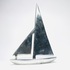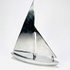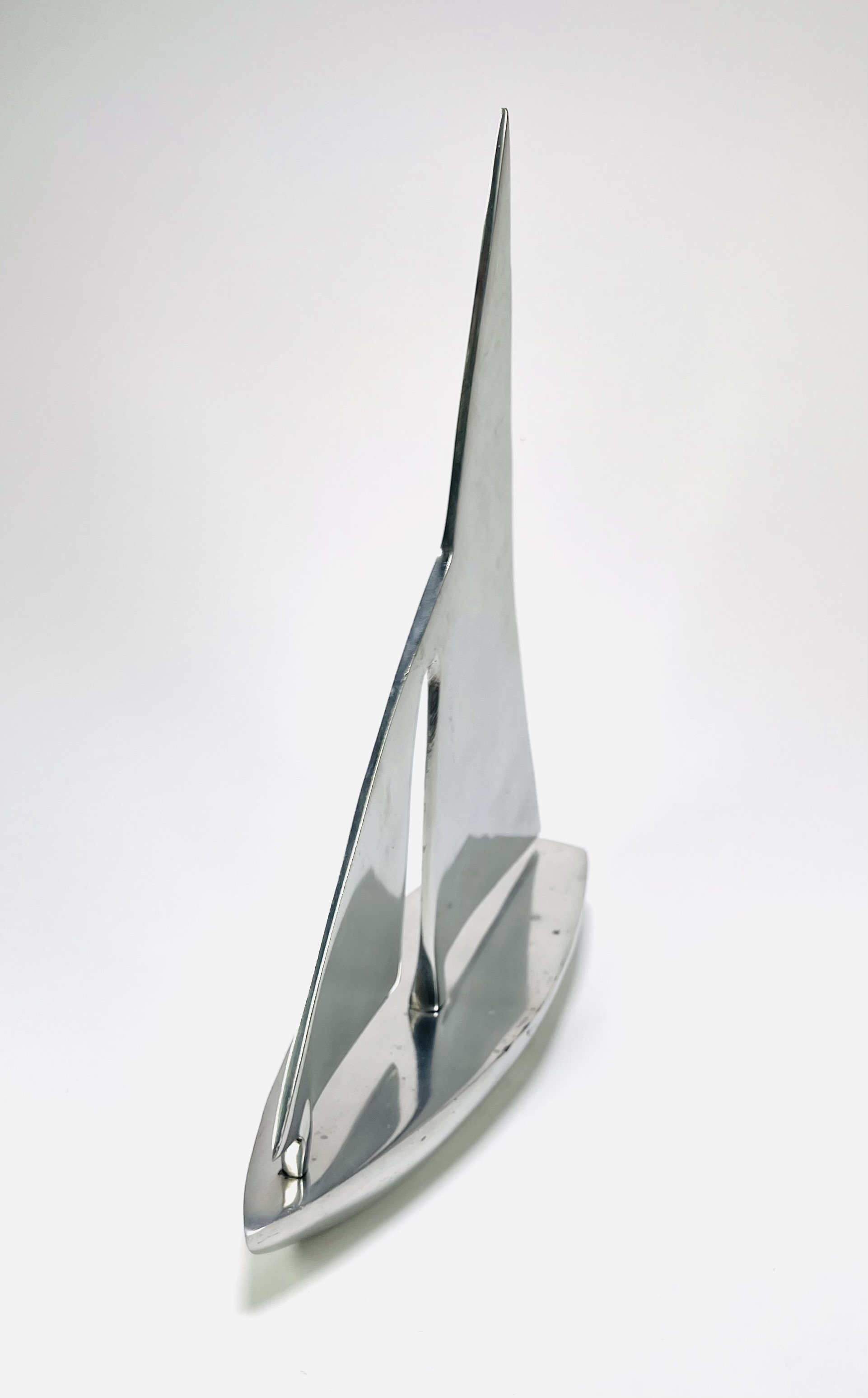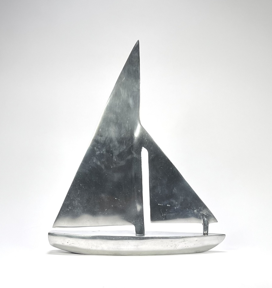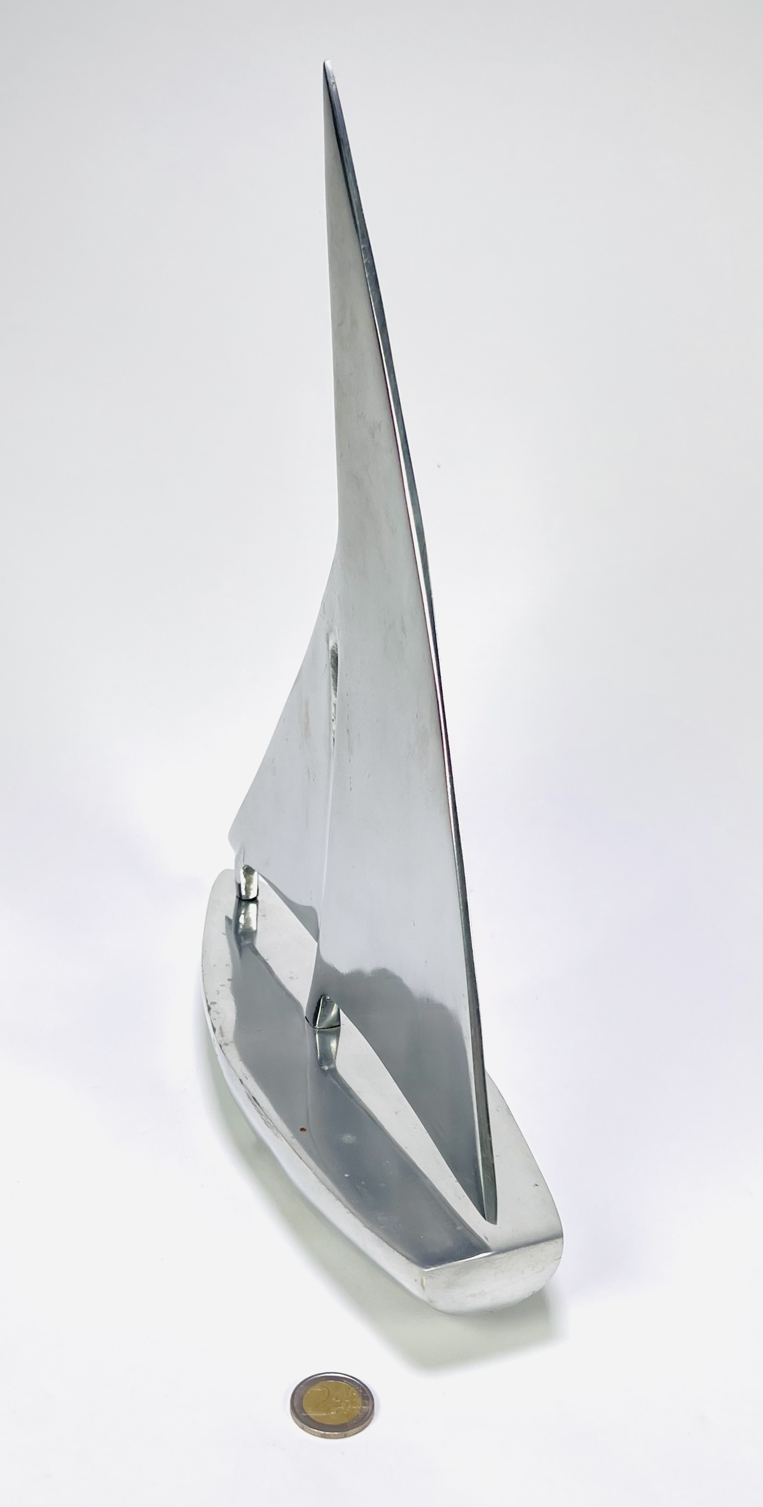 Aluminium zeilboot in modernistische stijl, eind 20e eeuw, met een gestileerde vormgeving en gladde oppervlakken en een scherp oprijzend zeil. De romp en het zeil vormen een vloeiend geheel zonder verdere detaillering. Registreer nu en bied eenvoudig online mee op deze boot! |