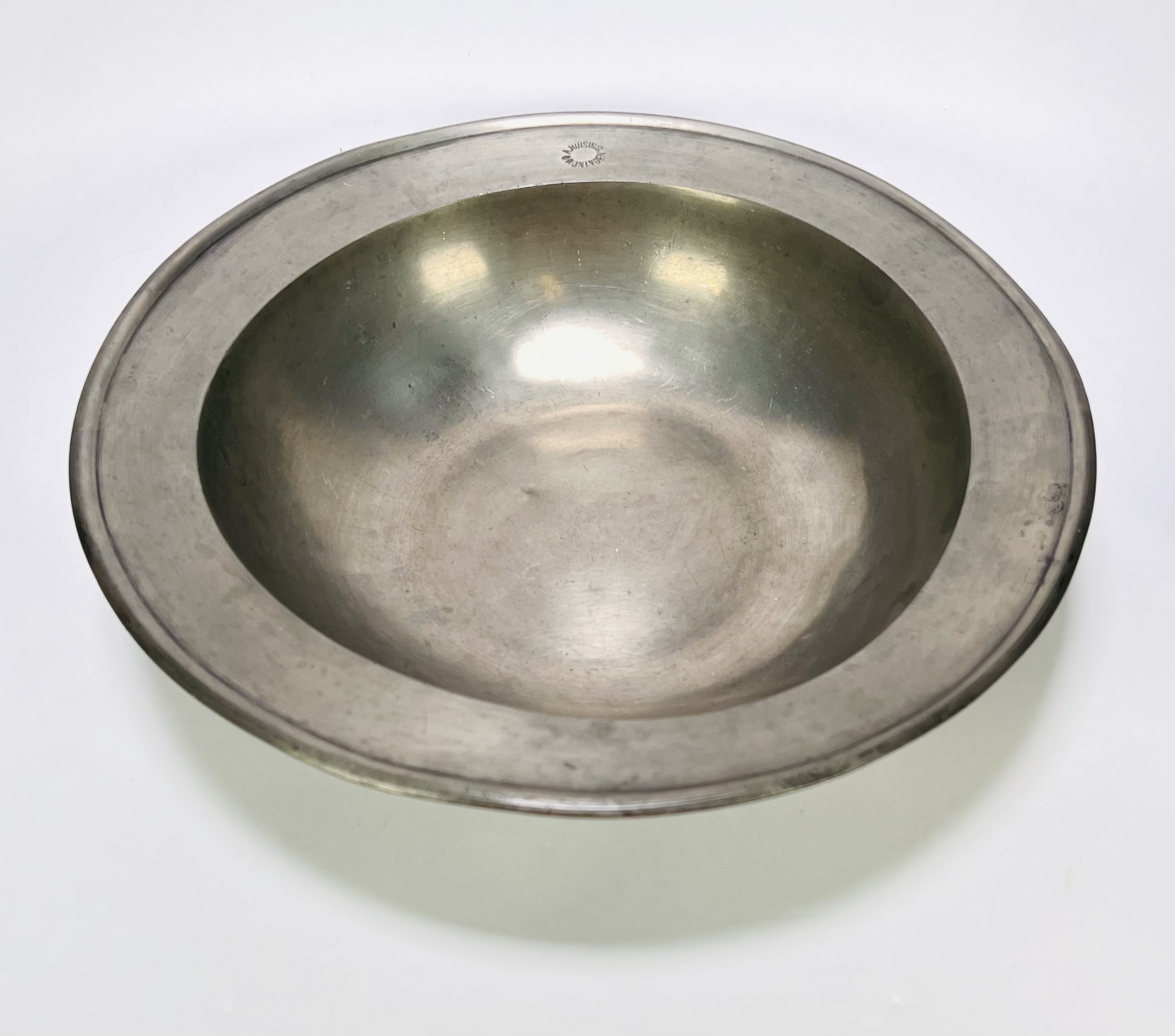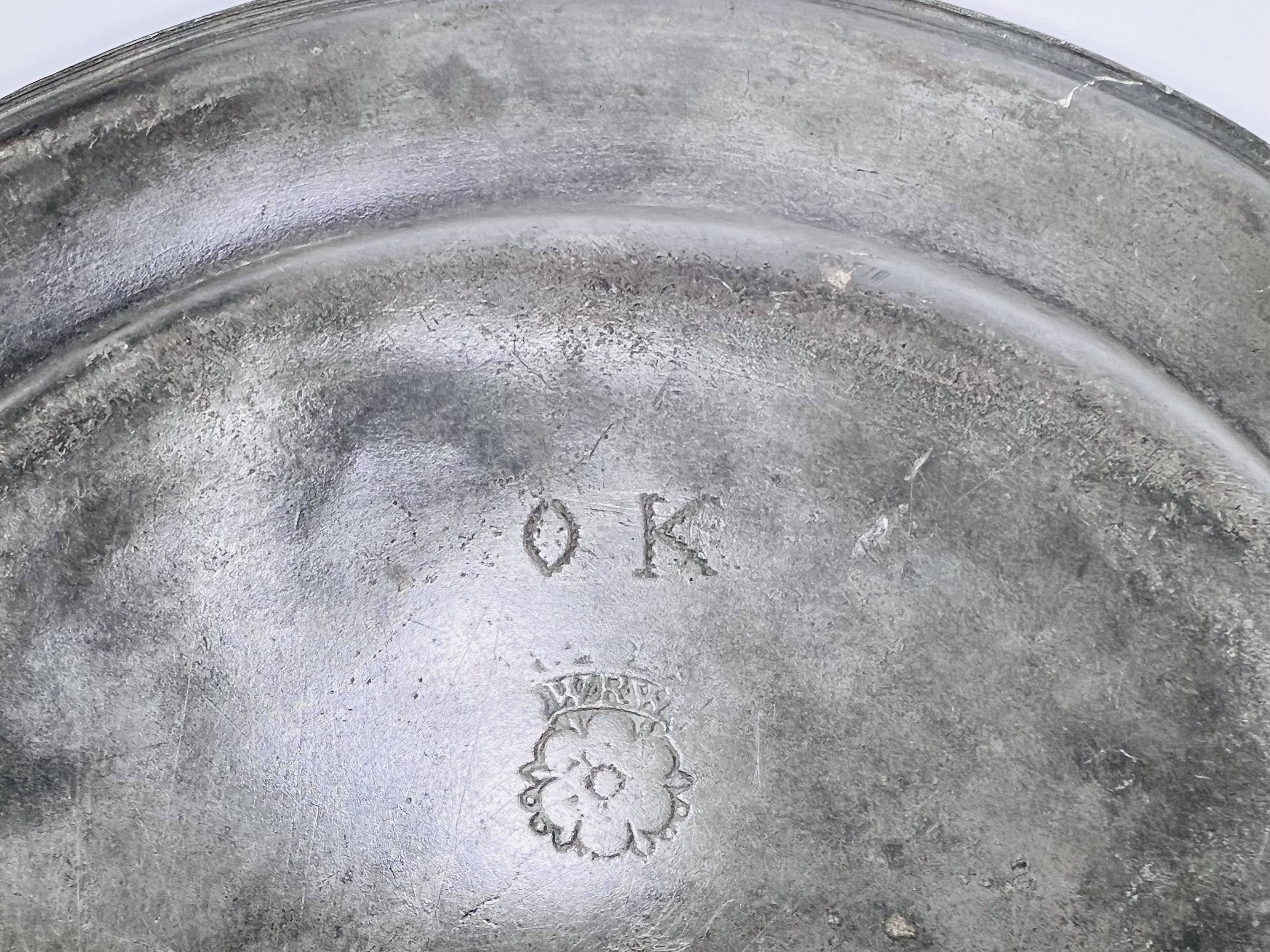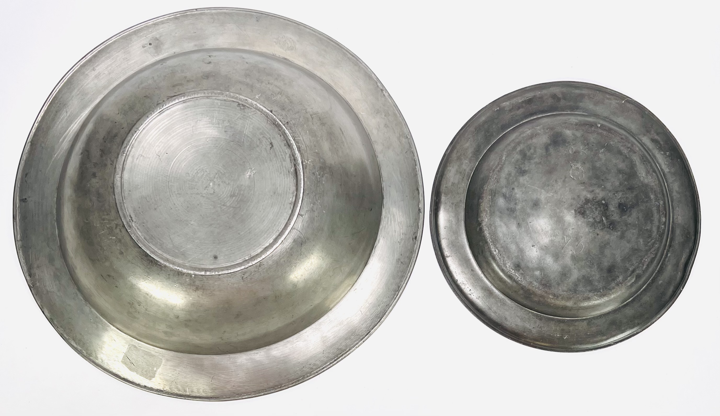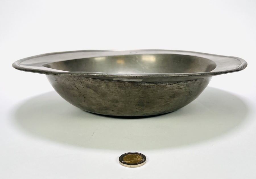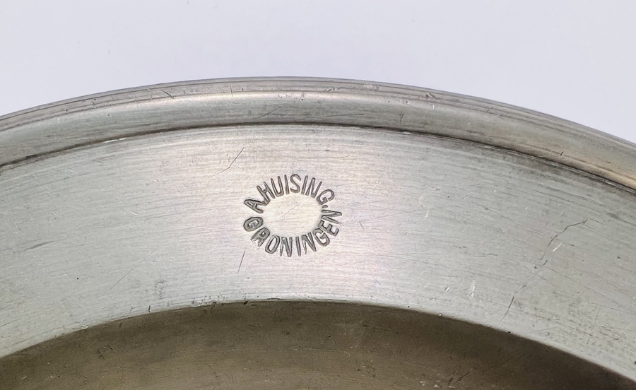 Tinnen borden, eind 18e–begin 19e eeuw, een bord onderzijde gemerkt met een bloem en WERNA, alsmede de initialen O K, het andere bord gemerkt A. Huising Groningen. De borden hebben brede randen en diepe komvormige spiegels. Wil je deze borden in het echt bekijken? Kom naar de kijkdagen op 29, 30 en 31 augustus! |
