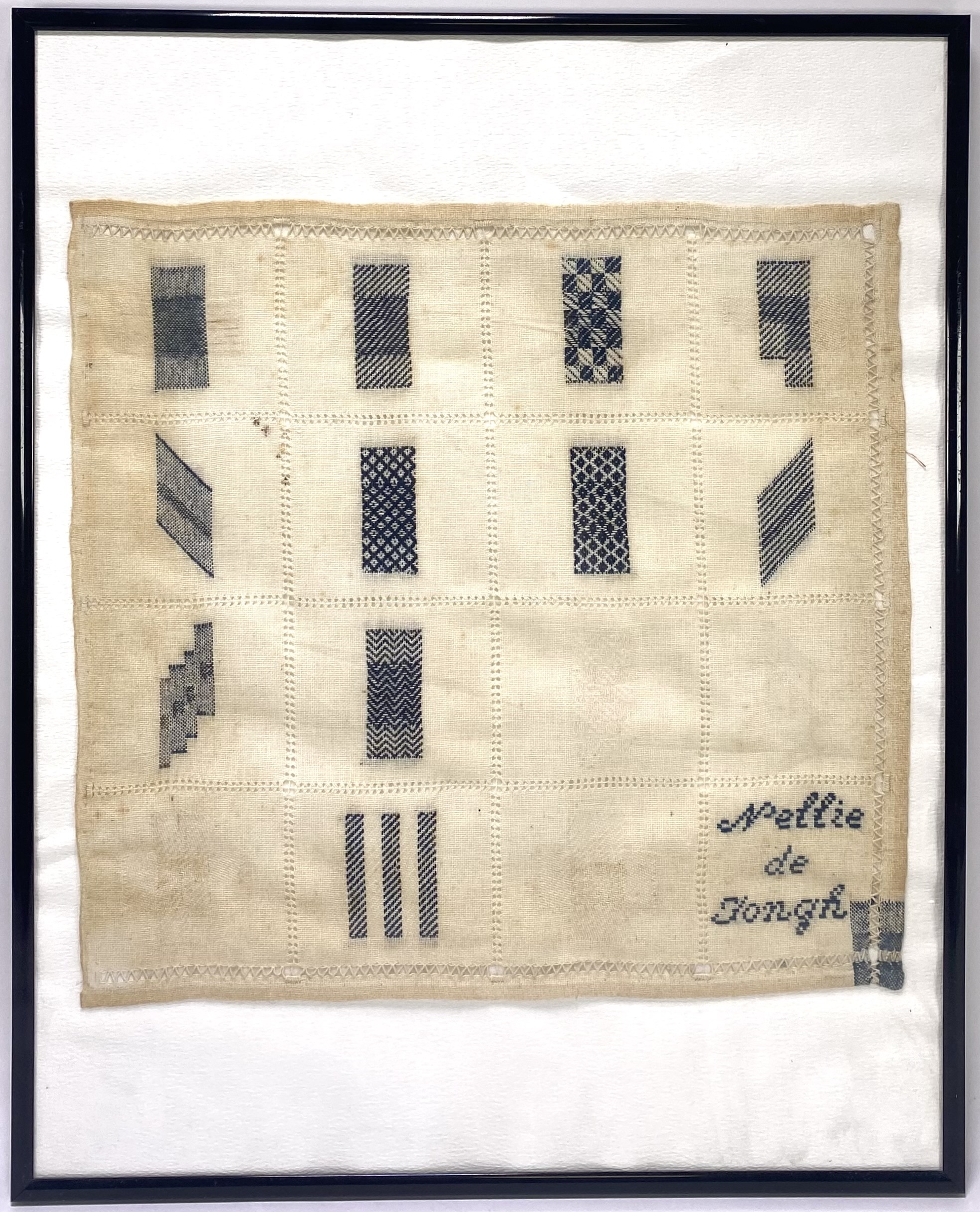 Merklap uit het begin van de 20e eeuw, uitgevoerd in stop- en weefsteken op linnen. De lap is opgebouwd uit twaalf vakken met uiteenlopende geometrische patronen in donkerblauw borduurgaren. In het onderste rechter vak is de naam Nellie de Jongh geborduurd. De merklap toont duidelijk de educatieve functie van merklappen als oefenstuk voor naaldwerk. Ontdek deze merklap en voeg het toe aan jouw collectie! Registreer nu voor de veiling. |
