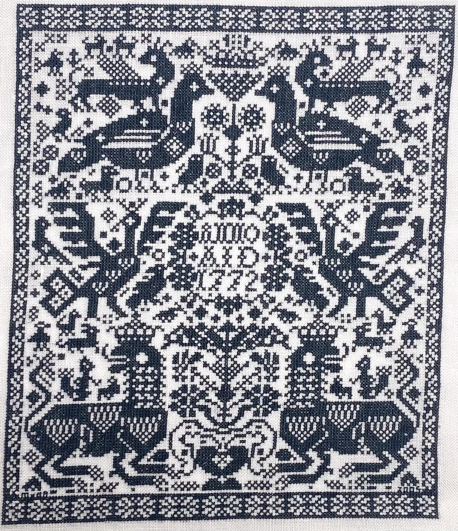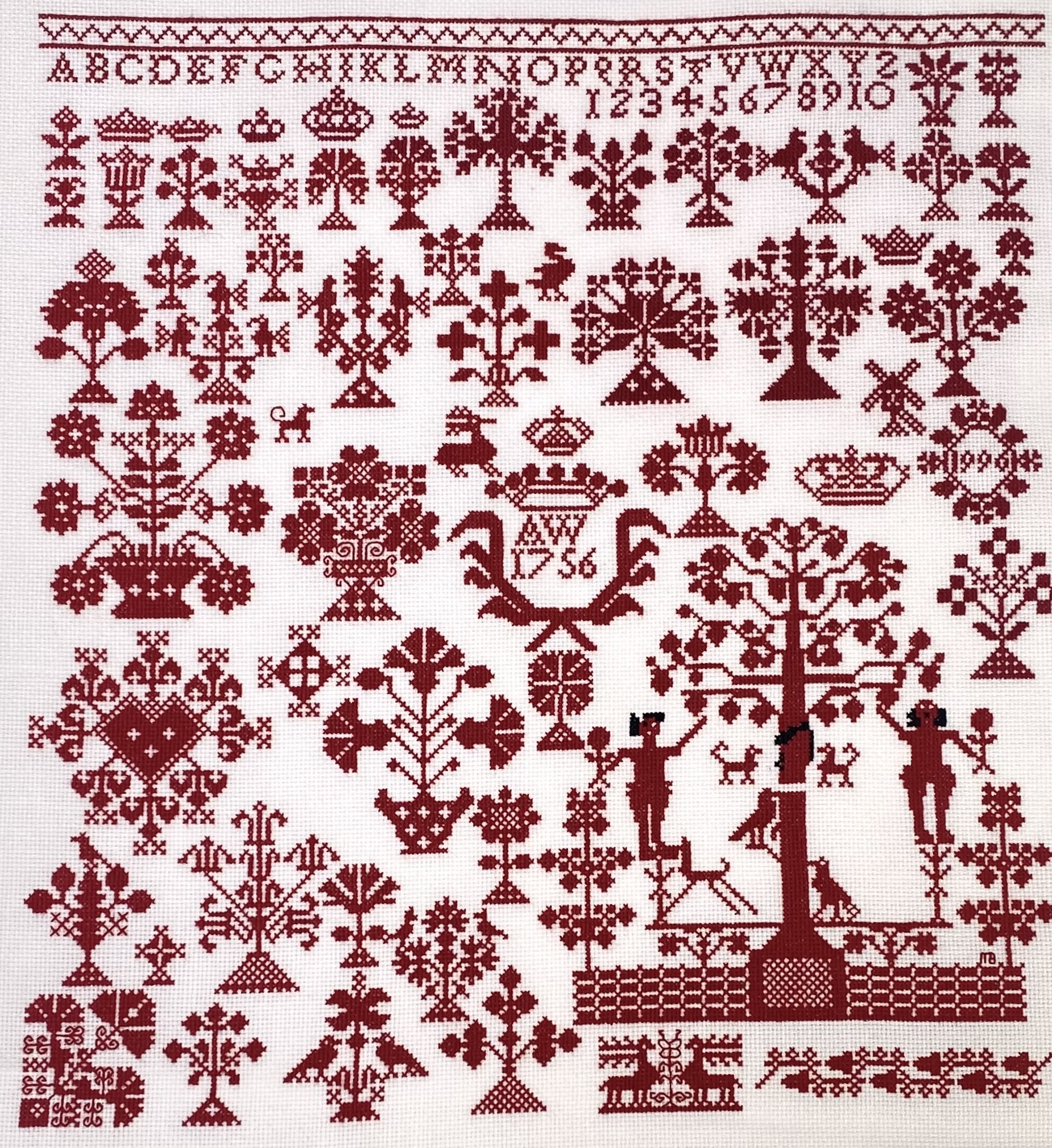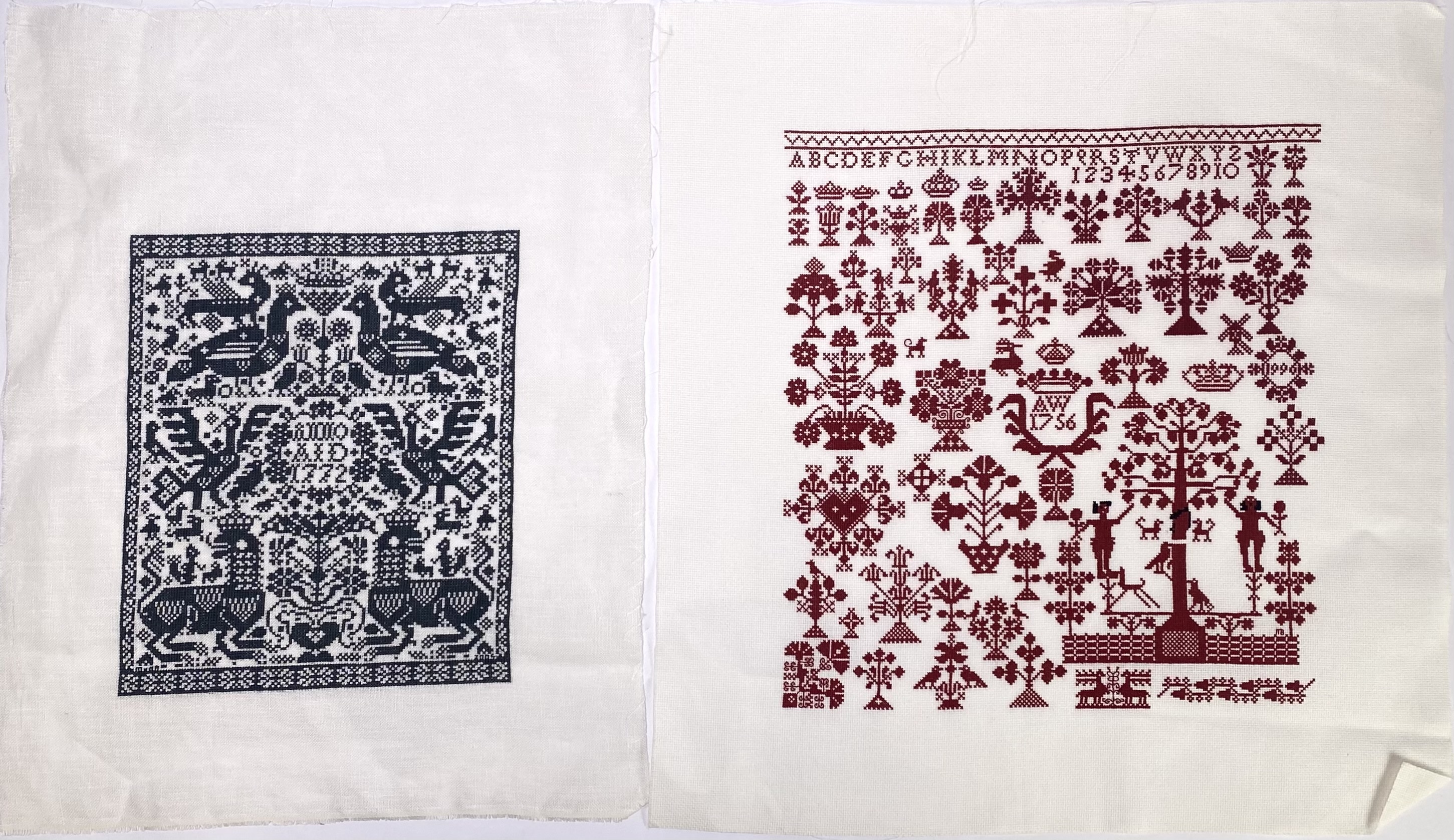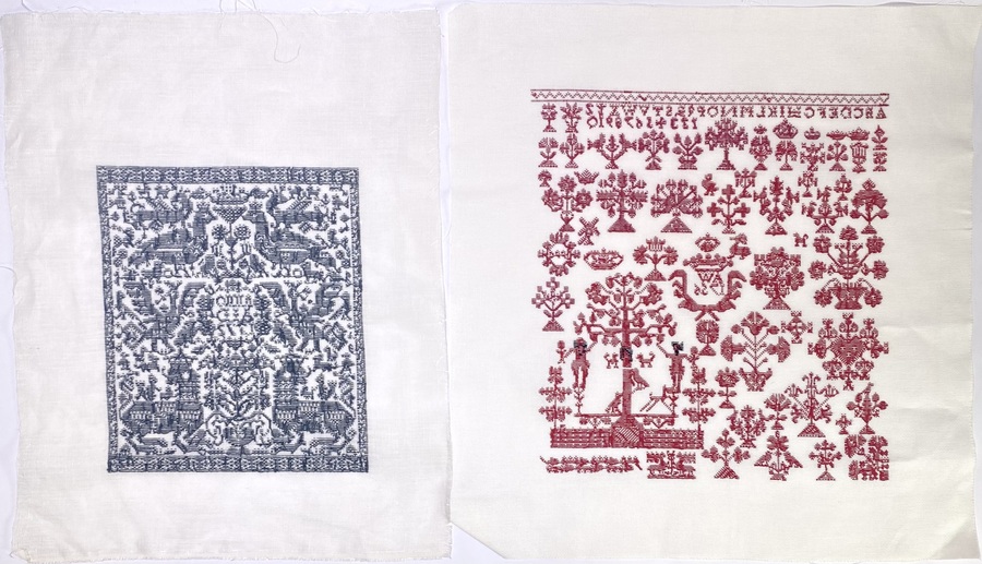 Merklappen, kruissteekborduurwerk, 20e eeuw
