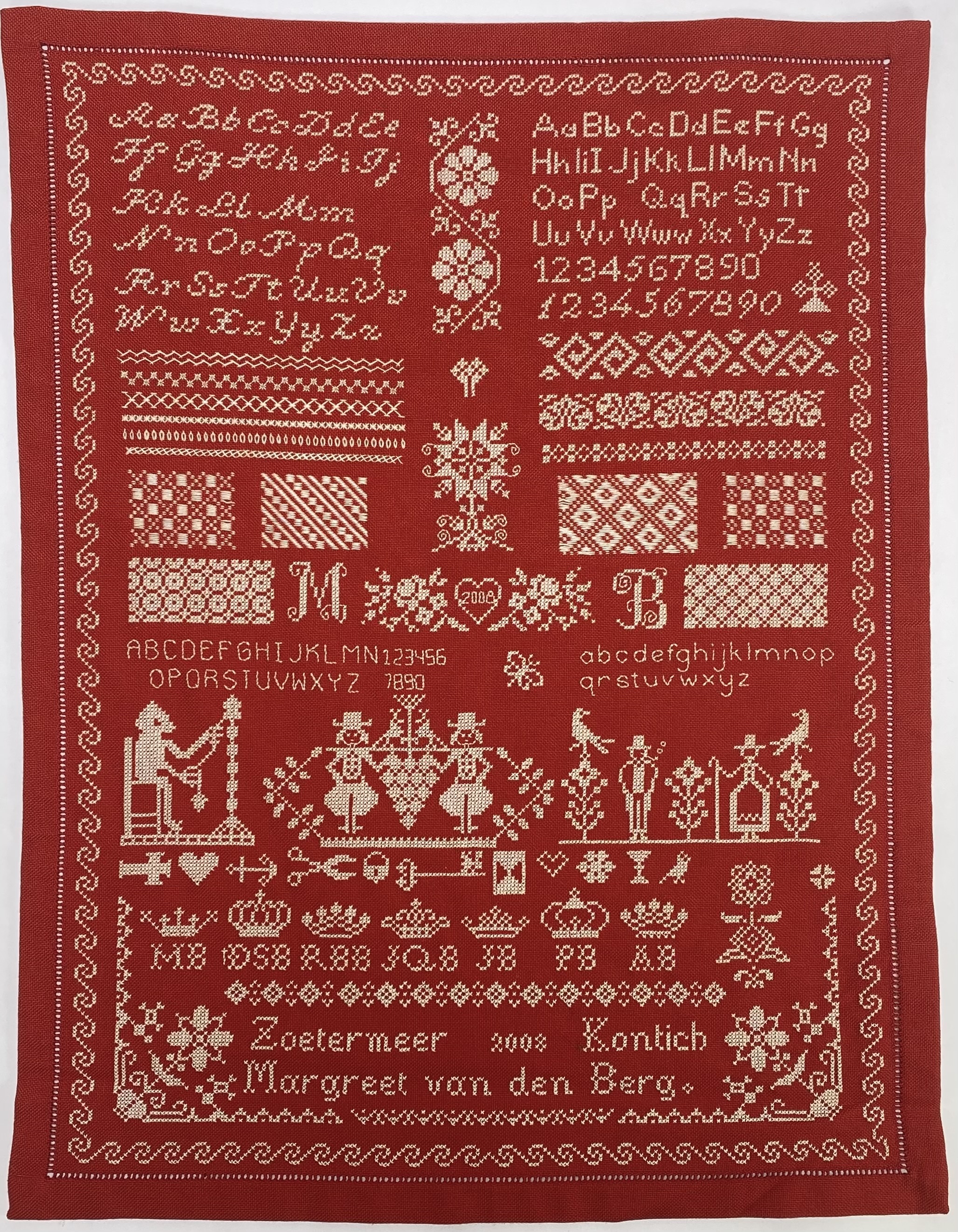 Merklap uit 2008, uitgevoerd in kruissteekborduurwerk op linnen of katoen. De voorstelling bevat meerdere alfabetten, cijferreeksen, randversieringen, bloemmotieven, kronen en geometrische patronen, gecombineerd met figuratieve scènes zoals een spinnewiel en paren in traditionele kleding. Onderaan geborduurd met de tekst Zoetermeer 2008 Kontich. Ontdek deze merklap en voeg het toe aan jouw collectie! Registreer nu voor de veiling. |