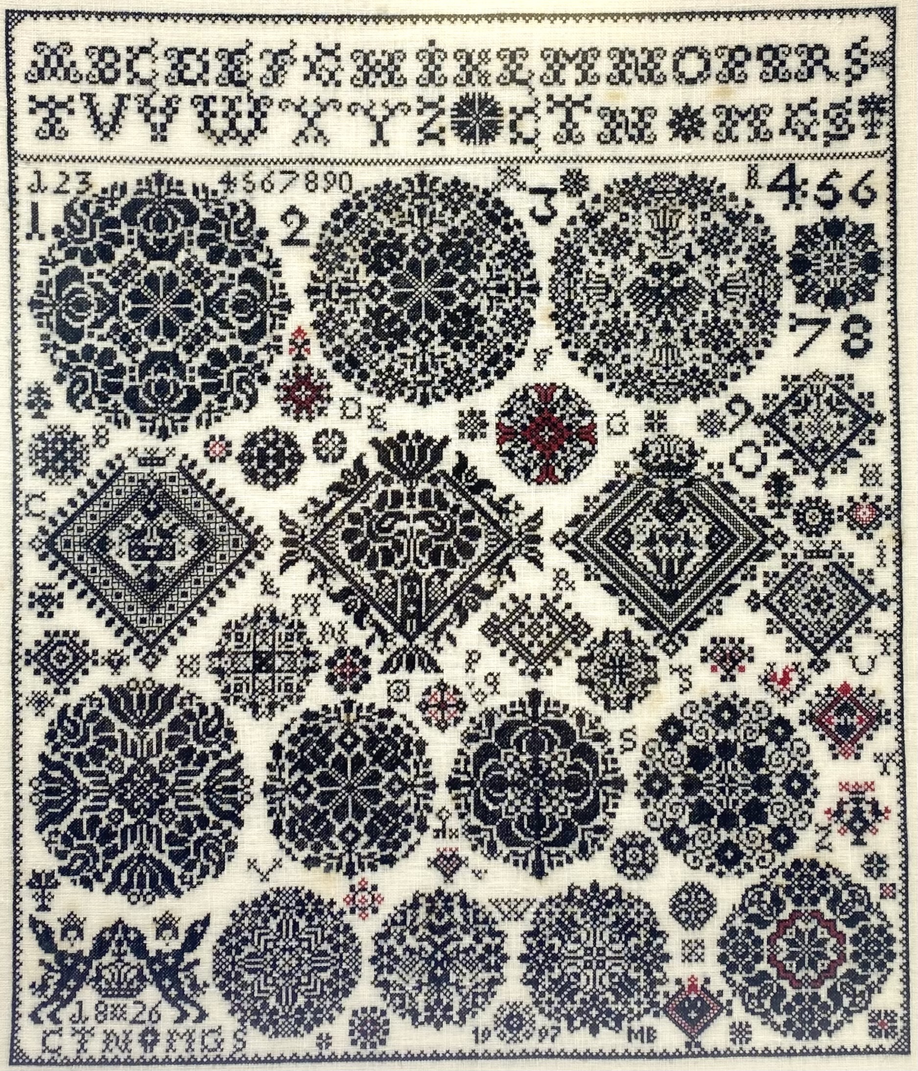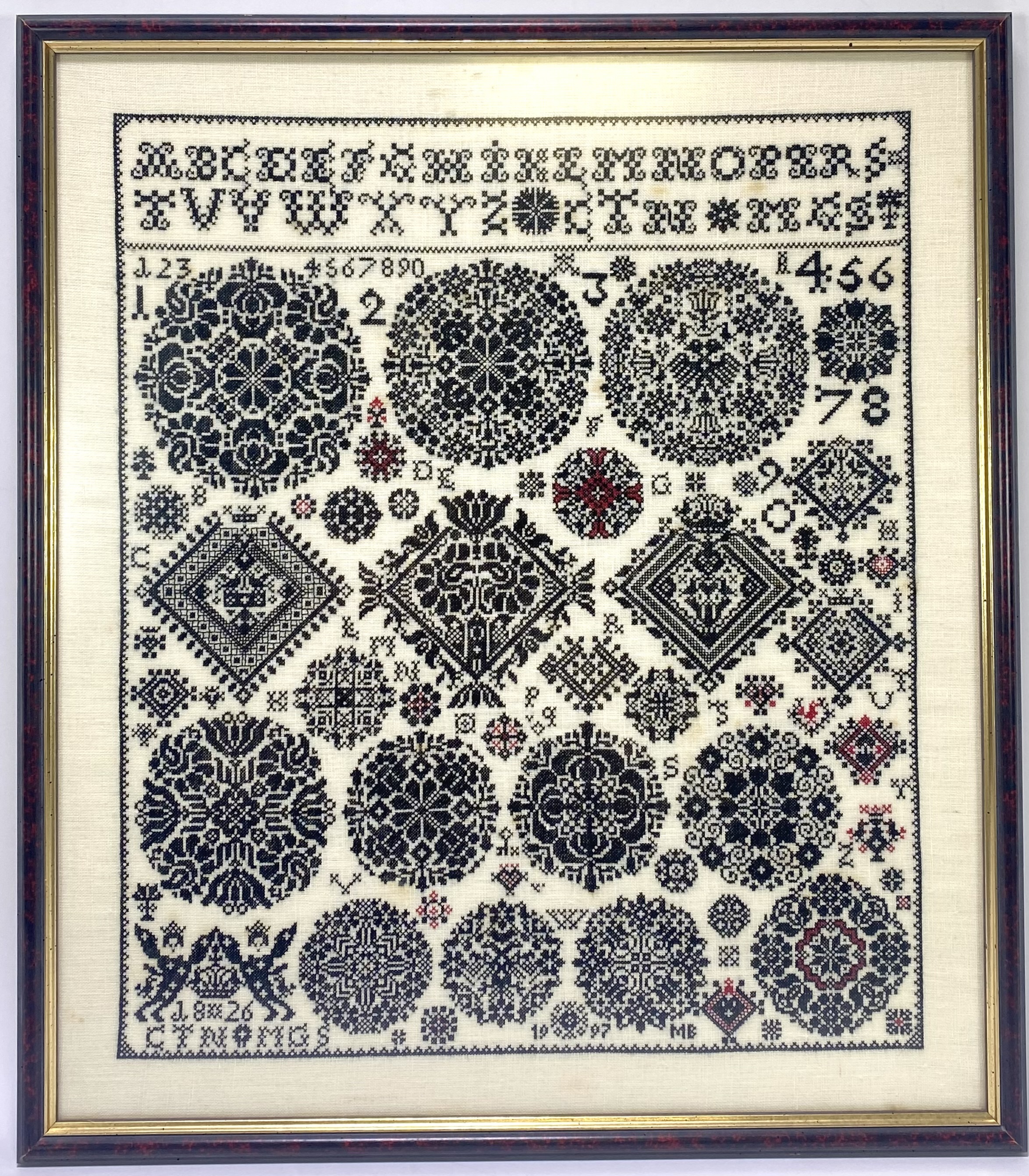 Merklap uit 1997, uitgevoerd in kruissteekborduurwerk op linnen naar antiek voorbeeld. De voorstelling bevat alfabetten, cijfers en een reeks geometrische medaillons in zwart garen, met enkele rode accenten. Onderaan geborduurd met initialen MB en het jaartal 1997. Gevat in een houten lijst met goudkleurige binnenrand en donkerrode afwerking. Geïnteresseerd? Bezoek onze kijkdagen op 29, 30 of 31 augustus van 11:00 tot 17:00 uur! |