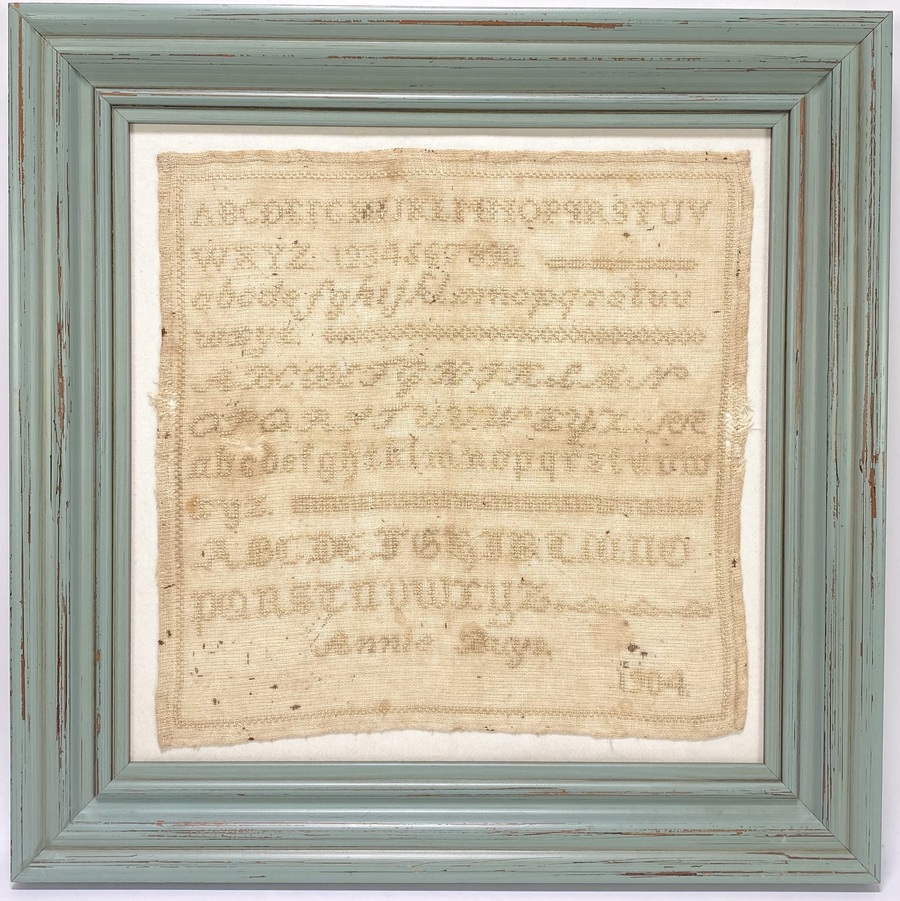 Merklap uit 1904, uitgevoerd in kruissteekborduurwerk op linnen. De compositie toont diverse alfabetten in hoofd- en kleine letters, cijfers en sierranden in horizontale registers. Onderaan is de naam Annie Reys en het jaartal 1904 geborduurd. De merklap is gevat in een houten lijst in grijsgroene tint. Ontdek deze merklap en voeg het toe aan jouw collectie! Registreer nu voor de veiling. |