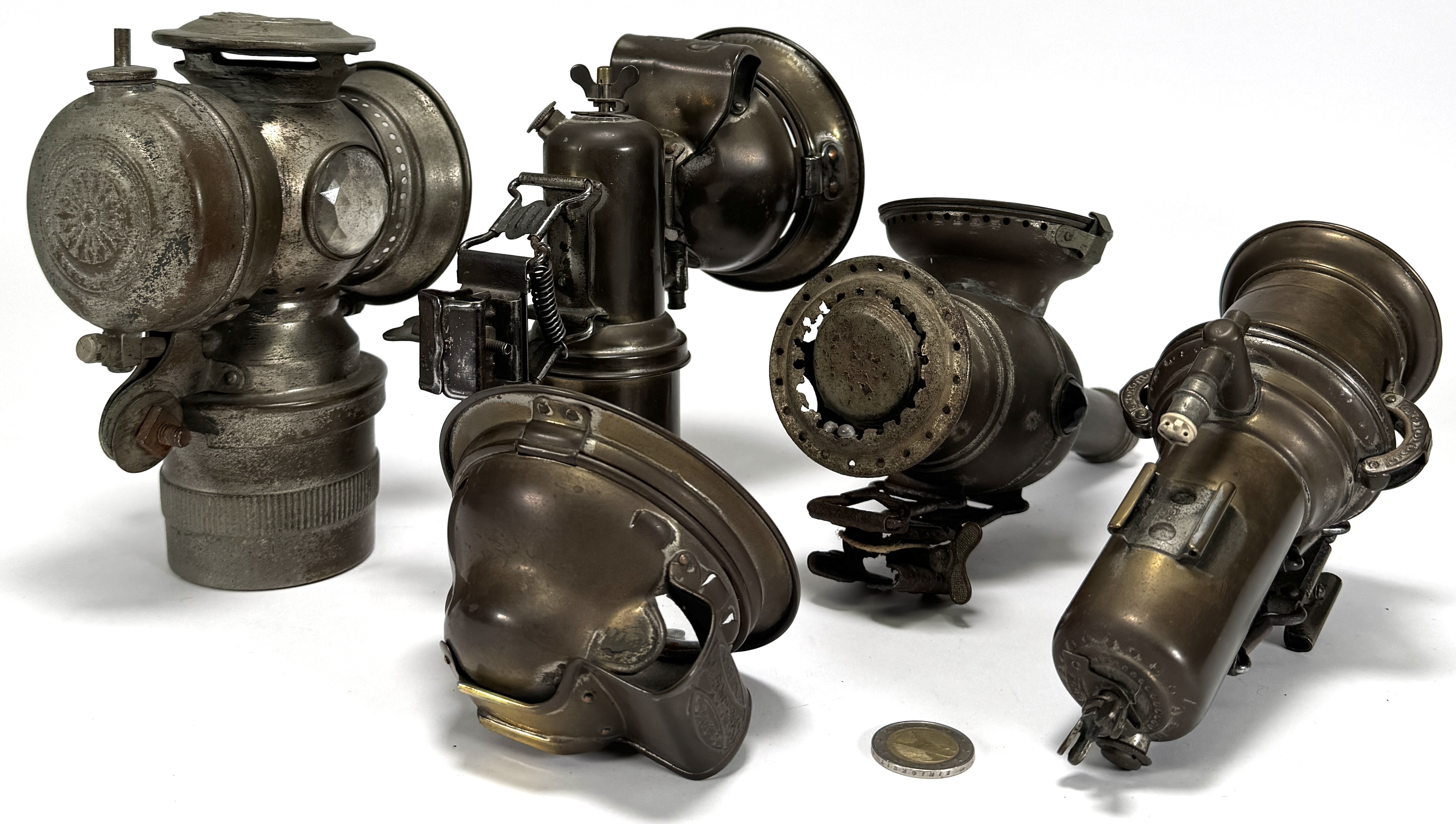 Vijf carbidlampen, vervaardigd van metaal en glas. De lampen zijn van verschillende afmetingen. Deze functionele lampen zijn representatief voor de verlichtingstechniek van voertuigen uit het begin van de 20e eeuw. Geïnteresseerd? Bezoek onze kijkdagen op 29, 30 of 31 augustus van 11:00 tot 17:00 uur! |