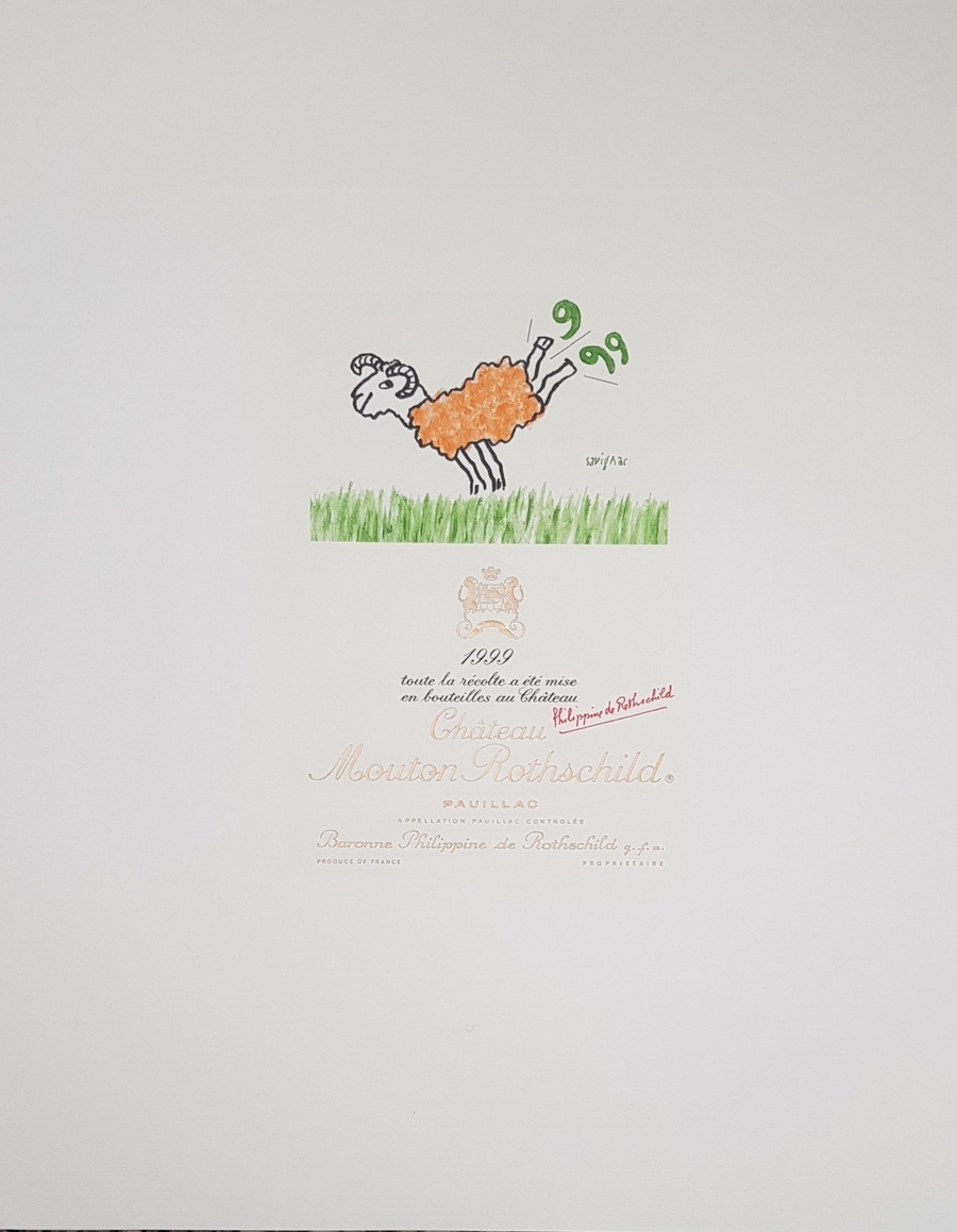 Château Mouton Rothschild litho, een vergrote afdruk van het wijnetiket naar ontwerp van kunstenaar Raymond Savingac uit 1999