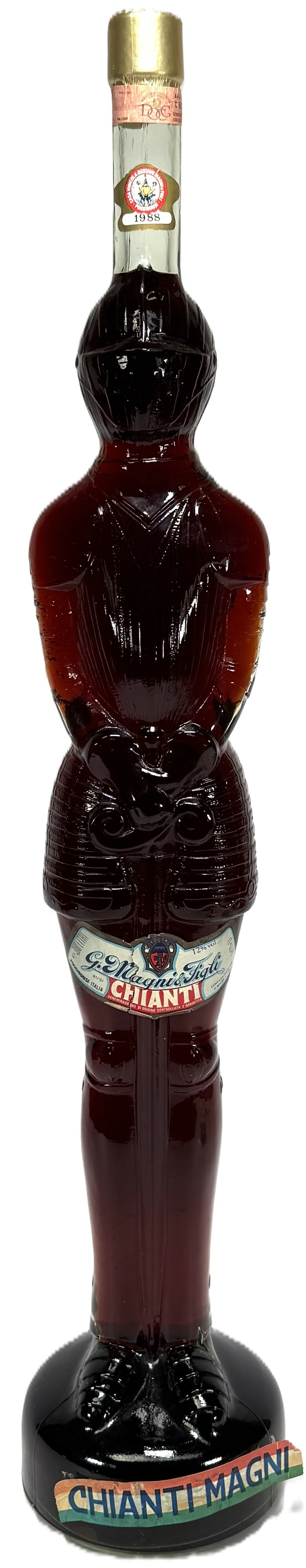 Glazen Chianti fles in de vorm van een ridder, vervaardigd door G. Magni & Figlio en gedateerd 1988. De fles is uitgevoerd in gegoten glas met decoratieve riddervorm, voorzien van metalen dop en bedrukt papieren etiket. Aanwezig zijn de teksten “Chianti Magni” en “G. Magni & Figlio”. Klaar om te bieden? Registreer je nu en doe mee aan de veiling! |