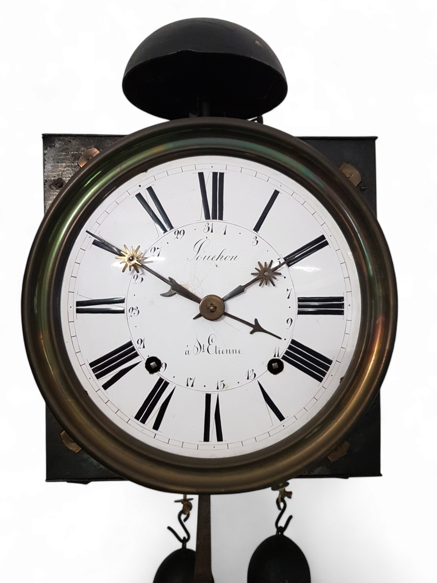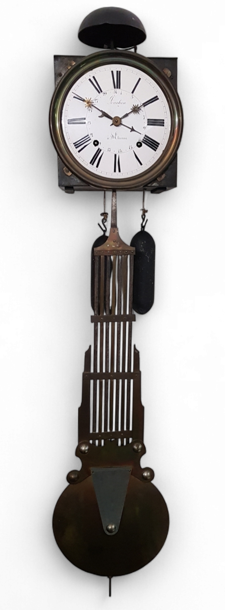 Comtoise, 19e eeuw, gesigneerd op de wijzerplaat "Juniken à St. Etienne". Het uurwerk is uitgevoerd met een geëmailleerde wijzerplaat met Romeinse cijfers en een mechanisch slingeruurwerk met gewichten. Aanwezig is de karakteristieke harpslinger, zichtbaar onder de kast. De klok combineert landelijke eenvoud met functionele techniek en decoratieve elementen. Klaar om te bieden? Registreer je nu en doe mee aan de veiling! |