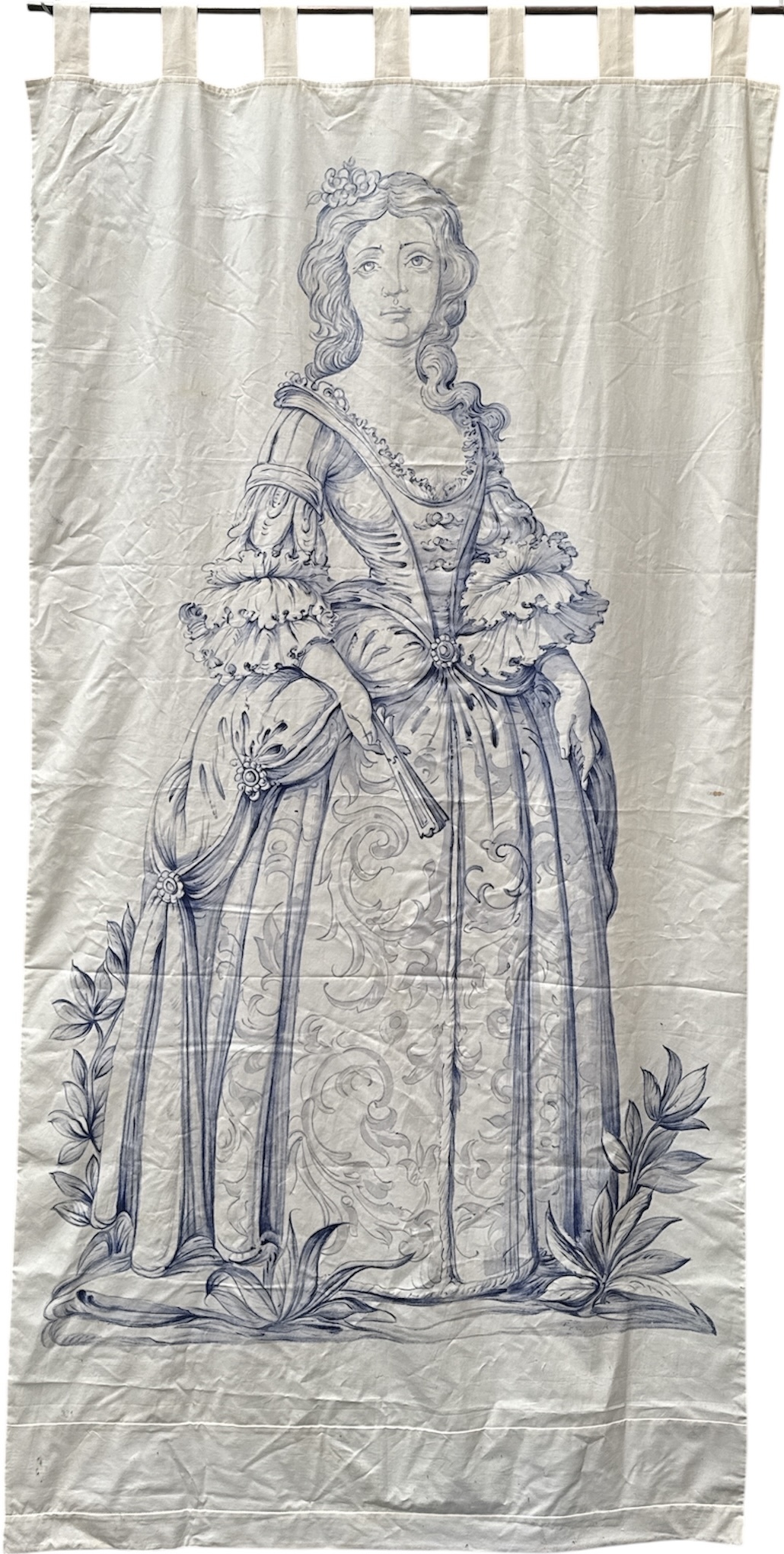 Textiel doek uit de 20e eeuw met voorstelling van een jonkvrouw in hofkleding, uitgevoerd in figuratieve stijl. Het doek is vervaardigd van linnen en bedrukt in blauw op lichte ondergrond. Kenmerkend zijn de gedetailleerde weergave van japon, waaier en bladmotieven. Zeker zijn van deelname? Plaats een schriftelijk bod online! |