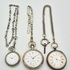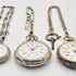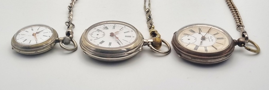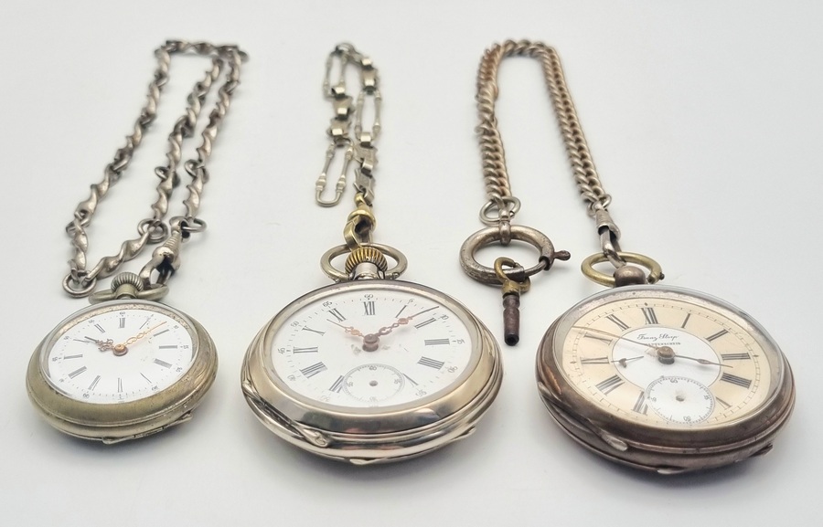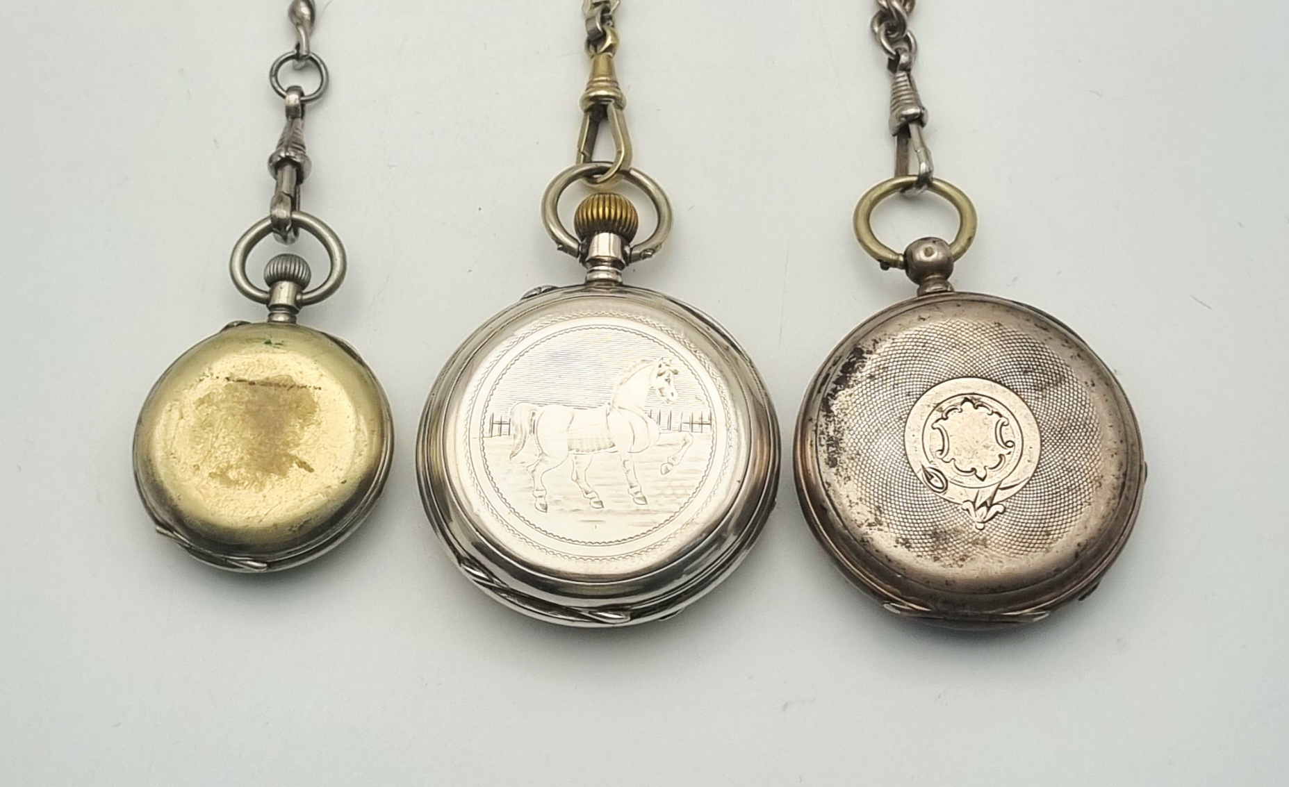 Drie verzilverde zakhorloges met kettingen, eind 19e eeuw tot begin 20e eeuw, waaronder een exemplaar gesigneerd op de wijzerplaat met "Famy Hugu, Winterthur". De wijzerplaten zijn uitgevoerd in emaille met Romeinse cijfers en secondewijzer. Kenmerkend zijn de gegraveerde achterkanten, waaronder een paardmotief en ornamentale medaillonversiering, gecombineerd met verschillende kettingvormen. Deze zakhorloges zelf beoordelen? Je bent welkom op onze kijkdagen op 29, 30 en 31 augustus! |