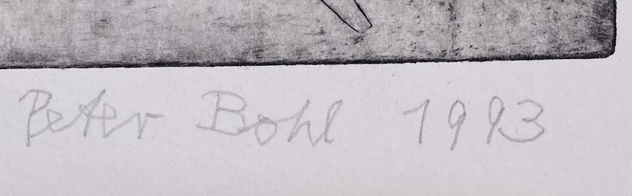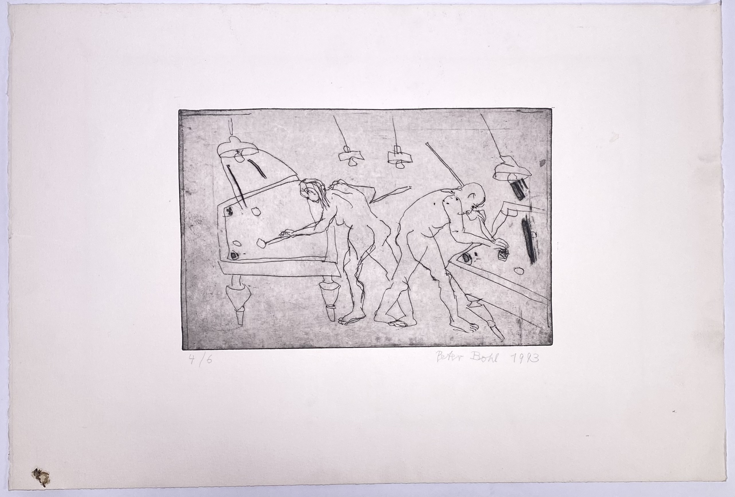 Ets op papier van Peter Bohl, gedateerd 1993, in minimalistische lineaire stijl met contourlijnen. De voorstelling toont twee naakte figuren die biljart spelen onder hangende lampen, waarbij de tafels en ballen schetsmatig zijn weergegeven. Rechtsonder met potlood gesigneerd Peter Bohl 1993 en linksonder genummerd oplagenummer 4/6. Wil je dit ets in het echt bekijken? Kom naar de kijkdagen op 29, 30 en 31 augustus! |