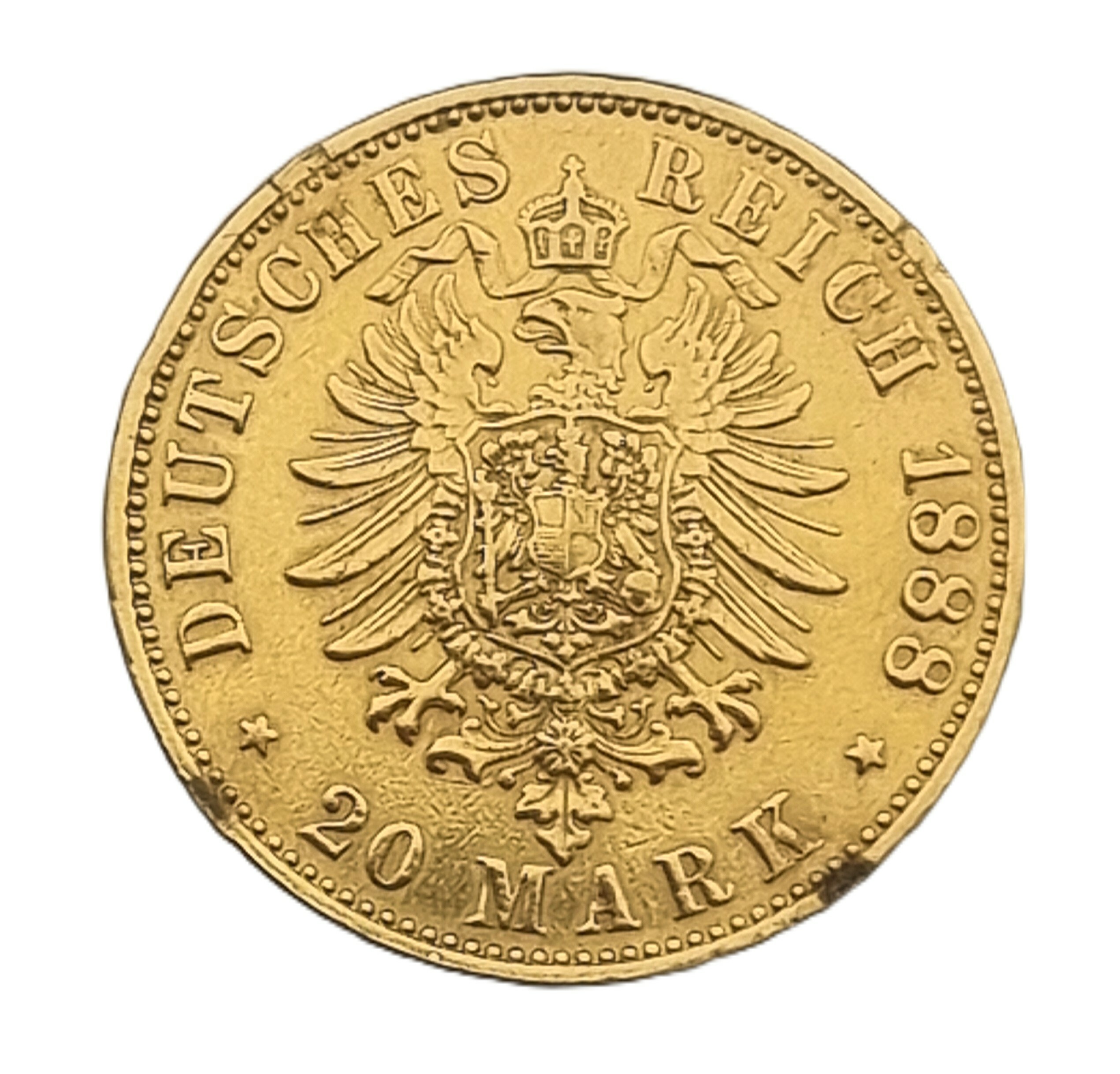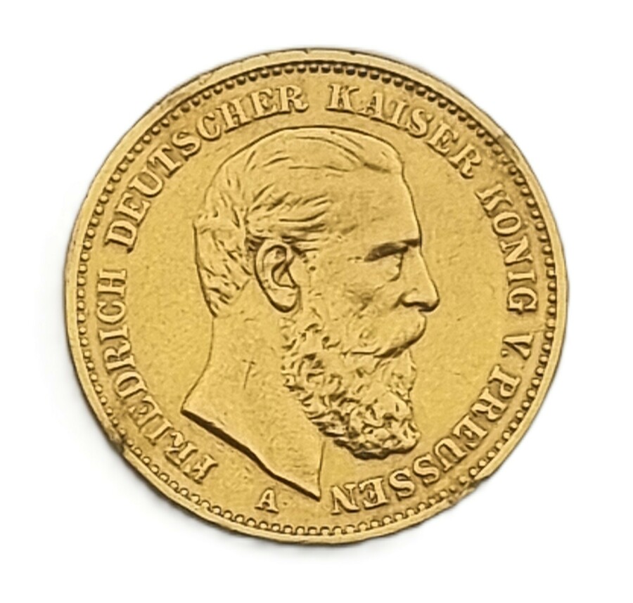Gouden munt van 20 Mark, geslagen in 1888 in Berlijn tijdens het Duitse Keizerrijk onder Friedrich III (1831–1888). Voorzijde met portret en omschrift van de keizer, keerzijde met rijk gedetailleerd rijkswapen en waarde aanduiding. Uitgevoerd in neoclassicistische stijl en vervaardigd in 900/1000 goud. Onderaan de keerzijde gedateerd 1888. Kom langs tijdens de kijkdagen (29 t/m 31 augustus) en ontdek deze munt zelf |