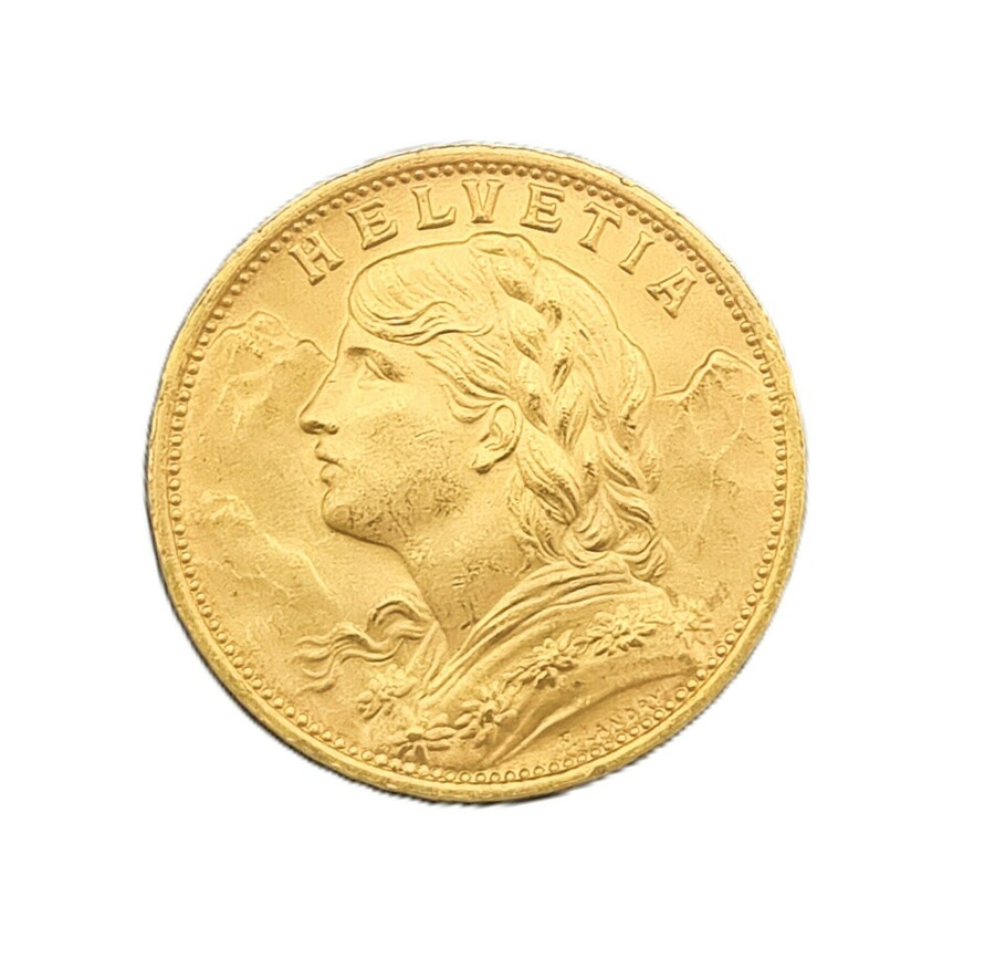 Gouden munt van 20 Zwitserse frank, 1927, ontworpen door Fritz Ulysse Landry (1842–1927). De munt is vervaardigd in goud 900/1000 en toont op de voorzijde het portret van de allegorische figuur Vreneli met berglandschap en opschrift HELVETIA. De keerzijde bevat het Zwitserse kruis in schild, omkranst door eikenloof, met waarde aanduiding 20 FR en muntteken B. Wil je de munt in het echt bekijken? Kom naar de kijkdagen op 29, 30 en 31 augustus! |