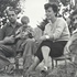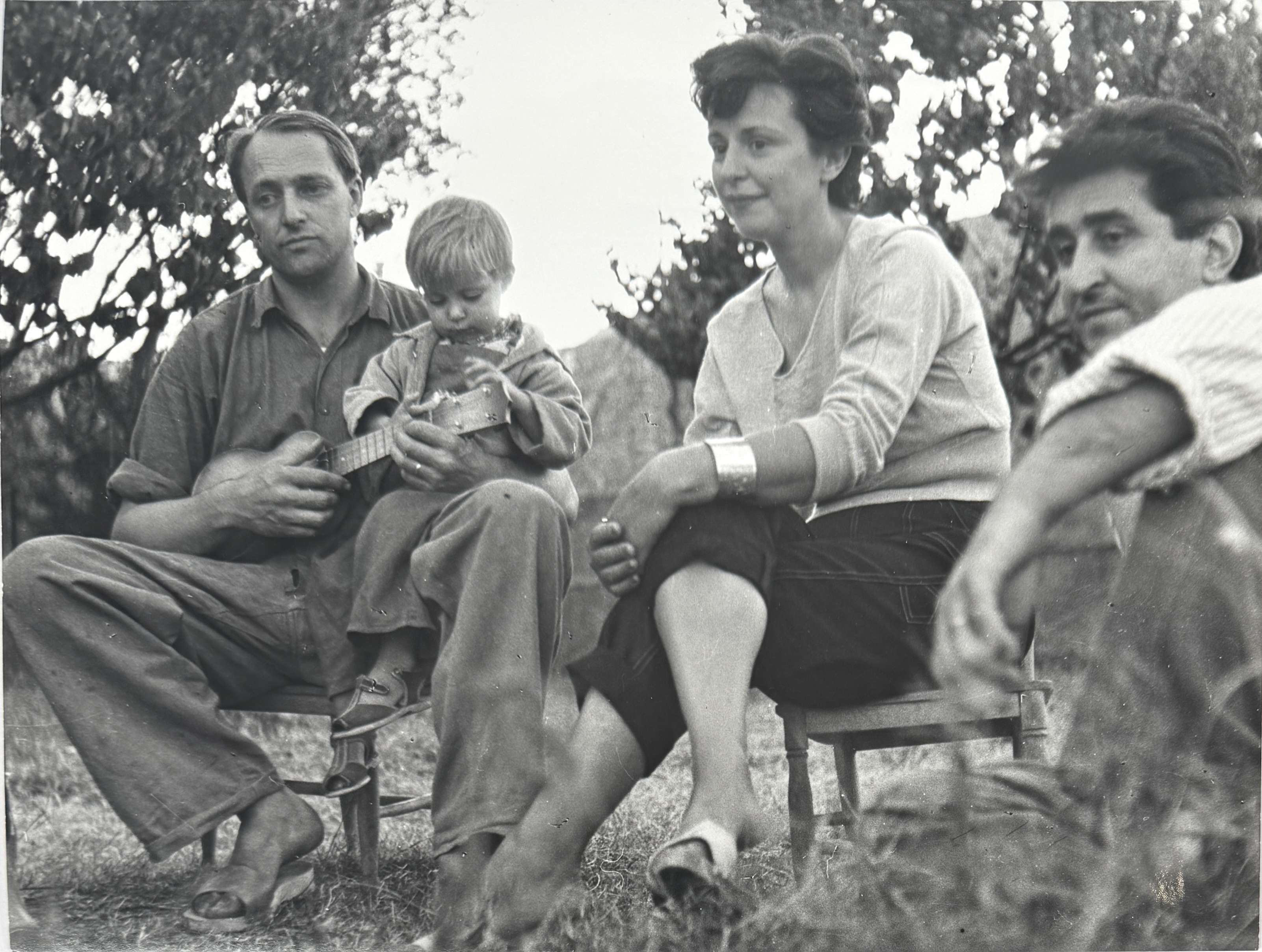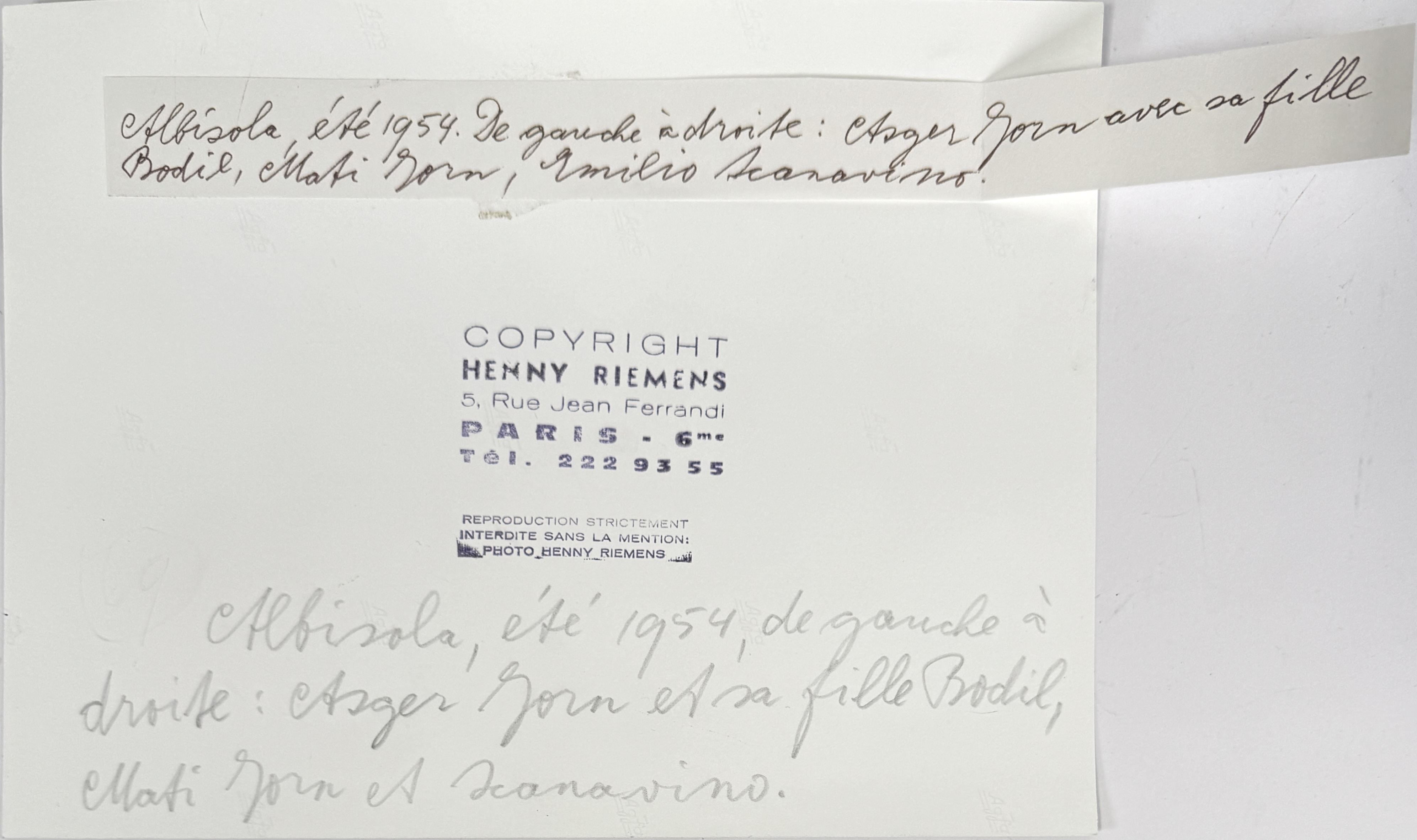 Zwart-wit documentaire foto door Henny Riemens, 1954. Zilvergelatinedruk op papier, verso stempel “COPYRIGHT HENNY RIEMENS, Paris” en handgeschreven: “Albisola, été 1954; de gauche à droite: Asger Jorn avec sa fille Bodil, Matie Jorn, Emilio Scanavino”. Vintage afdruk, vervaardigd nabij de datum; historische context: Albissola kunstenaarscollectief voor keramiek.