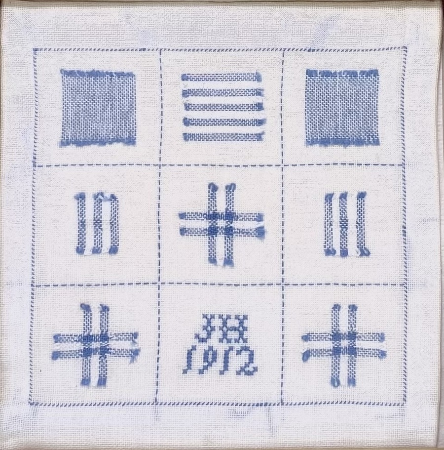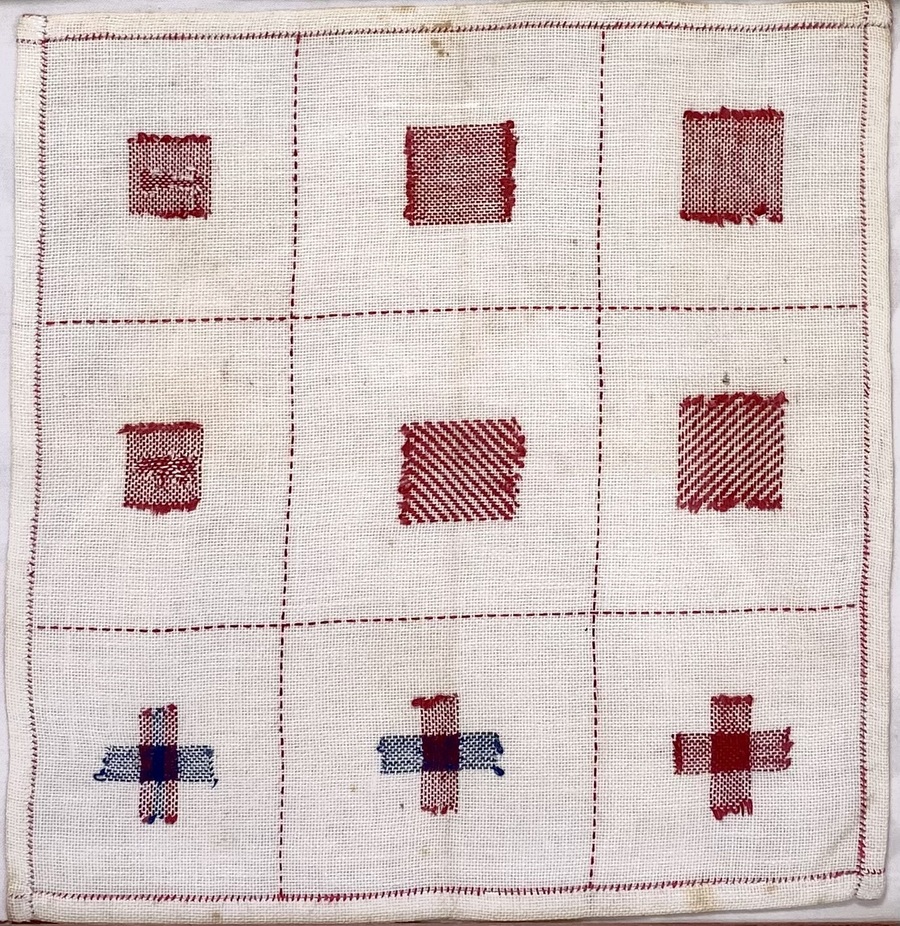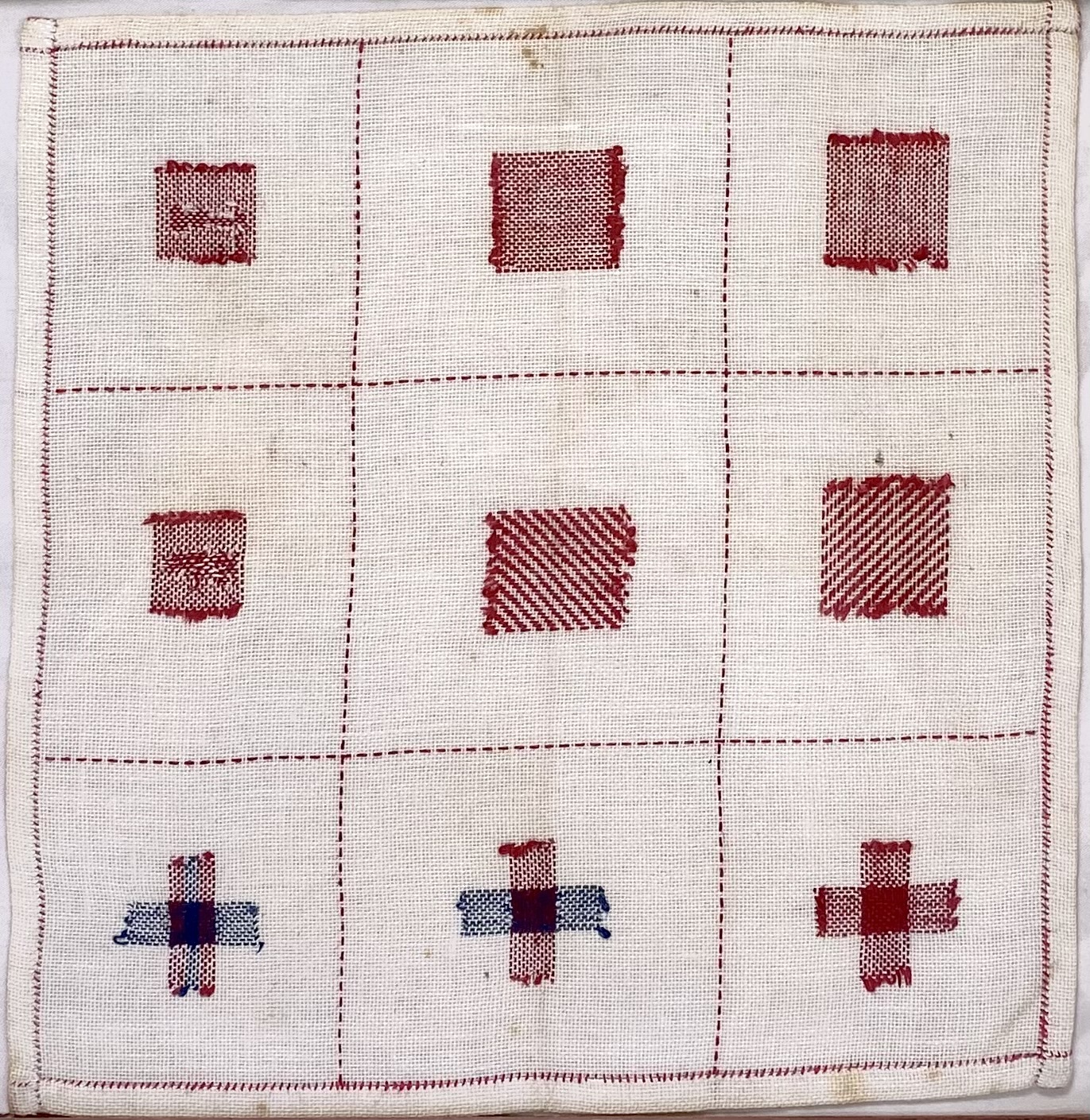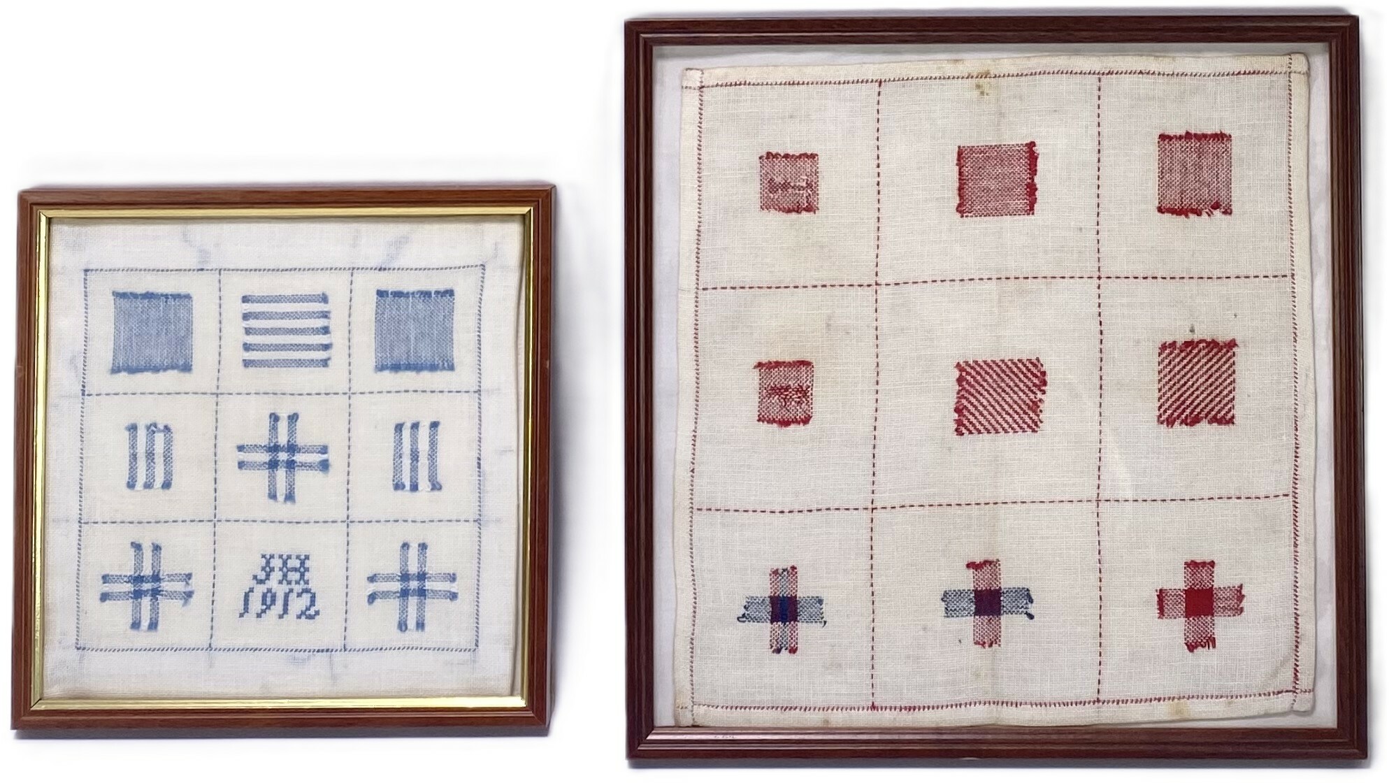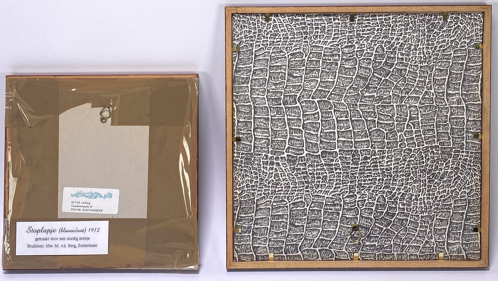 Twee merklappen uit begin 20e eeuw, uitgevoerd op linnen met borduurwerk in rood en blauw katoenen garen. De linker lap draagt onderaan de datering 1912 en toont geometrische patronen en kruisvormen, terwijl de rechter lap stopwerk in rood en rood-blauw bevat. Beide stukken zijn ingelijst in houten lijsten en dienden als oefenwerk voor handwerkonderwijs. Registreer nu en bied eenvoudig online mee op deze merklappen! |