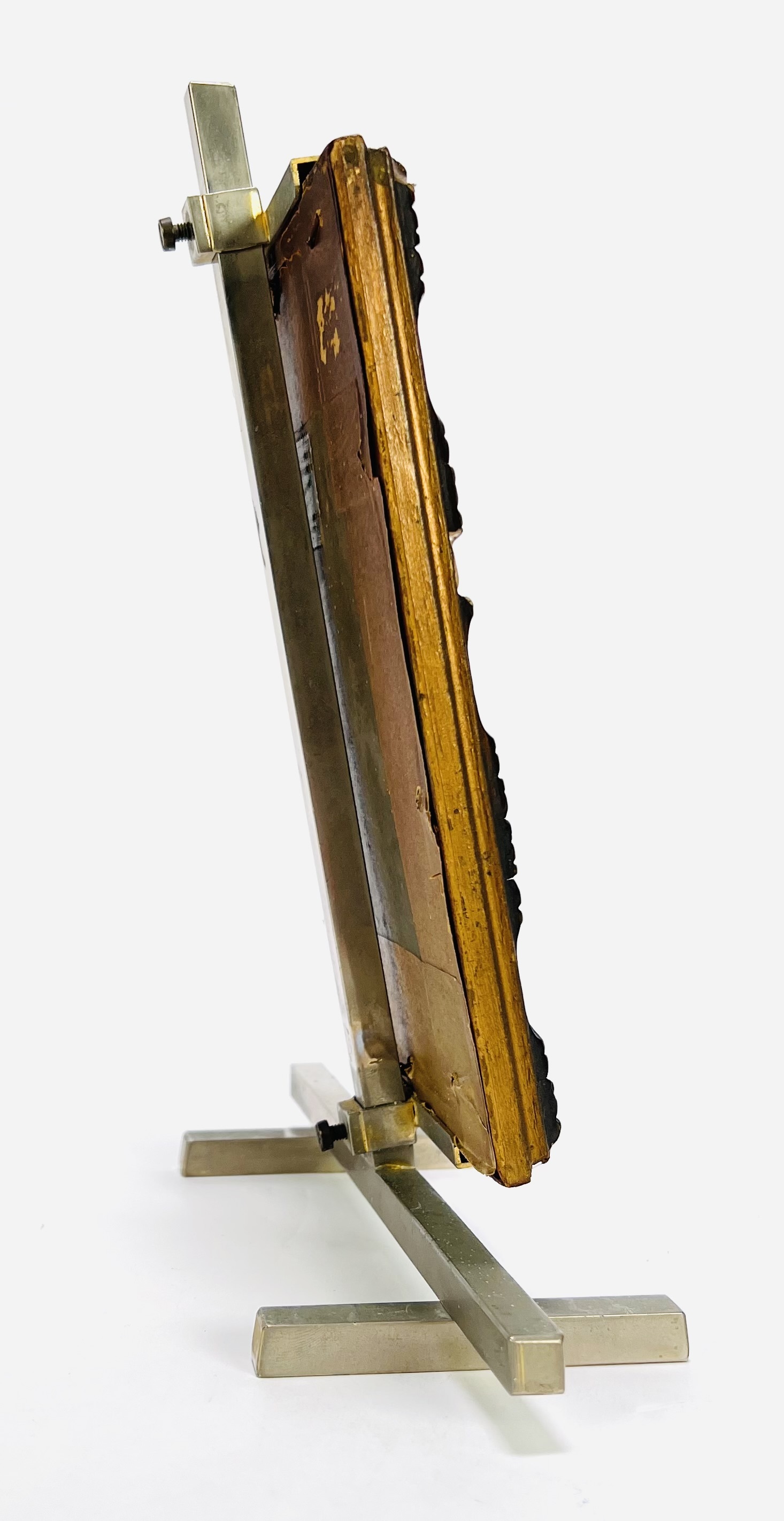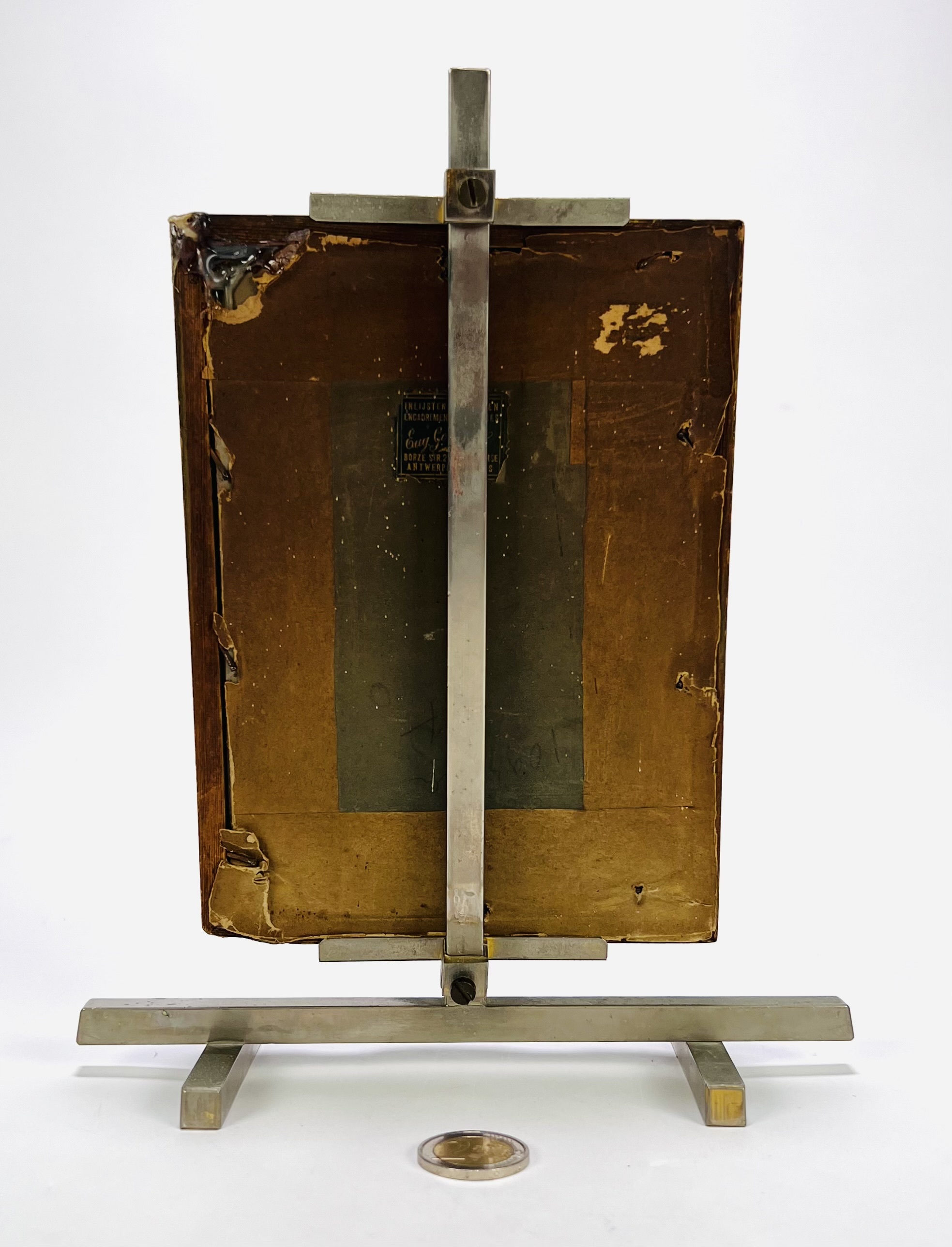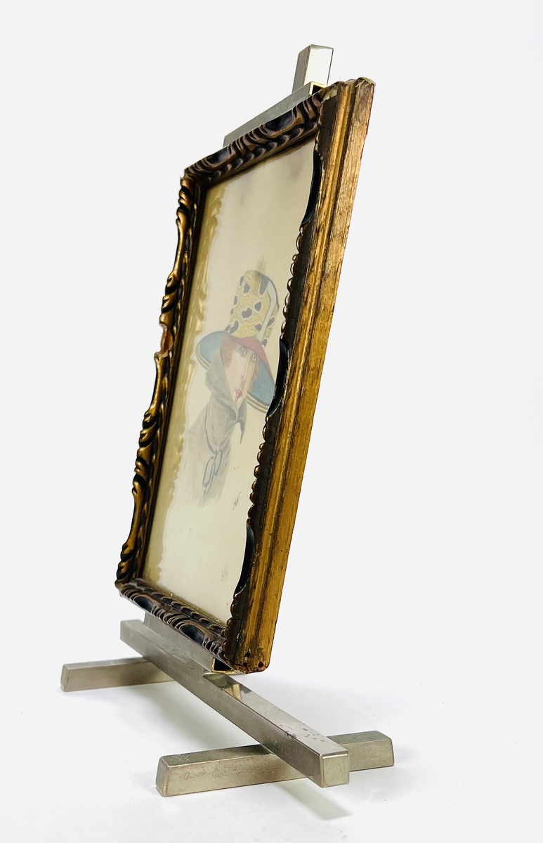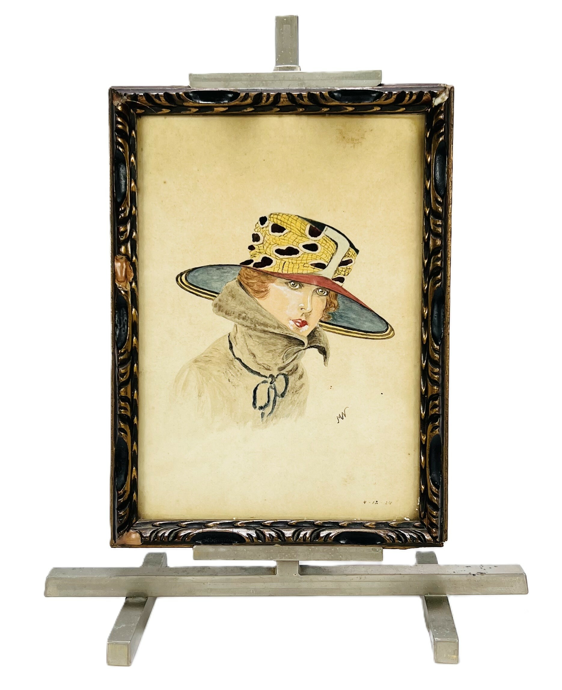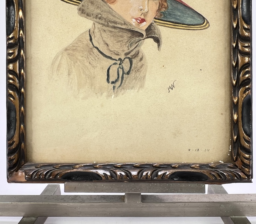 Art Deco aquarel met inkt op papier, gedateerd 4 december 1924 rechtsonder, voorstellend een modieus geklede vrouw met brede hoed en opstaande kraag. Rechts naast de voorstelling gesigneerd “MW”. In originele houten lijst met uitgesneden motieven en goudkleurige accenten, in een Art Deco standaard. Verso etiket van het inlijsten bedrijf Eug. Goossens, Antwerpen. Zeker zijn van deelname? Plaats vanaf 24 augustus een schriftelijk bod online! |