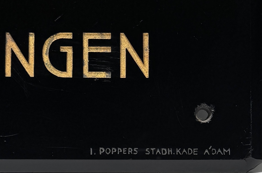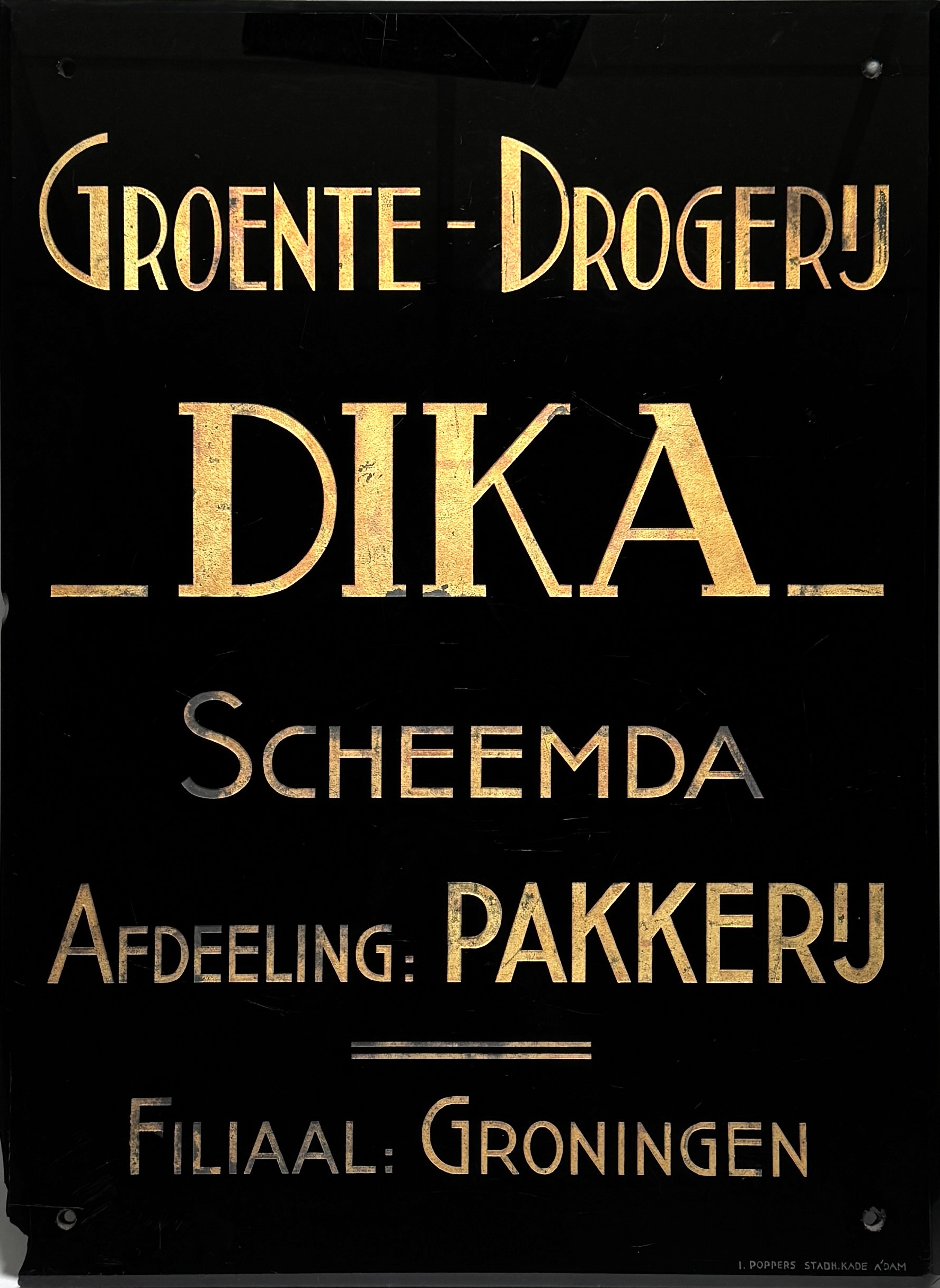 Een Art Deco rechthoekig gevelbord van zwart glas en voorzien van goudkleurige belettering met de tekst 'Groente-Drogerij Dika', 'Afdeeling: Pakkerij' en 'Filiaal: Groningen'. Het gevelbord is aan de onderzijde gemerkt door de maker, I. Poppers, uit Amsterdam. Dit bord is representatief voor winkelreclame van de jaren twintig. Registreer nu en bied eenvoudig online mee op dit gevelbord! |