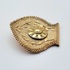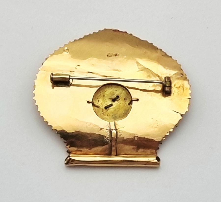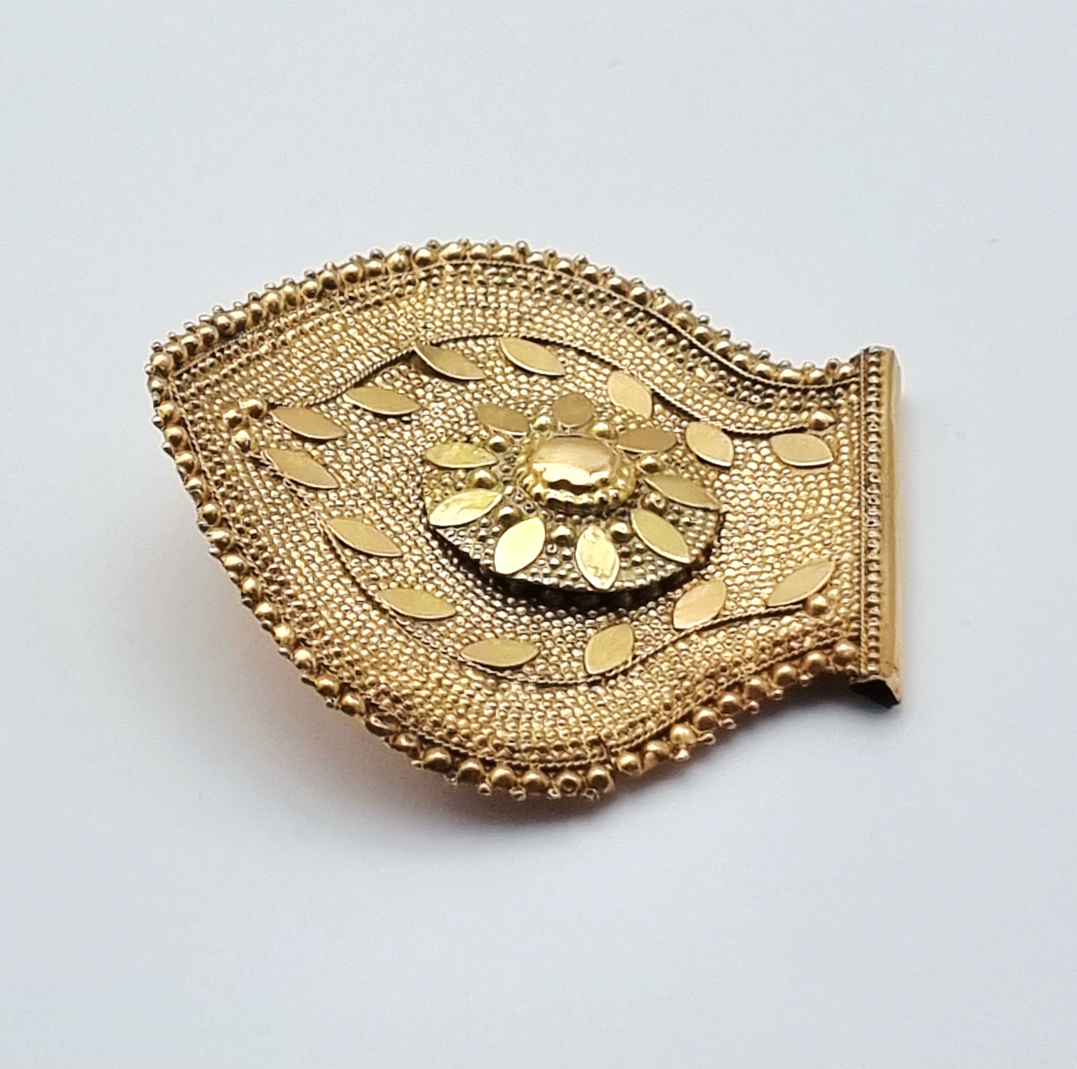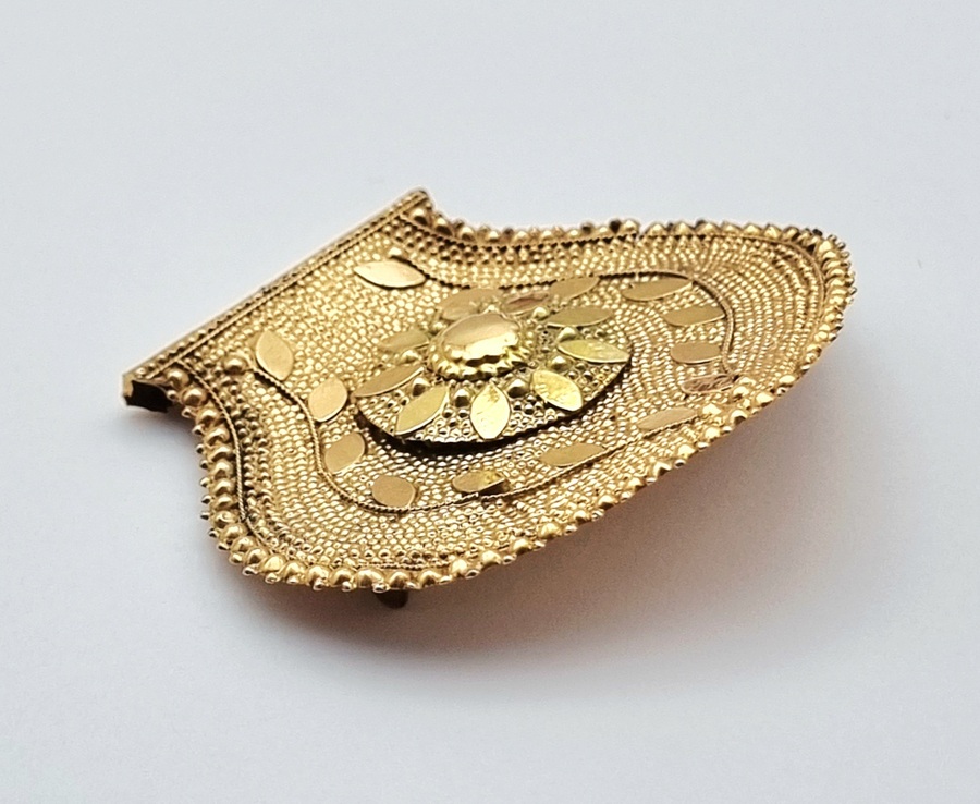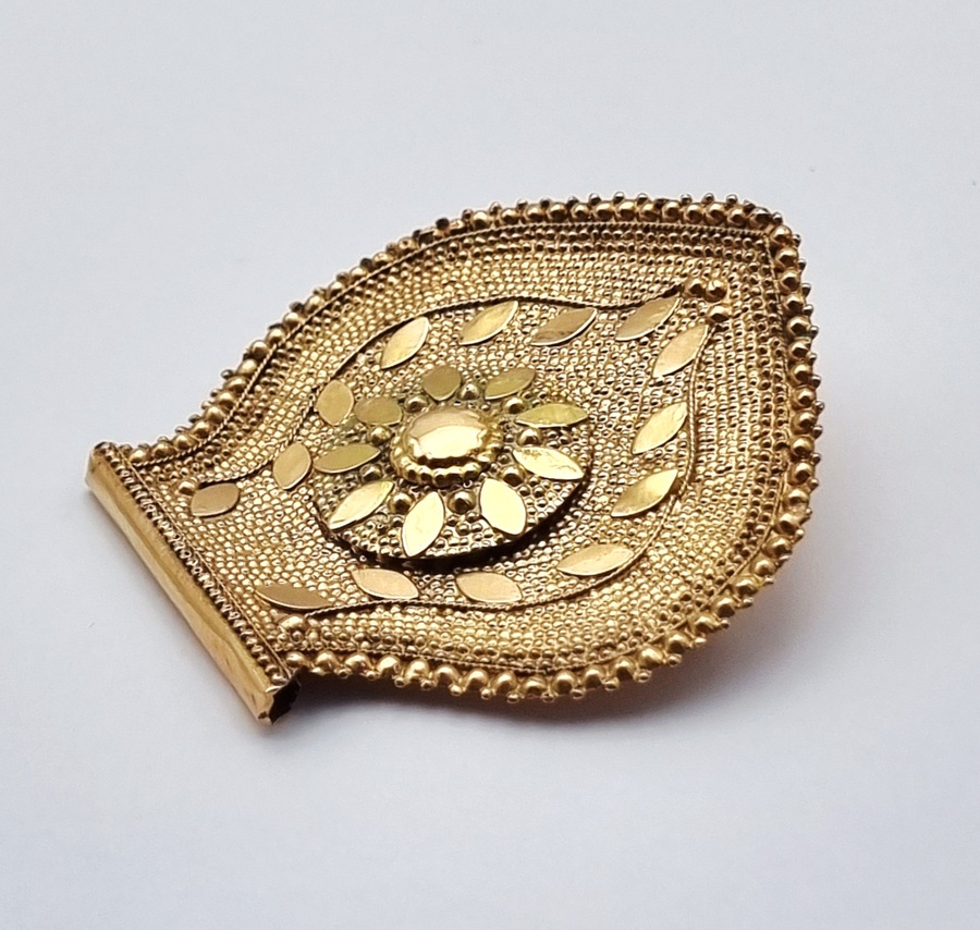 Gouden broche, 20e eeuw, getoetst 14 karaat. De waaiervormige broche, onderdeel van een oorijzer, is uitgevoerd in goud met een centraal bloemmotief, omringd door gestileerde bladornamenten en een decoratieve granulatie langs de randen. De achterzijde is voorzien van een eenvoudige naaldsluiting. Geïnteresseerd? Bezoek onze kijkdagen voor een persoonlijke bezichtiging! |