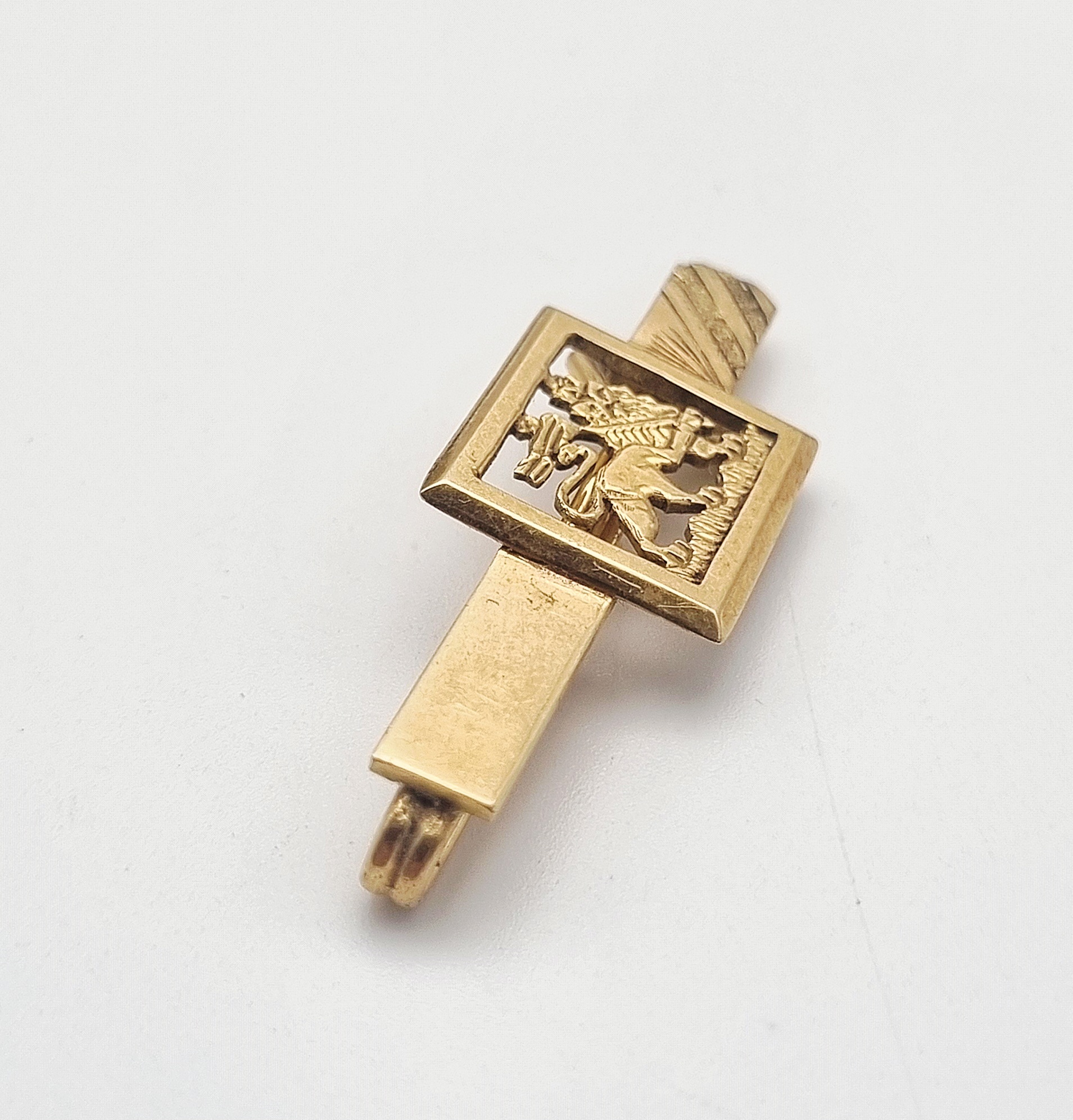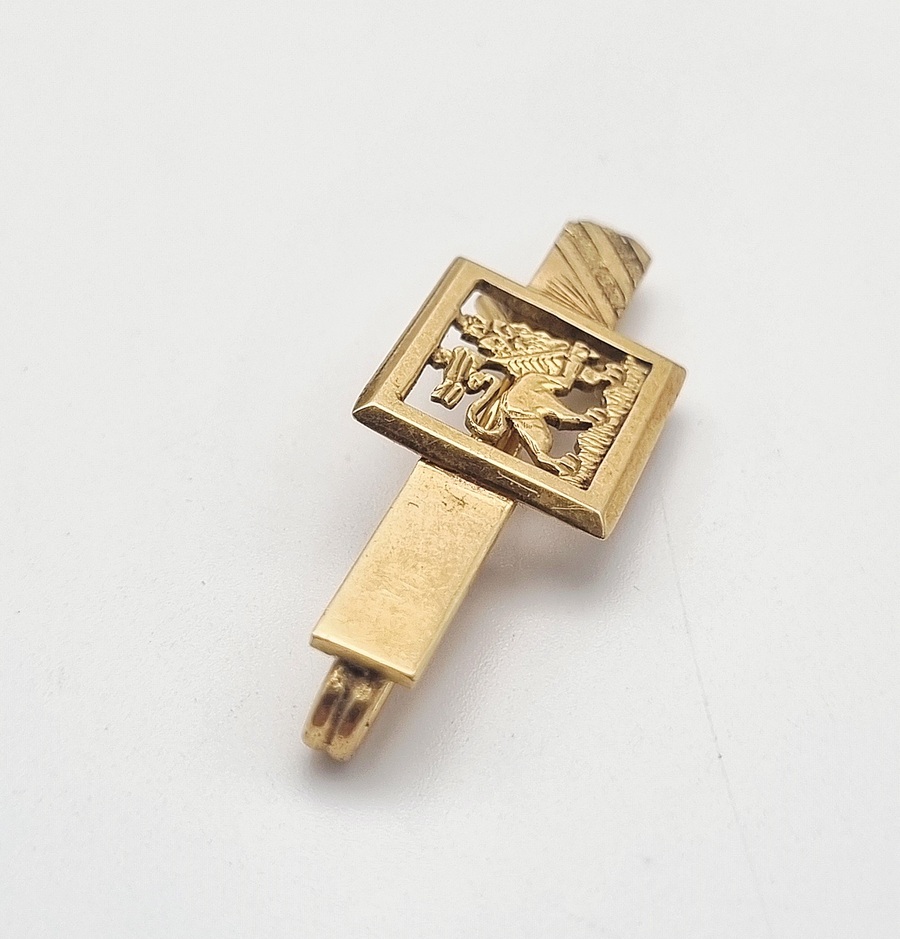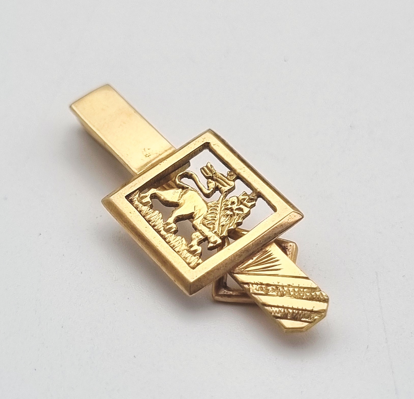 14 karaat gouden dasspeld in heraldieke stijl met centraal de Leeuw van Juda en kruisbanier, Ethiopië, 20e eeuw. De dasspeld is vervaardigd met gegraveerde details, omlijst in een vierkant kader met geometrische accenten. Registreer nu en bied eenvoudig online mee op deze broche! |