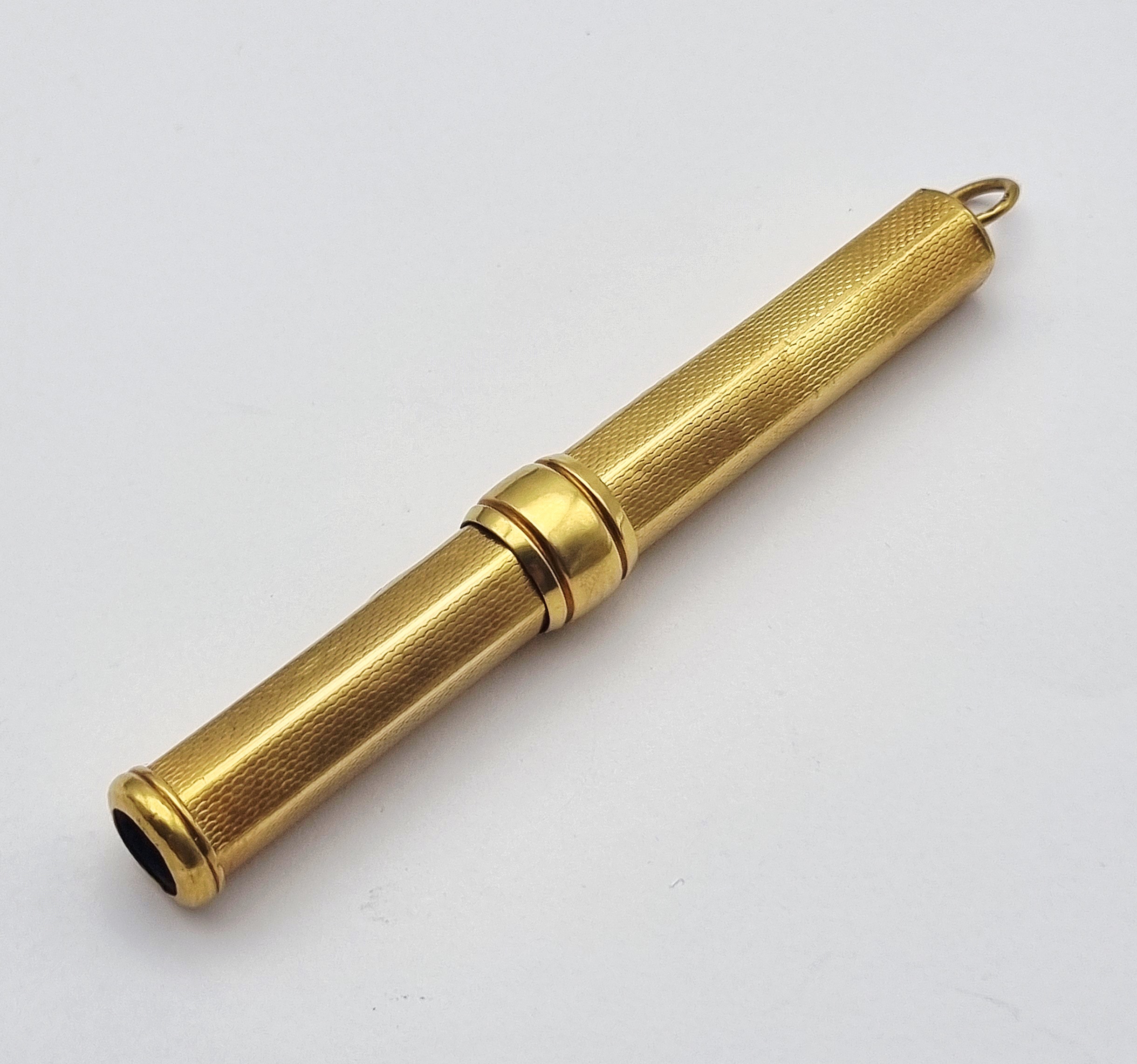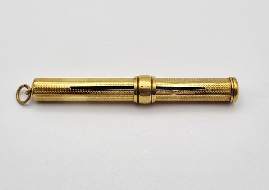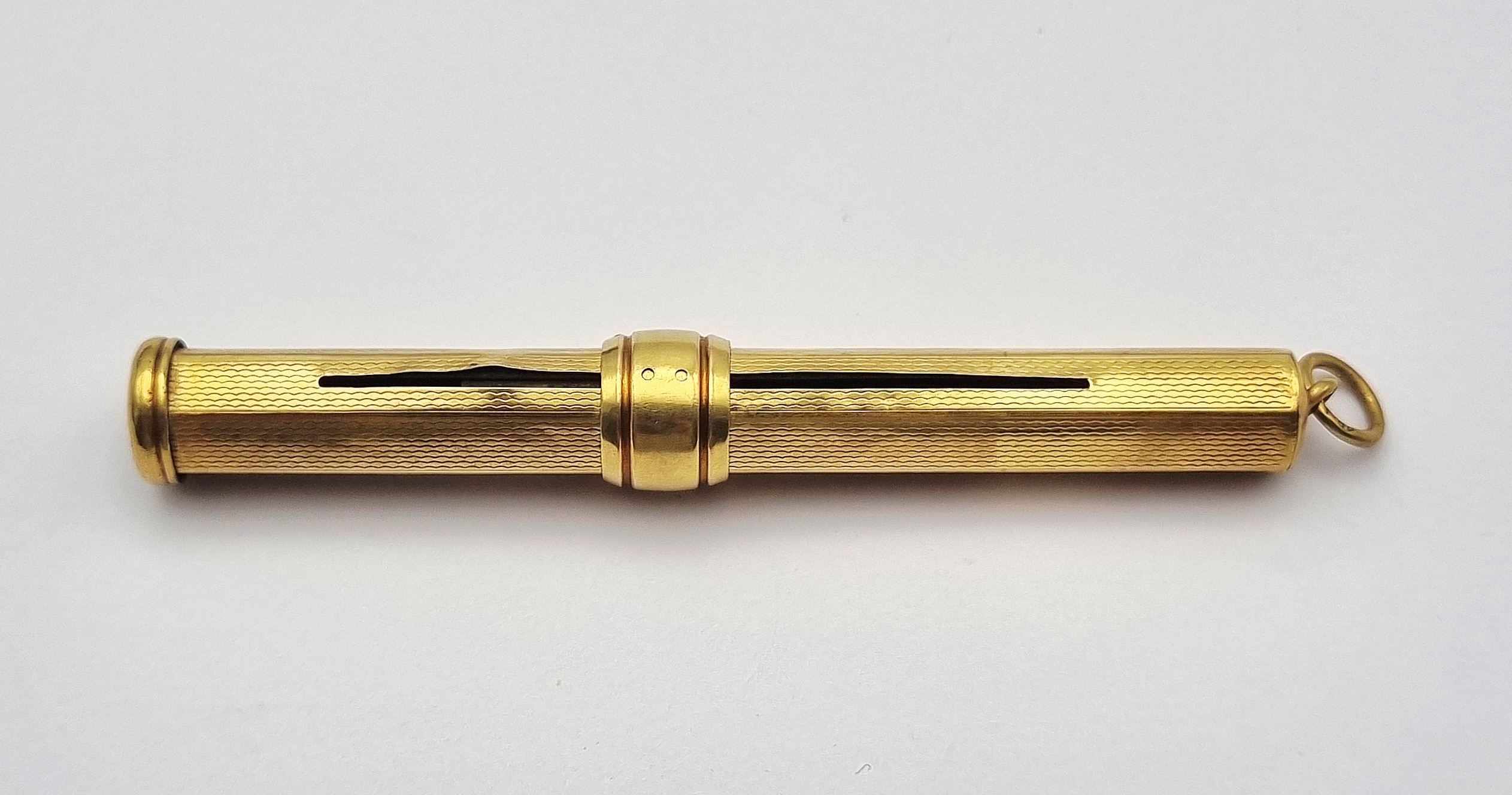 18 karaat gouden vulpotlood, eind 19e–begin 20e eeuw, uitgevoerd in 18 karaat goud en voorzien van fijn guilloche patroon. Het cilindrische model is gemerkt 18 ct. Kom langs tijdens de kijkdagen (29 t/m 31 augustus) en ontdek dit gouden vulpotlood zelf! |