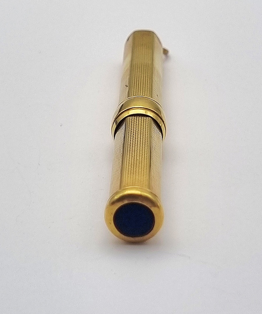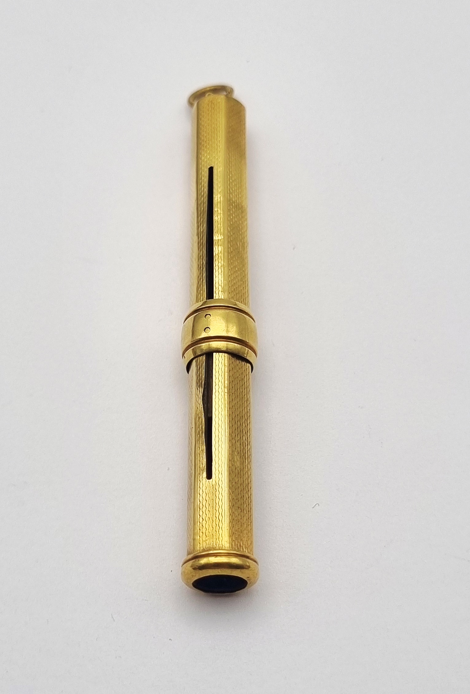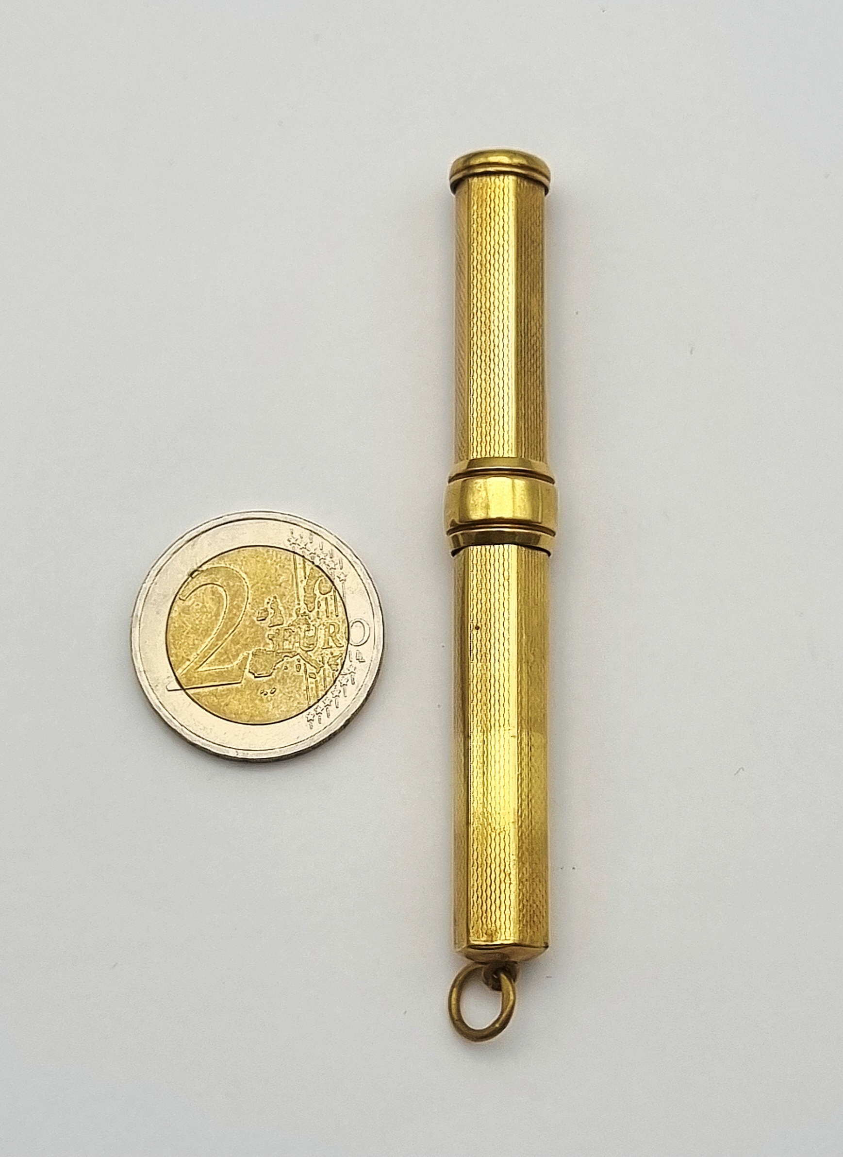 18 karaat gouden vulpotlood, eind 19e–begin 20e eeuw, uitgevoerd in 18 karaat goud en voorzien van fijn guilloche patroon. Het cilindrische model is gemerkt 18 ct. Kom langs tijdens de kijkdagen (29 t/m 31 augustus) en ontdek dit gouden vulpotlood zelf! |