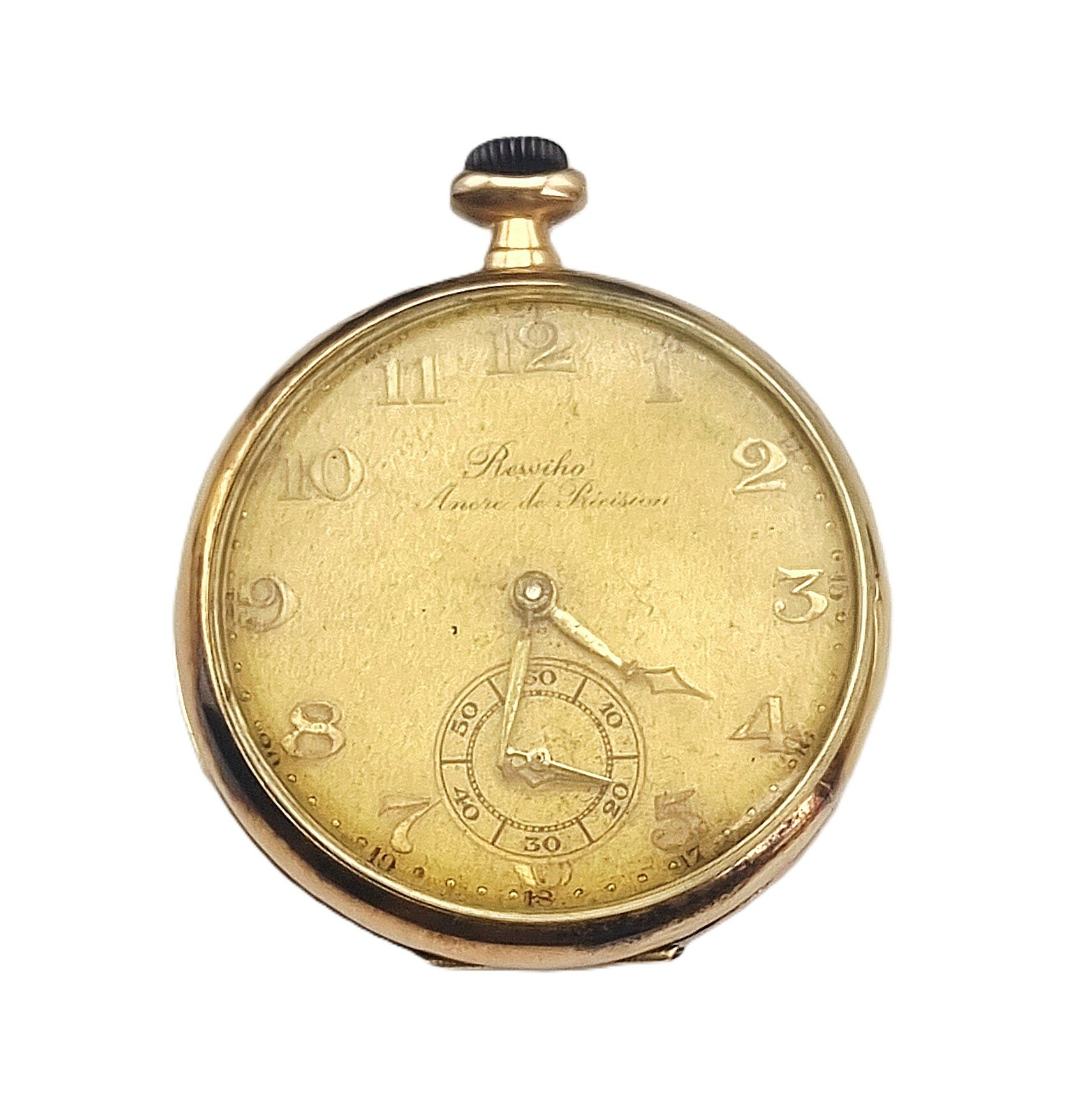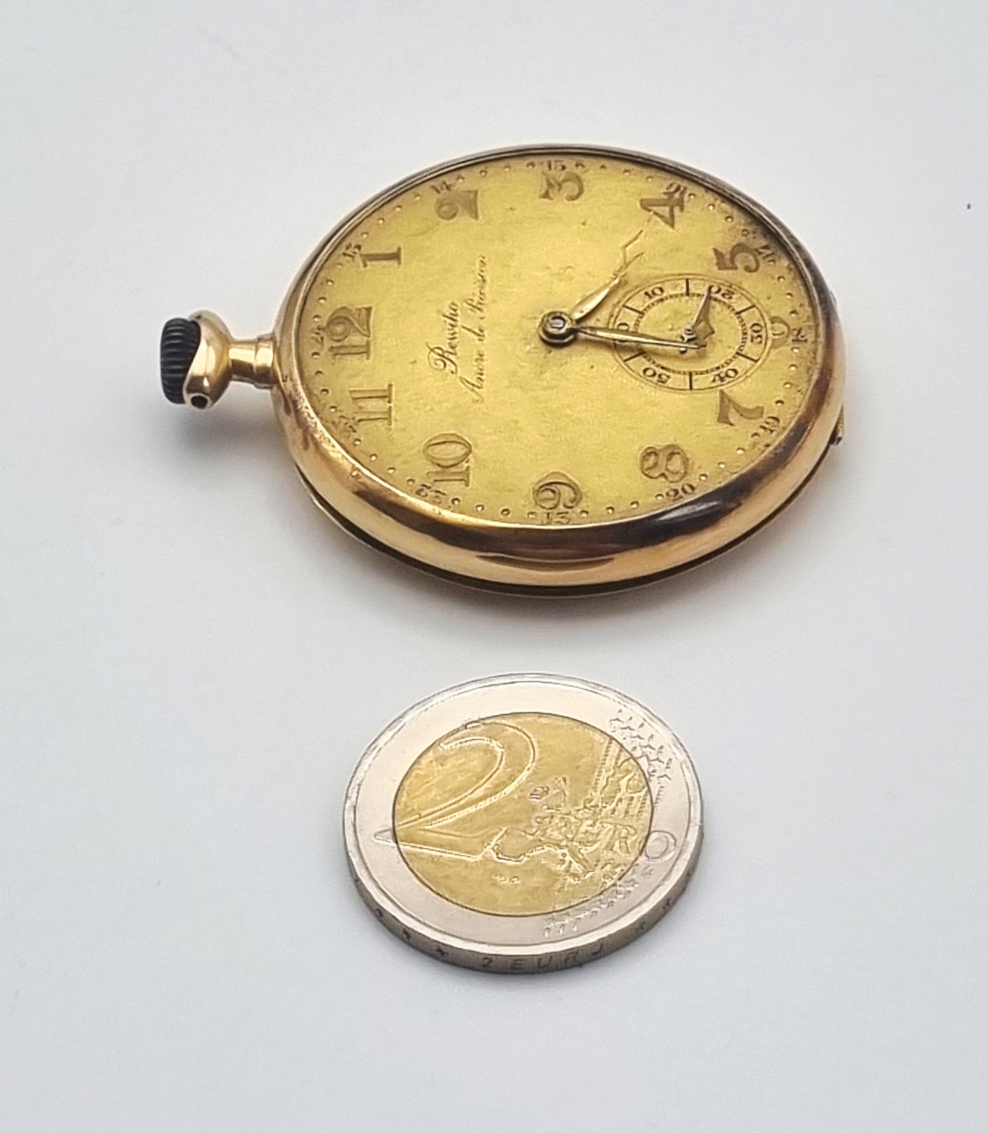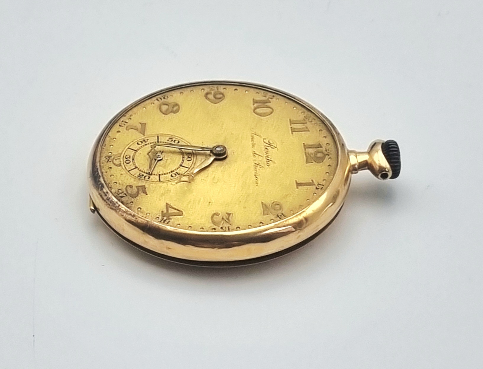 14 karaat gouden zakhorloge, midden 20e eeuw, met ronde kast, gladde buitenzijde en gehamerd patroon aan de binnenzijde, voorzien van serienummer en gemerkt 14 karaat. De goudkleurige wijzerplaat draagt Arabische cijfers, een kleine secondewijzer op zes uur en de signatuur “Rewiho Ancre de Précision”. Mechanisch uurwerk met handopwinding en zwarte opwindknop. Geïnteresseerd? Bezoek onze kijkdagen voor een persoonlijke bezichtiging! |