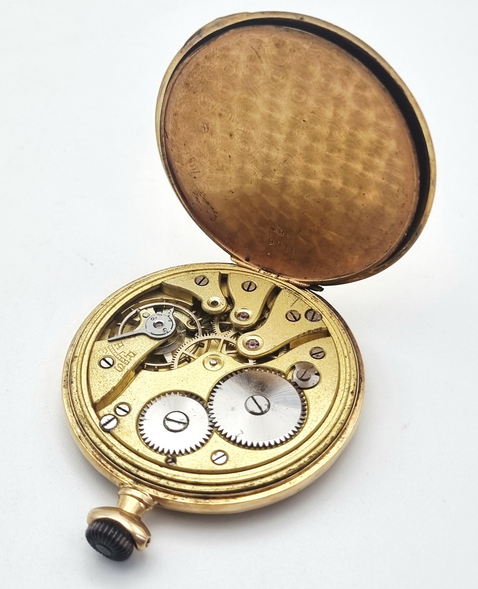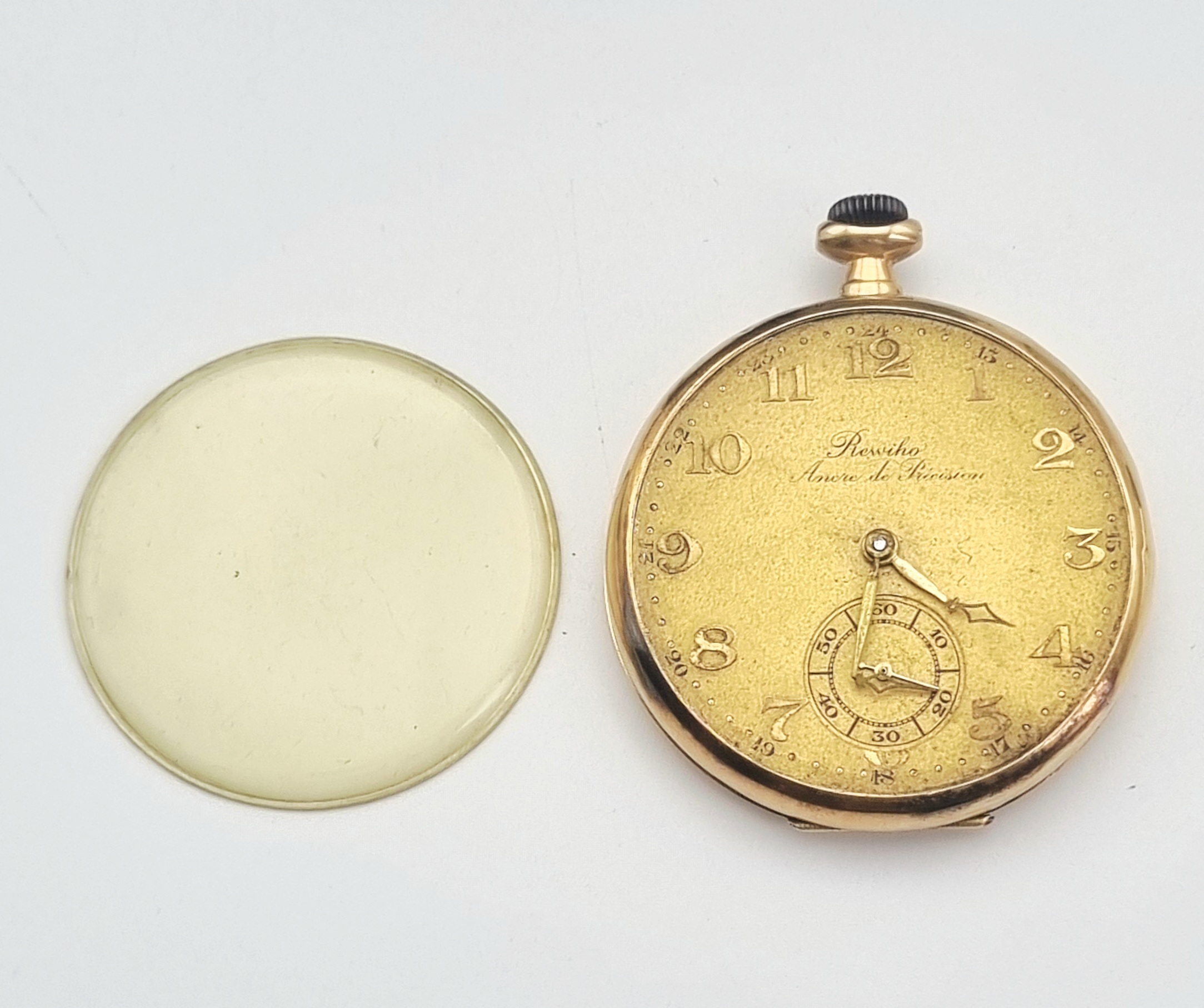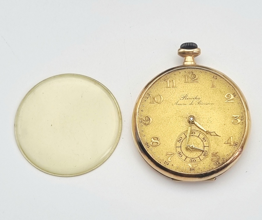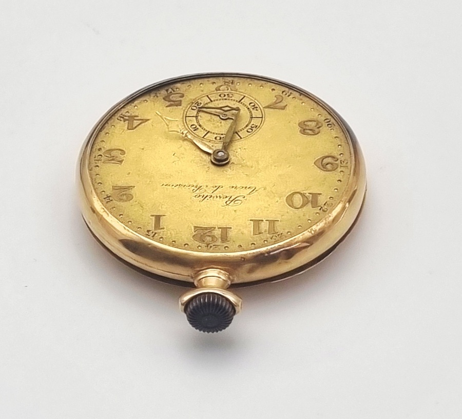 14 karaat gouden zakhorloge, midden 20e eeuw, met ronde kast, gladde buitenzijde en gehamerd patroon aan de binnenzijde, voorzien van serienummer en gemerkt 14 karaat. De goudkleurige wijzerplaat draagt Arabische cijfers, een kleine secondewijzer op zes uur en de signatuur “Rewiho Ancre de Précision”. Mechanisch uurwerk met handopwinding en zwarte opwindknop. Geïnteresseerd? Bezoek onze kijkdagen voor een persoonlijke bezichtiging! |