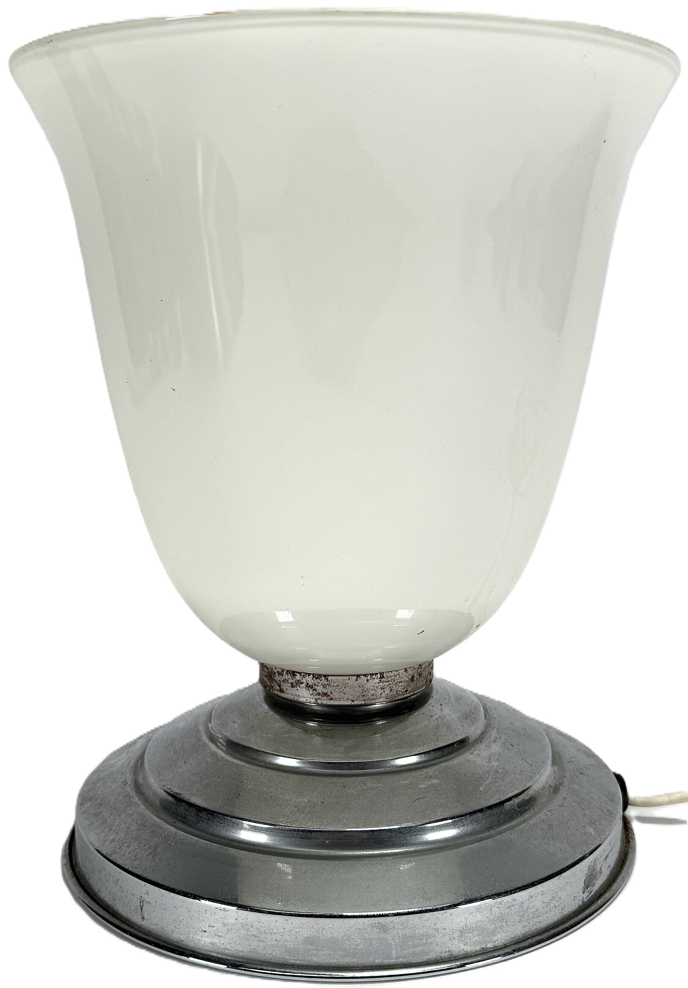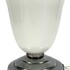 Art deco tafellamp, eerste helft 20e eeuw, uitgevoerd in wit opaline glas en verchroomd metaal. De kap heeft een tulpvormige uitwaaierende vorm en rust op een ronde voet met trapsgewijze ringen. Kenmerkend zijn de strakke geometrische vormgeving en de materiaalcombinatie die typerend is voor Art Deco. Kom langs tijdens de kijkdagen (29 t/m 31 augustus) en ontdek deze lamp zelf! |