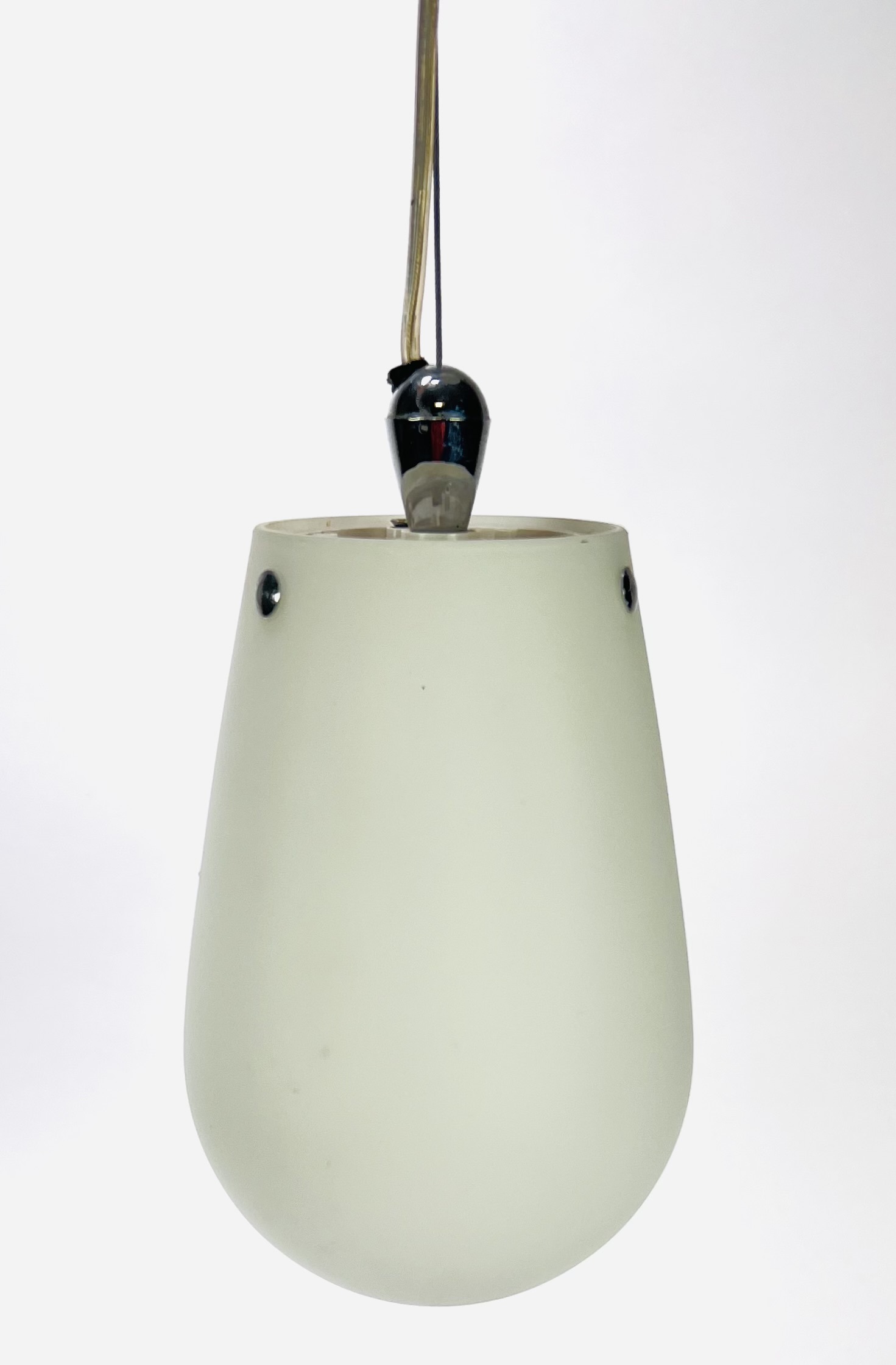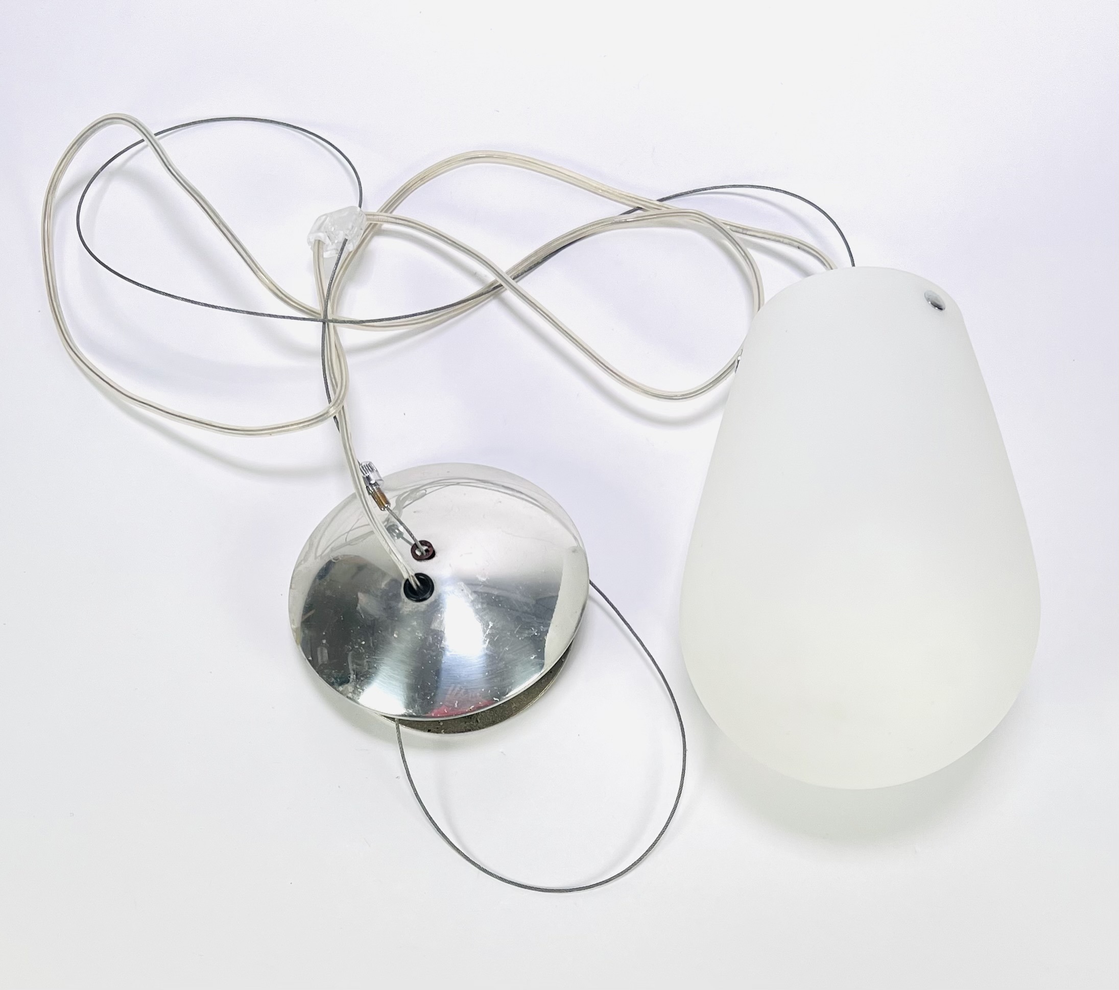 Hanglamp in modernistische stijl, vervaardigd in de tweede helft van de 20e eeuw, bestaande uit een handgeblazen peervormige kap van mat wit Murano glas, bevestigd met metalen schroeven en chromen ophangdeel. Aanwezig is een chromen plafondkap met transparant snoer en staalkabel. De lamp draagt een label "Vetro Murano Originale". Deze hanglamp zelf beoordelen? Je bent welkom op onze kijkdagen op 29, 30 en 31 augustus! |