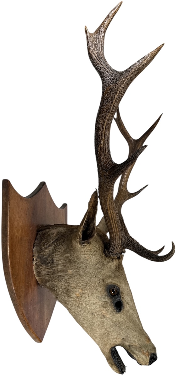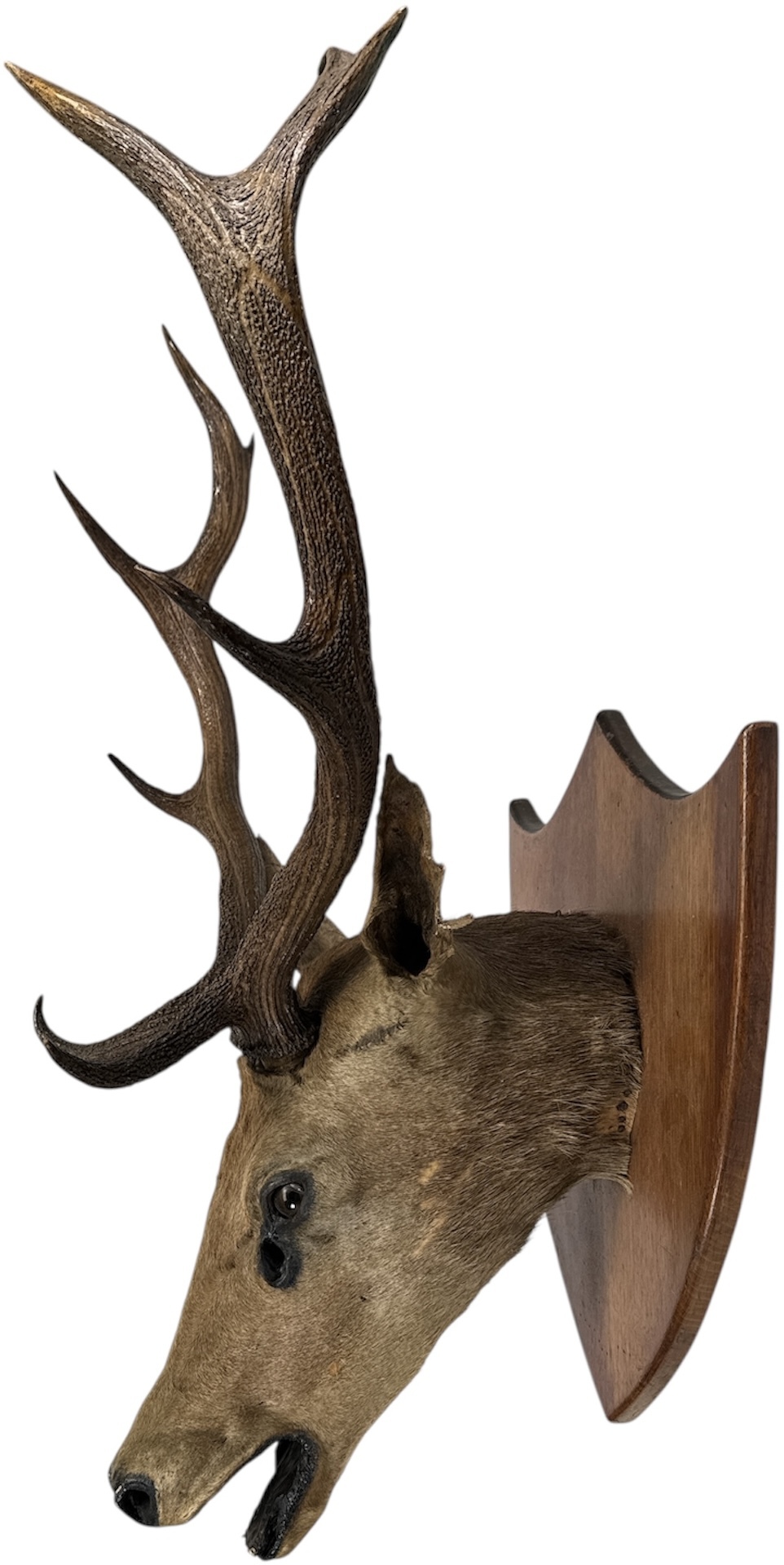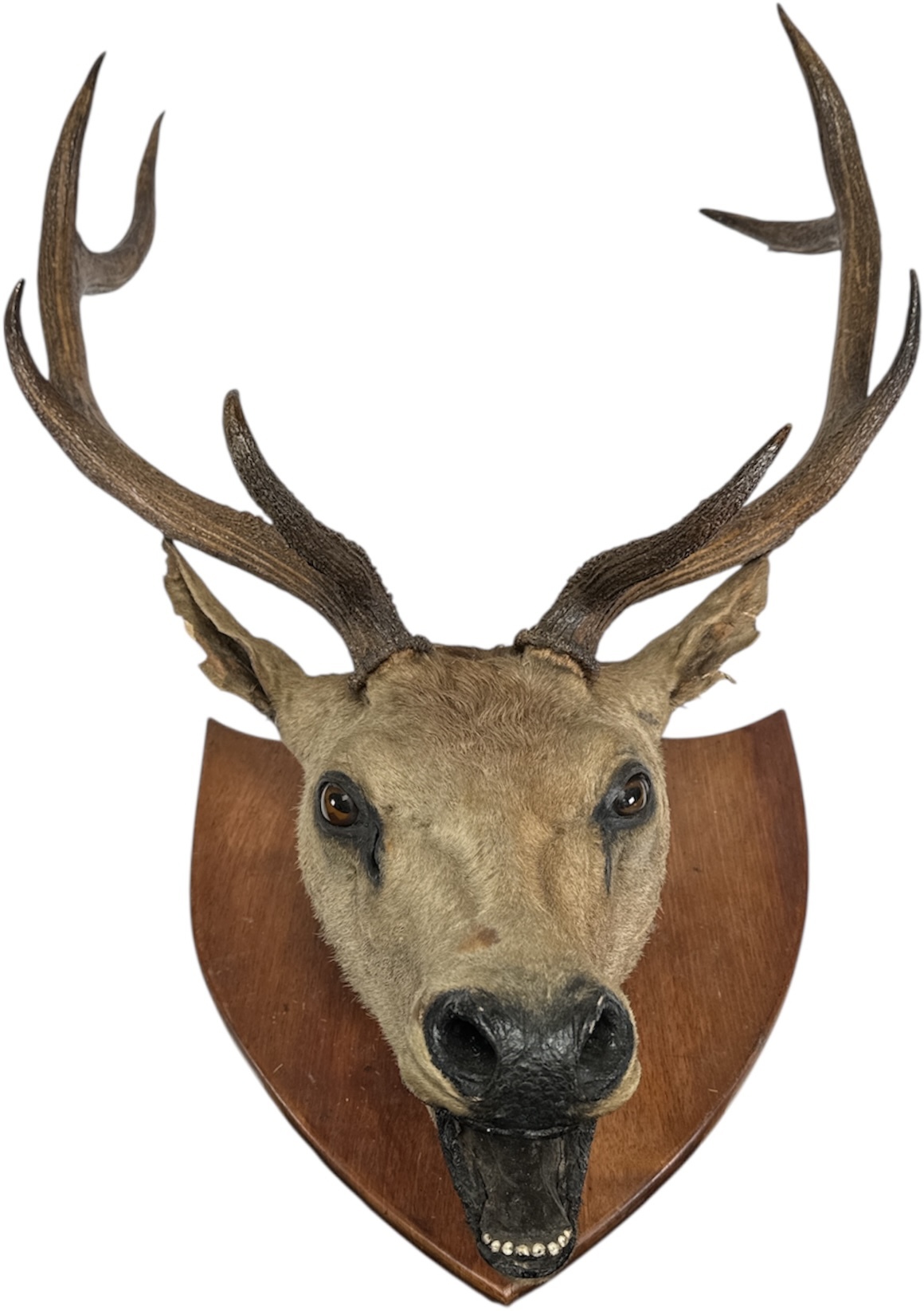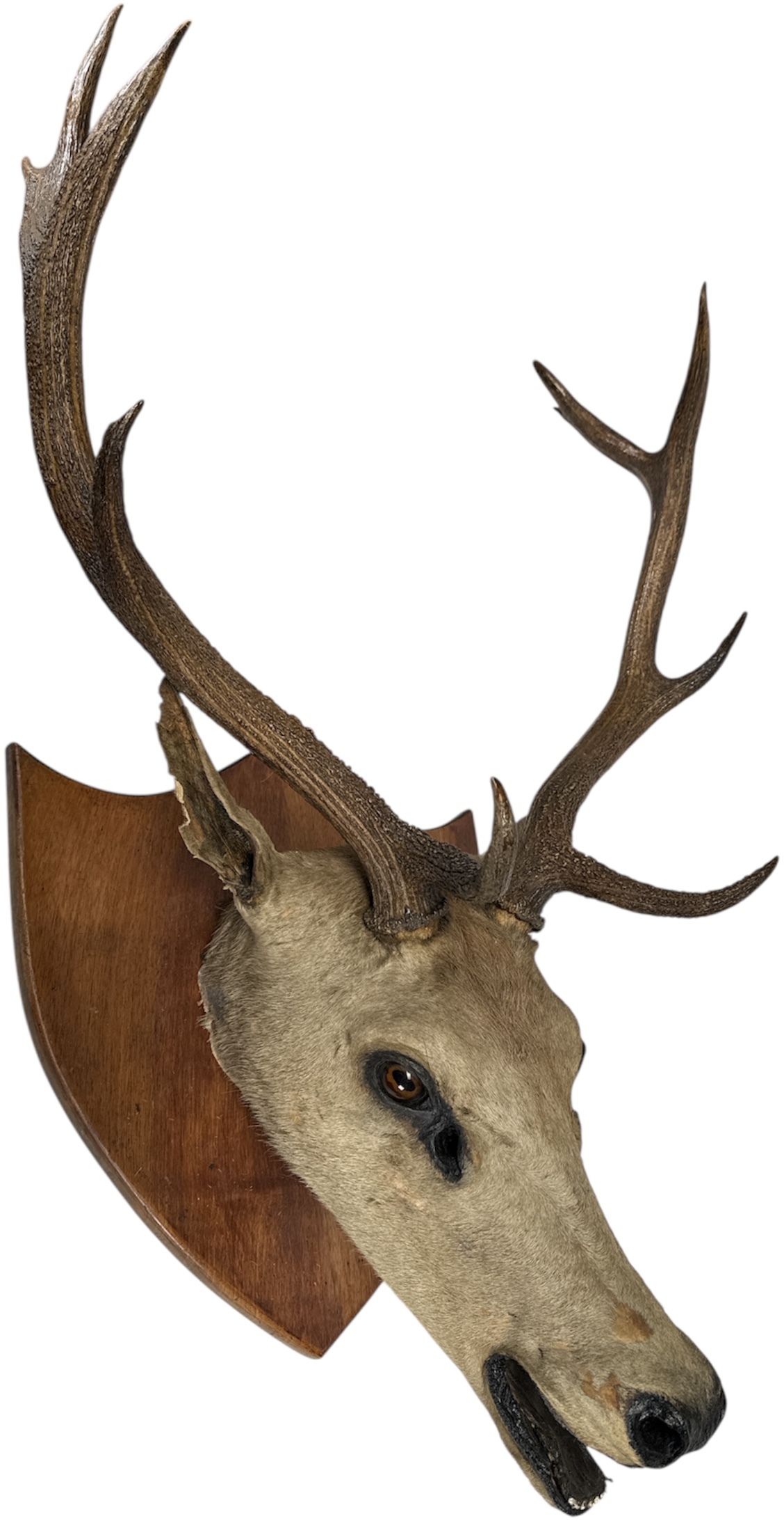 Hertenkop op houten schild, uitgevoerd in naturalistische taxidermiestijl, midden 20e eeuw. De geprepareerde kop met volledig gewei is gemonteerd op een schildvormige houten drager. De ogen zijn uitgevoerd in glas en de bek is half geopend waardoor de tanden zichtbaar zijn. Wil je de hertenkop in het echt bekijken? Kom naar de kijkdagen op 29, 30 en 31 augustus! |
