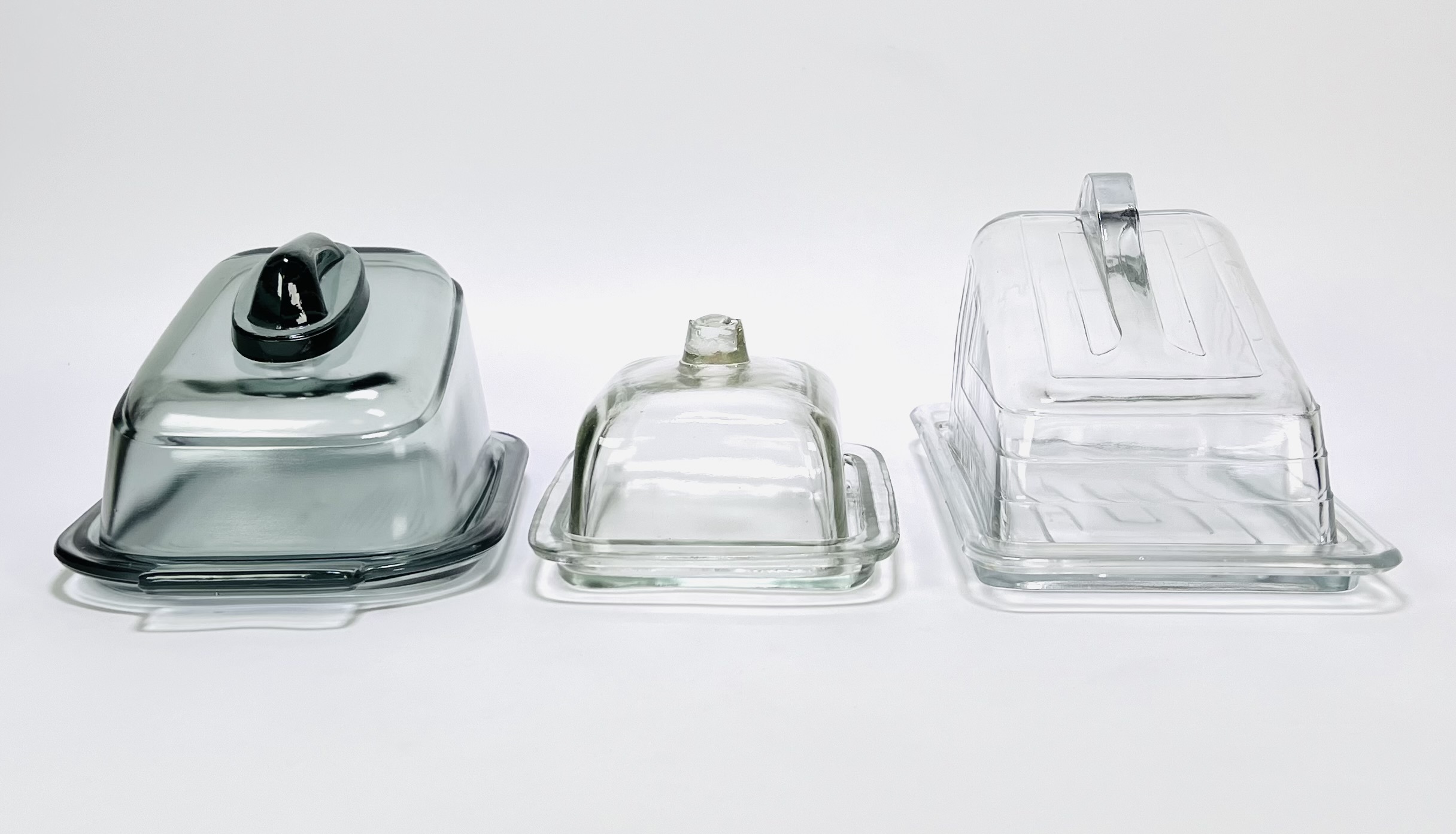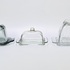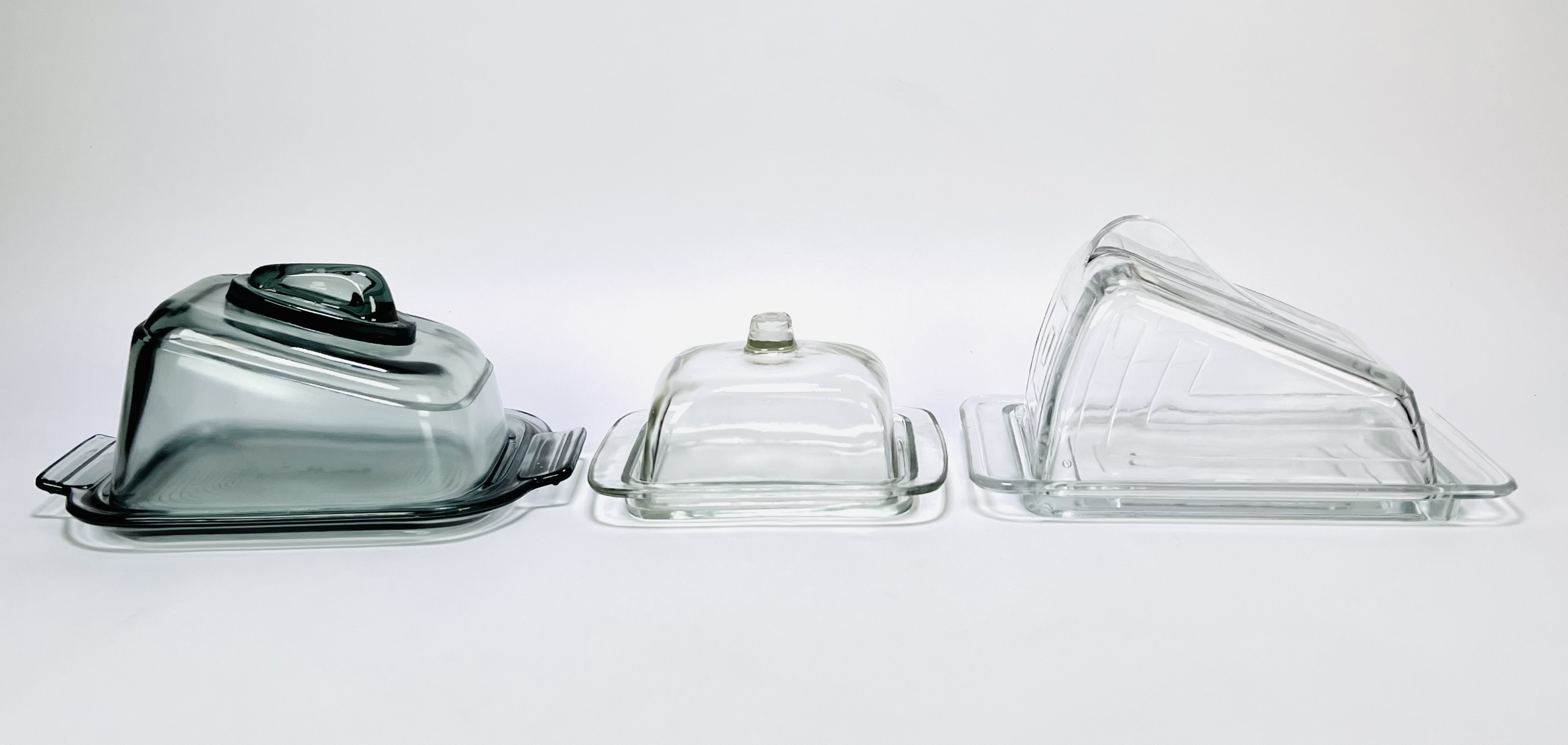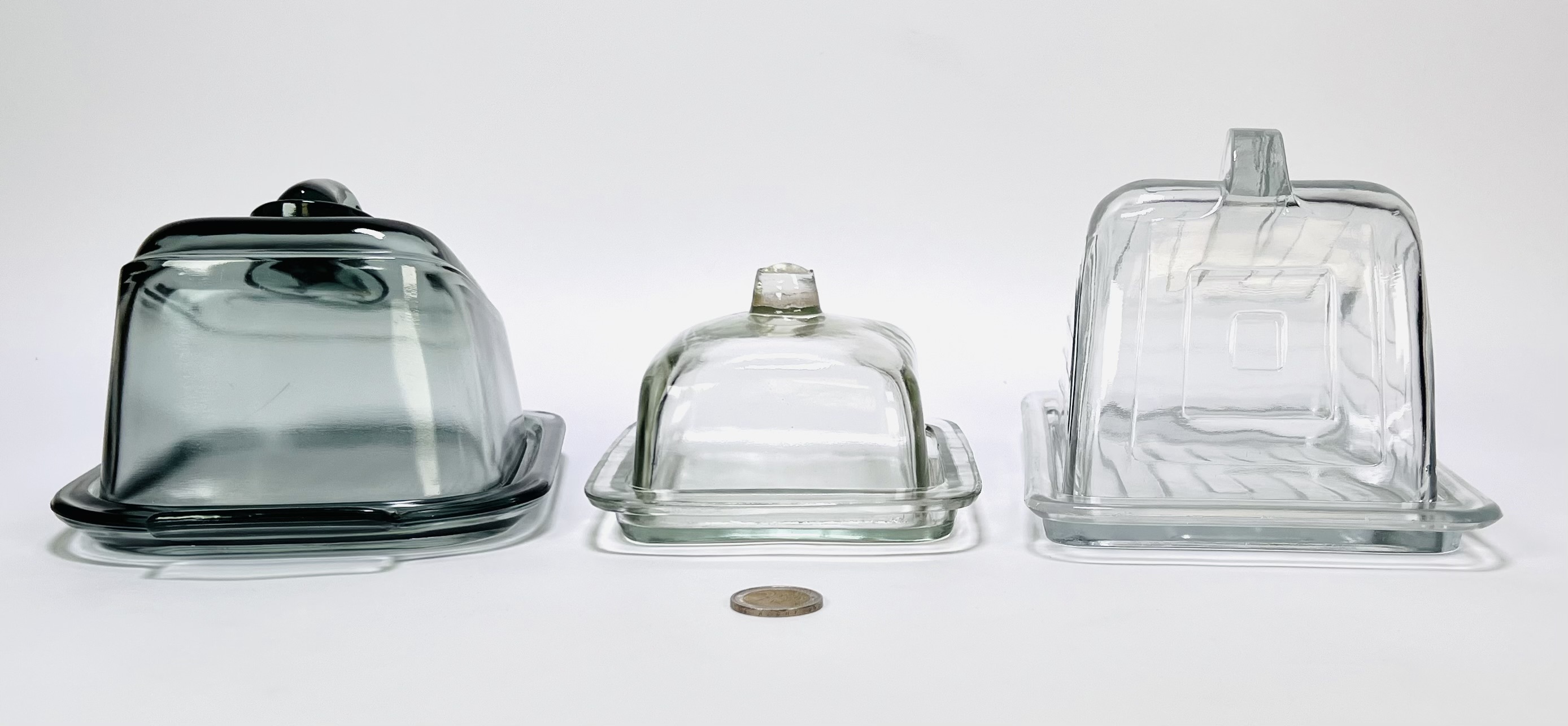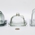 Drie verschillende kaasstolpen van persglas in een modernistische stijl. Een kaasstolp van grijsblauw glas en twee helder glazen kaasstolpen. Nederland, jaren '50. Kom langs tijdens de kijkdagen (29 t/m 31 augustus) en ontdek deze kaasstolpen zelf! |