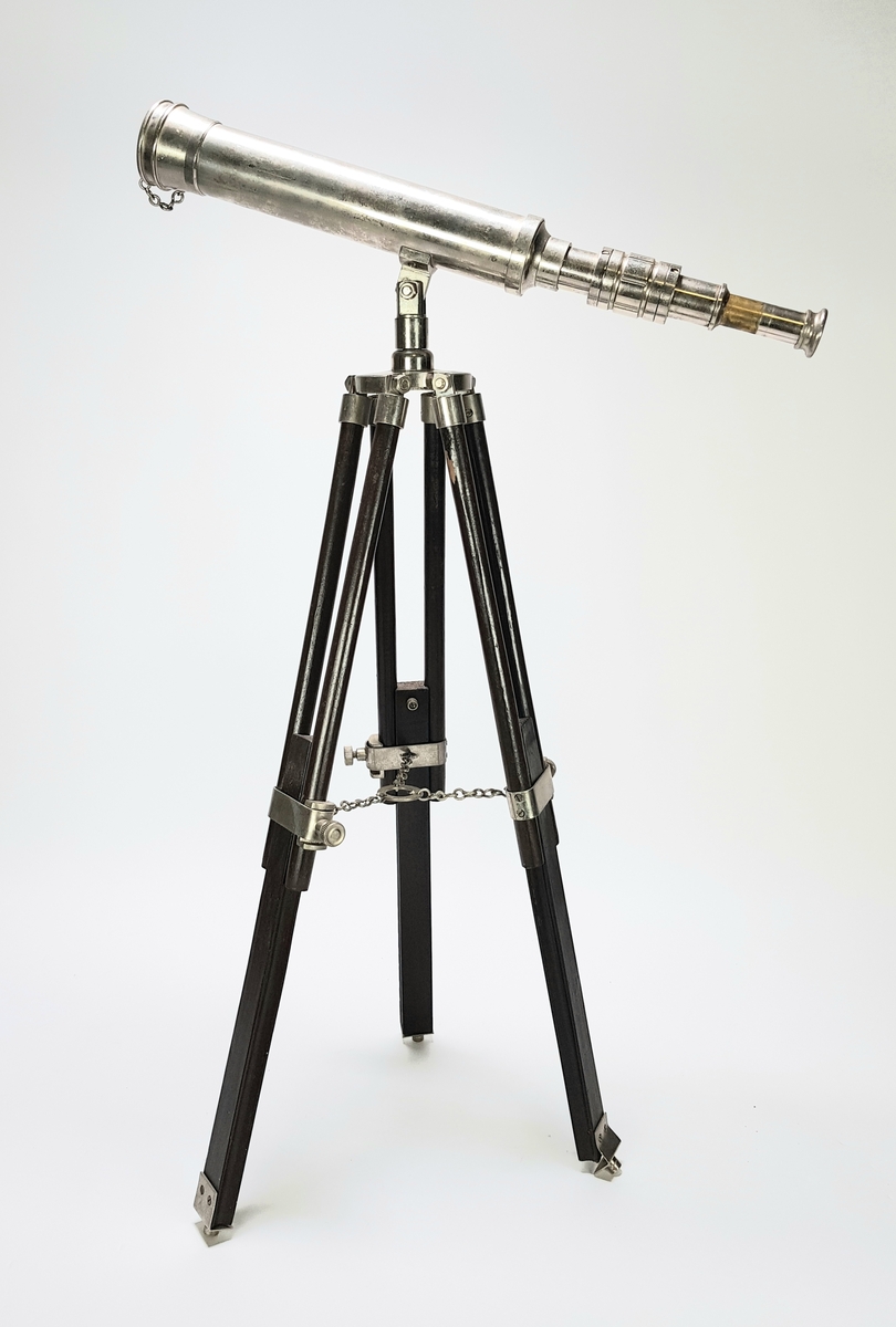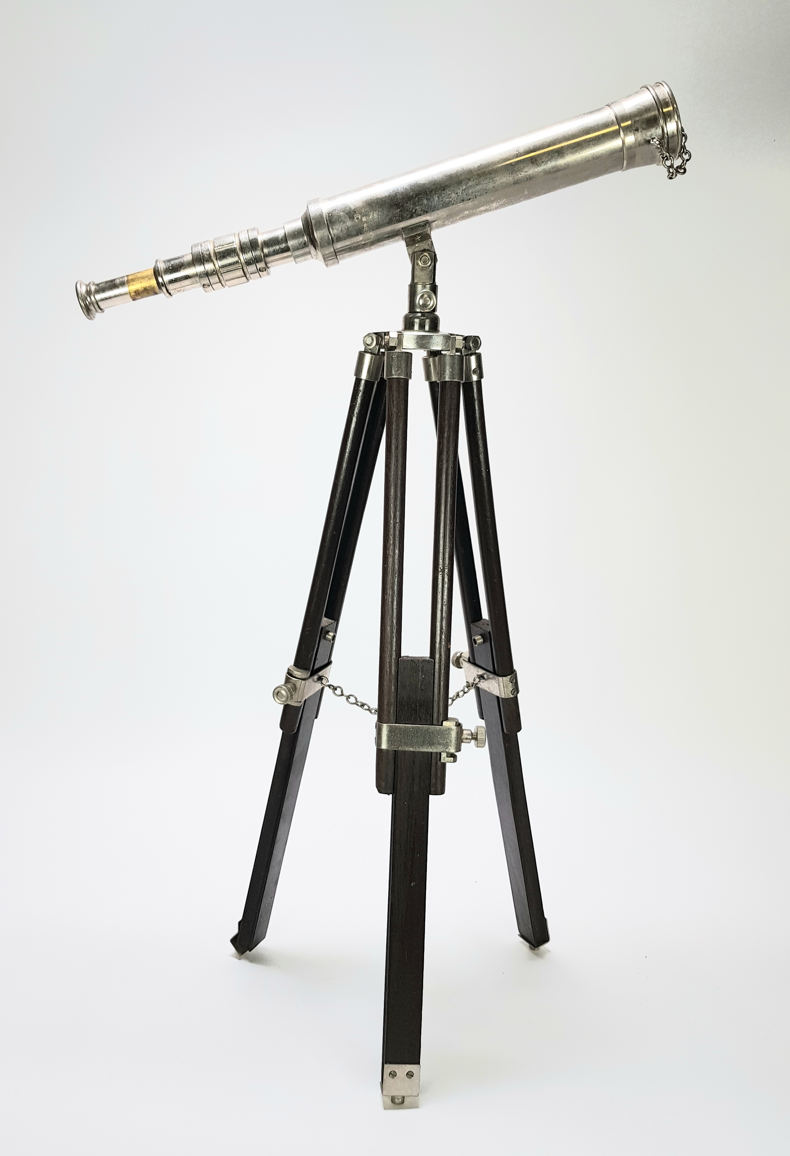 Telescoop op statief midden 20e eeuw. De kijker is gemaakt van verchroomd metaal met gekartelde randen en uitschuifbare delen. Het statief bestaat uit drie donkerhouten poten die met metalen elementen aan elkaar verbonden zijn. Wil je deze telescoop in het echt bekijken? Kom naar de kijkdagen op 29, 30 en 31 augustus! |
