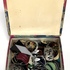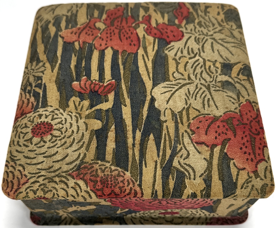 Een rechthoekig houten kistje, bekleed met bedrukt textiel en een floraal Art Nouveau-achtig patroon. Het interieur van het kistje is afgewerkt met een crèmekleurige stof. De inhoud bestaat uit een diverse collectie van sieraden, waaronder hangers en broches in verschillende vormen. De sieraden zijn vervaardigd van metaal en kunststof en vertegenwoordigen een gevarieerde samenstelling. Zien voordat u biedt? Bezoek onze kijkdagen op 29, 30 en 31 augustus van 11:00 tot 17:00 uur! |