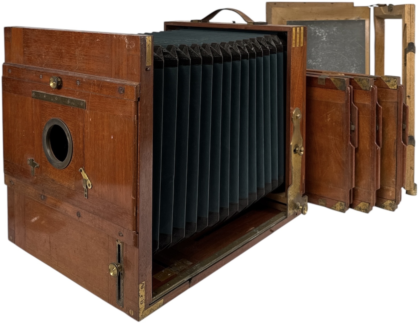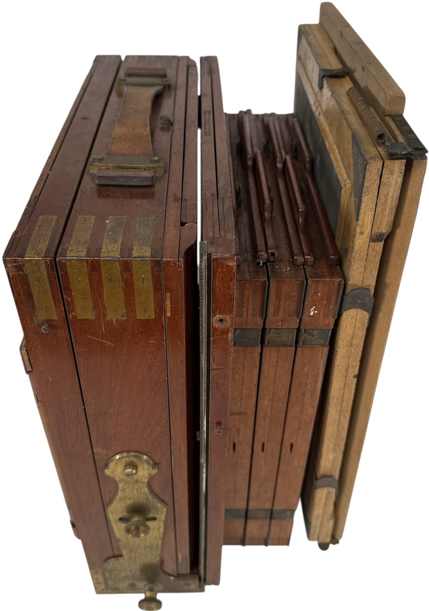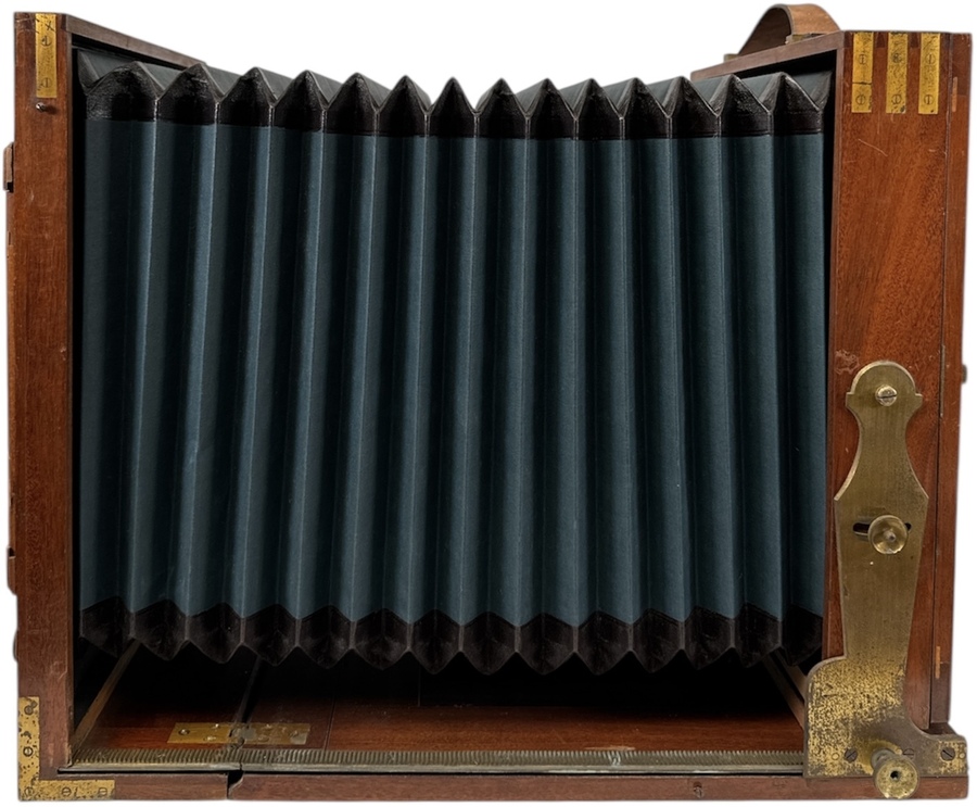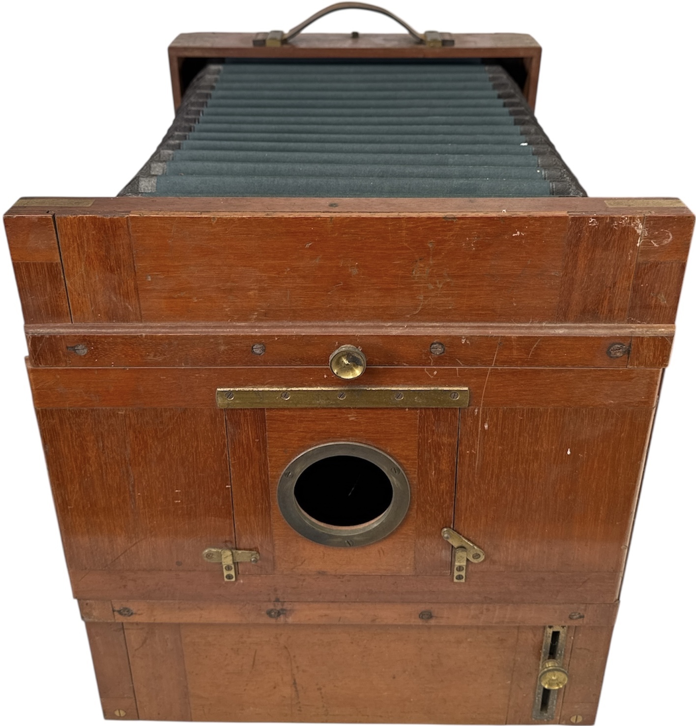 Mahoniehouten klassieke fotocamera met messing beslag en leren draaggreep, eind 19e eeuw tot begin 20e eeuw. De camera is uitgevoerd als klapmodel met zwarte vouwbalg, schuifrail en meerdere insteekcassettes voor glasplaten. Aan de voorzijde bevindt zich een ronde lensopening, de achterzijde heeft een verwijderbaar matglas voor scherpstelling. Op de hoeken zijn messing maatstripjes aangebracht. Geïnteresseerd? Bezoek onze kijkdagen op 29, 30 of 31 augustus van 11:00 tot 17:00 uur! |
