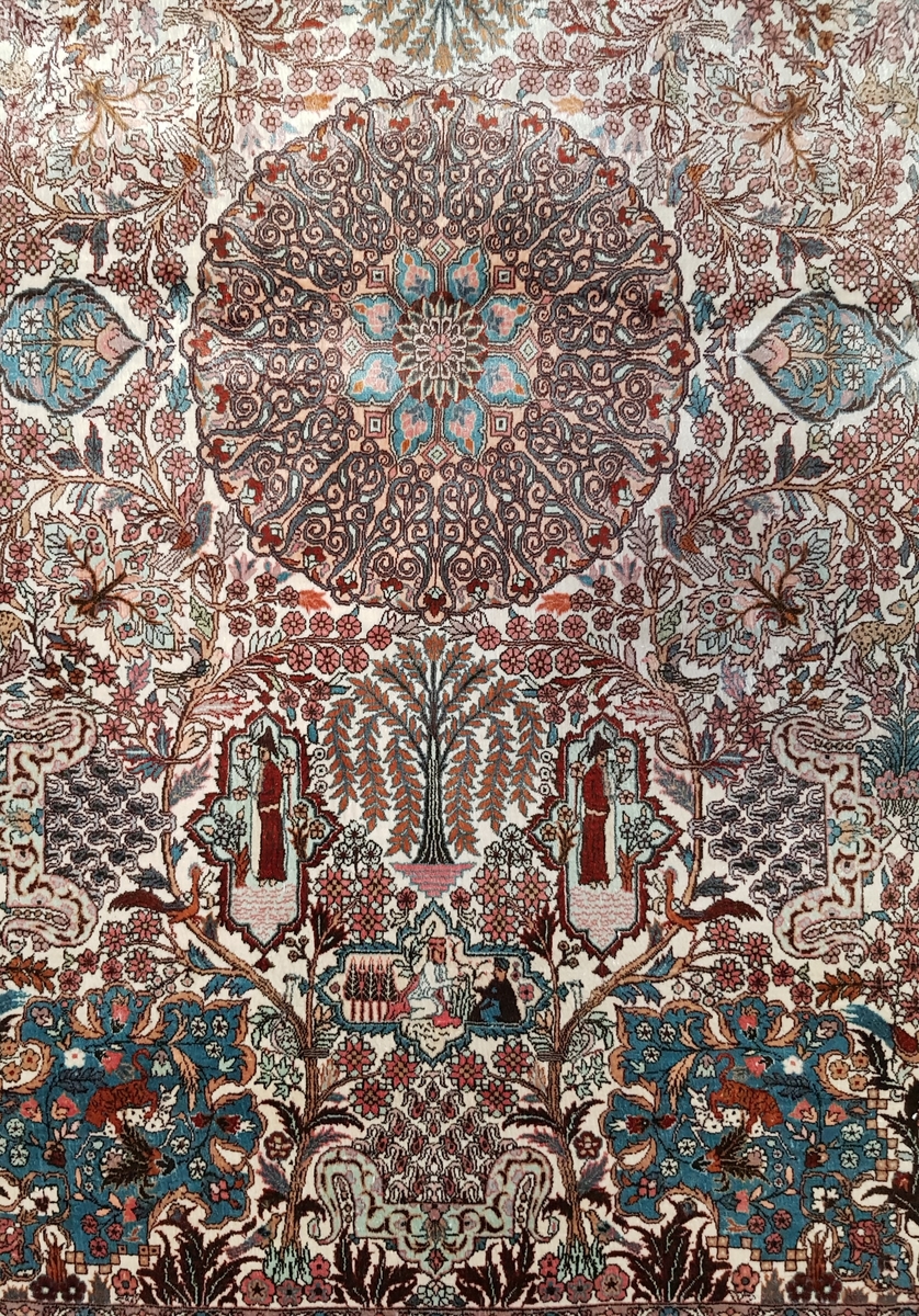 Perzisch zijden kleed uit de 20e eeuw, zeer fijn met de hand geknoopt met hoge knoopdichtheid. Het kleed toont een centraal medaillon met bloem- en arabeskmotieven, omgeven door figuratieve voorstellingen met menselijke figuren, bomen en dieren. De kleuren rood, blauw en turquoise overheersen, met rijk gedecoreerde randen en franjes aan beide uiteinden. Wil je dit kleed in het echt bekijken? Kom naar de kijkdagen op 29, 30 en 31 augustus! |