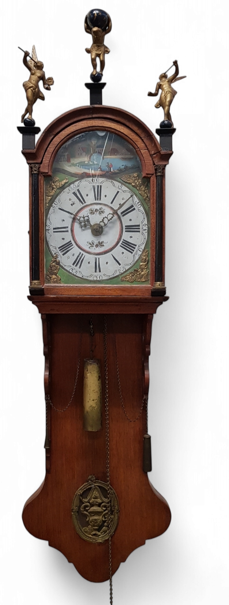 Friese staartklok, circa 1900, in hout en messing, met beschilderde wijzerplaat waarop de vierjaargetijden zijn afgebeeld. De bekroning toont Atlas met wereldbol en tweemaal de faam met trompet. Kenmerkend zijn de vergulde hoekornamenten rond de wijzerplaat, de klassiek vormgegeven kast en het cilindervormige messing gewicht aan ketting. Registreer nu en bied eenvoudig online mee op deze klok! |